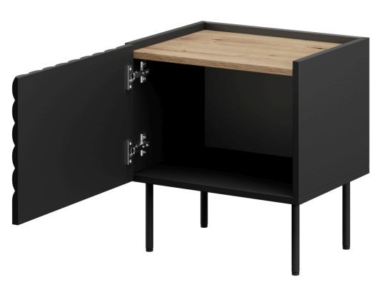 Die Kombination aus tiefem Schwarz und dem warmen Eichen-Dekor Artisan macht das Nachttisch-Set Onda zu einer passenden Ergänzung für sowohl moderne, minimalistische als auch klassisch eingerichtete Schlafzimmer. Schwarz sorgt für Eleganz, während der Holzton Wärme und Natürlichkeit vermittelt. Dank der ausgewogenen Form und der neutralen Farben lässt sich das Set leicht mit anderen Möbelstücken kombinieren – von Betten und Kleiderschränken bis hin zu dekorativen Accessoires.