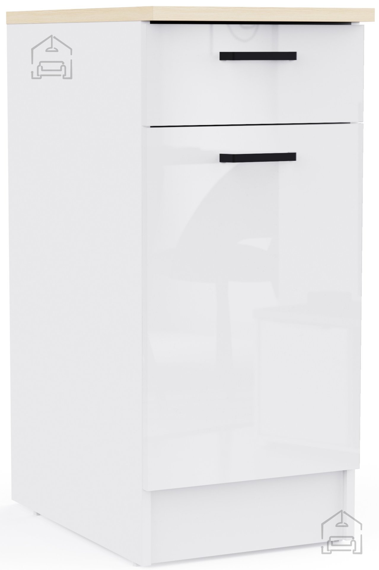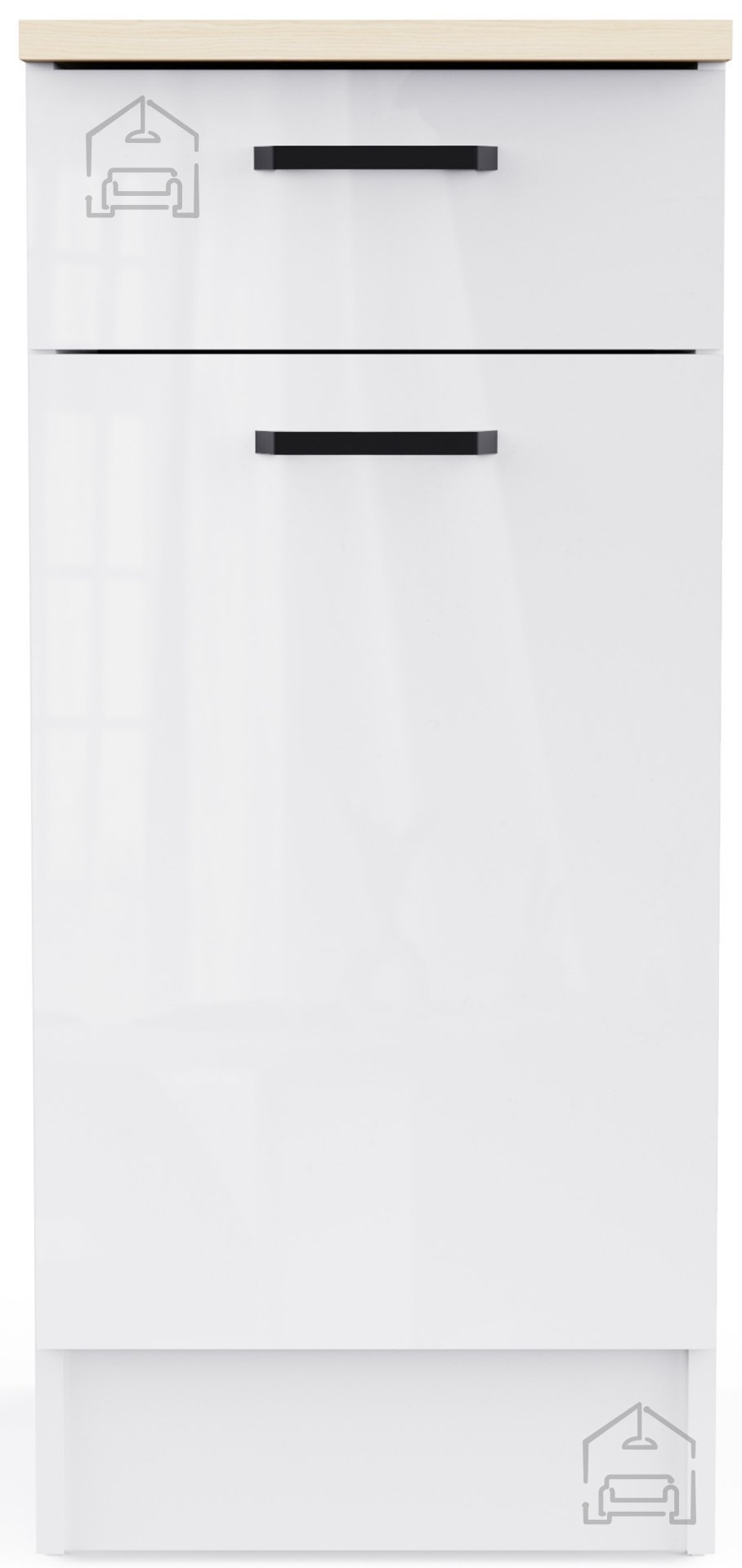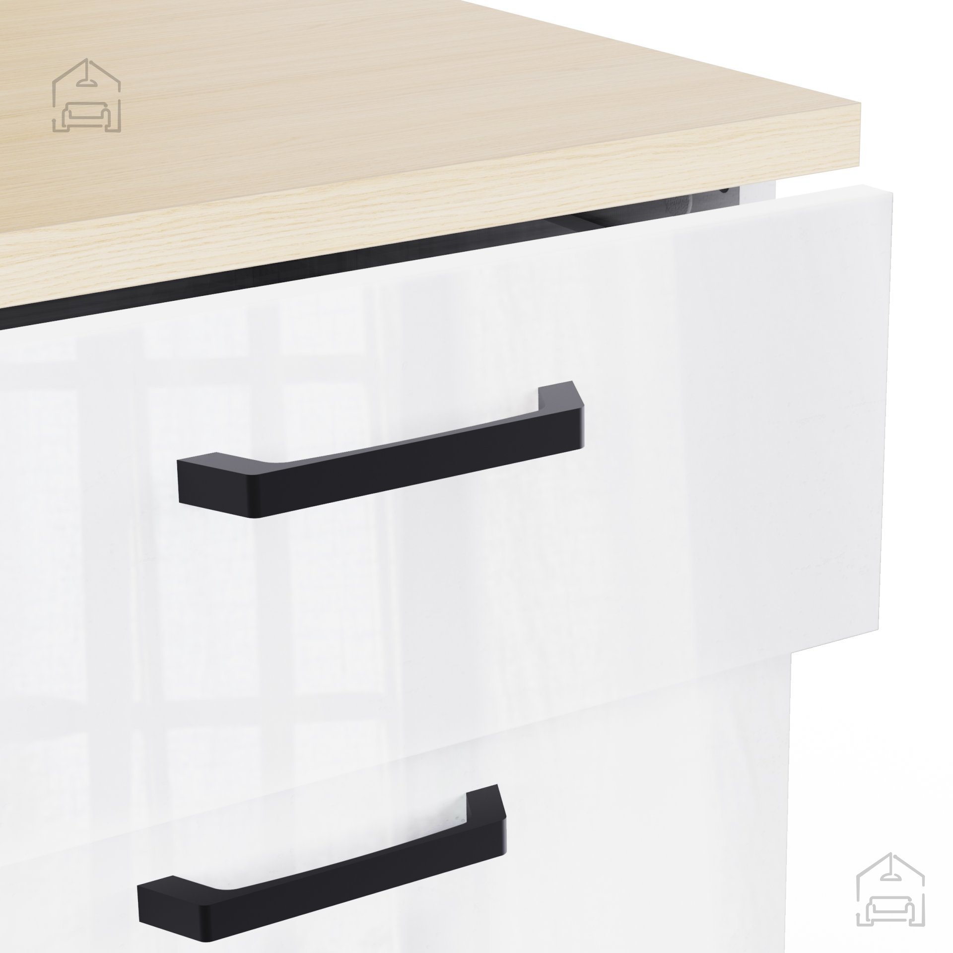 Der Korpus des Schranks besteht aus hochwertigem Spanplattenmaterial, das Stabilität und Langlebigkeit im Alltag gewährleistet. Die Oberfläche ist mit einer melaminbeschichteten Schicht versehen, die vor Feuchtigkeit, Hitze und Abnutzung schützt. Die Seiten sind in mattem Weiß gehalten und lassen sich dezent mit verschiedensten Farbkombinationen in der Küche kombinieren. Die Front ist mit einem weißen Hochglanzlack versehen, der das Licht reflektiert und dem Raum eine moderne, helle Atmosphäre verleiht. Diese Oberfläche ist pflegeleicht und behält ihren Glanz über viele Jahre hinweg.