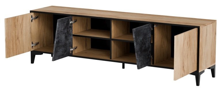 Die TV-Kommode Ovo der Marke Halmar ist eine moderne Lösung für Wohnzimmer, in denen sich Design und Funktionalität perfekt ergänzen. Mit den Maßen 180x38x53 cm bietet sie ausreichend Platz für Fernseher mit größerer Bildschirmdiagonale. Durch die durchdachte Aufteilung der Fächer lassen sich Zubehör, Medien oder dekorative Gegenstände ordentlich verstauen. Die Farbkombination aus dunklem Beton / Eiche Antik sorgt für einen markanten optischen Eindruck und passt wunderbar zu verschiedensten Einrichtungsstilen – von industriell bis hin zu modern-minimalistisch.