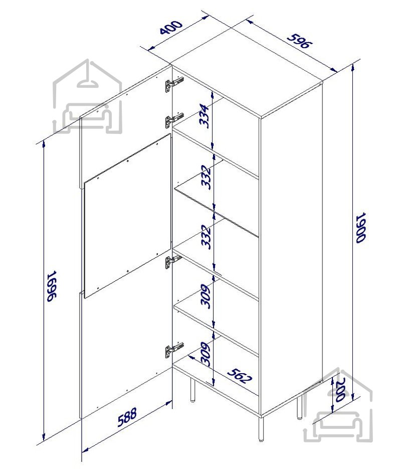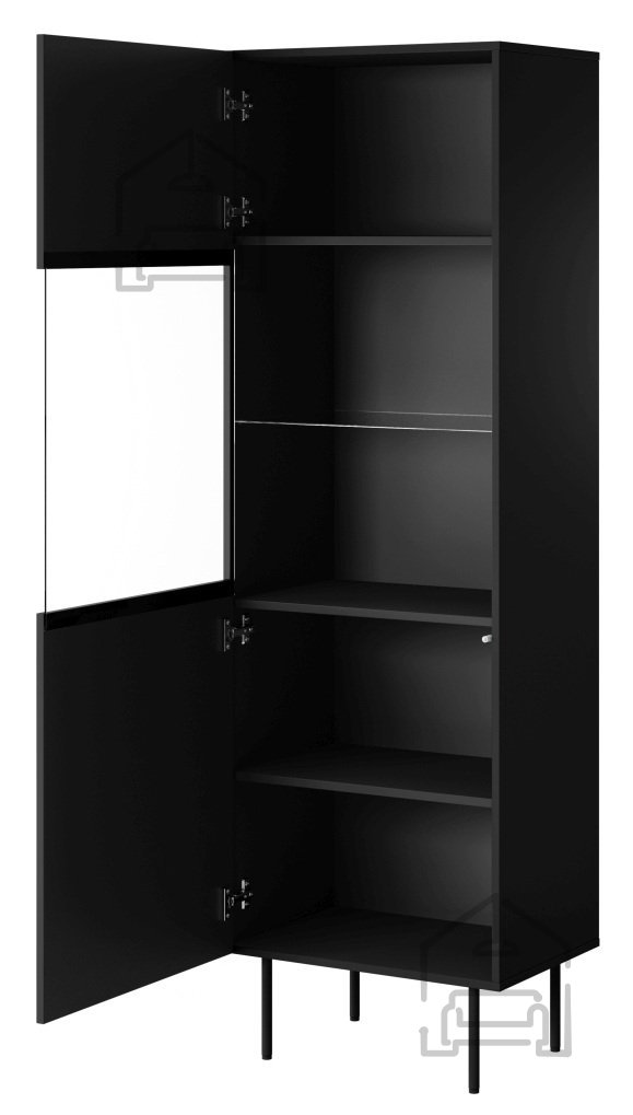 Die Vitrine steht auf schwarzen Metallbeinen mit einer Höhe von 20 cm. Diese Konstruktion erleichtert das Reinigen des Bodens unter dem Möbelstück und verleiht dem Design eine gewisse Leichtigkeit. Die Metallbeine sorgen zudem für Stabilität – ein wichtiger Aspekt bei hohen Möbelstücken. Anstelle klassischer Griffe setzt Halmar auf das moderne PUSH-CLICK-System, das das Öffnen der Türen durch leichtes Drücken ermöglicht. Der Mechanismus arbeitet leise und geschmeidig, was den Bedienkomfort erhöht und das minimalistische Erscheinungsbild ohne sichtbare Griffe unterstreicht.