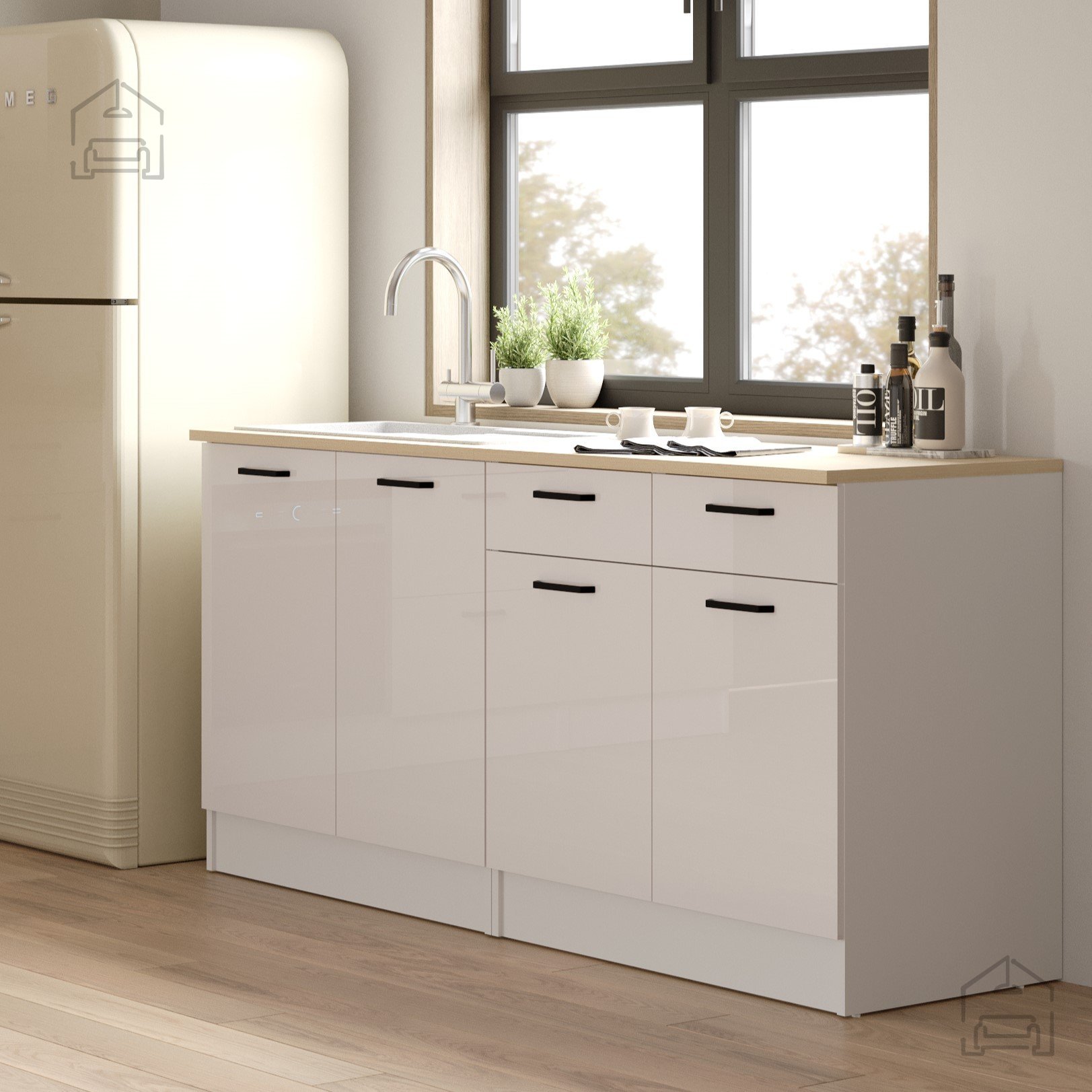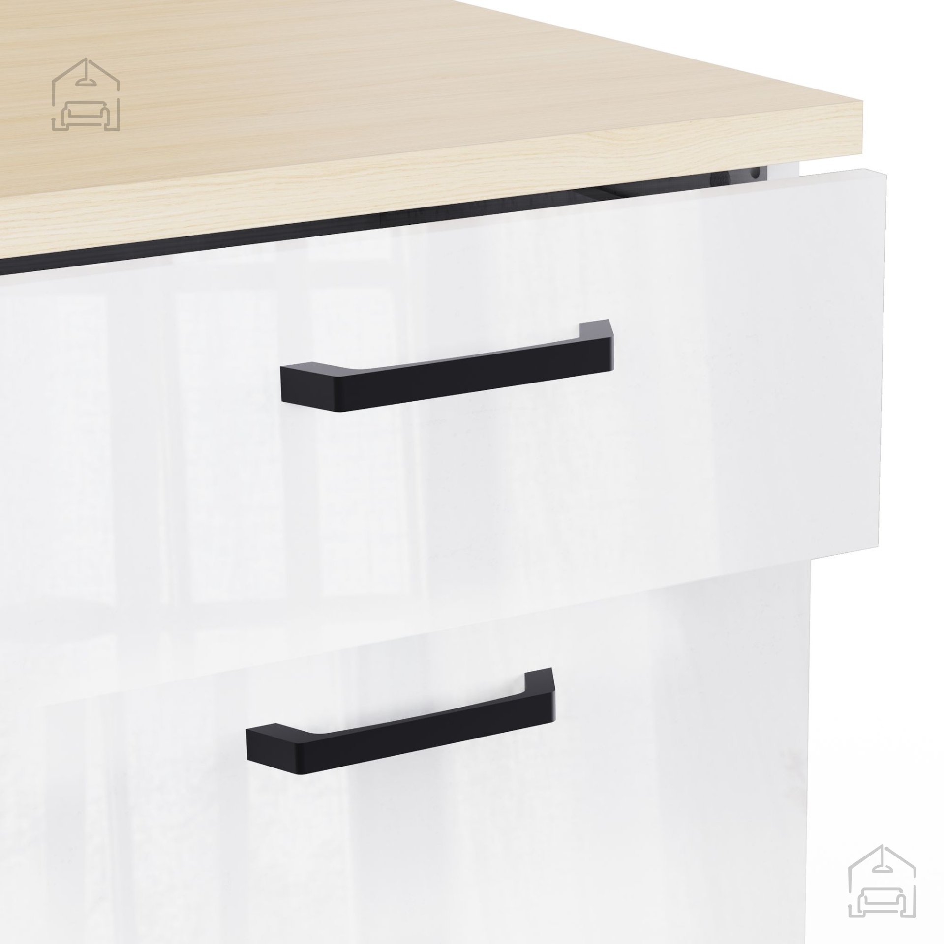 Der Korpus besteht aus 16 mm starker Spanplatte mit einer Melaminbeschichtung, die die Oberfläche zuverlässig vor Kratzern, Feuchtigkeit und Hitze schützt. Die Seiten sind mattweiß, während die Fronten mit einem hochglänzenden Lack versehen sind, der das Licht reflektiert und den Raum größer wirken lässt. Die 22 mm starke Arbeitsplatte aus melaminbeschichteter Platte in Eichenoptik bildet einen schönen Kontrast zwischen der Wärme des Holzes und der Klarheit des Weiß.
