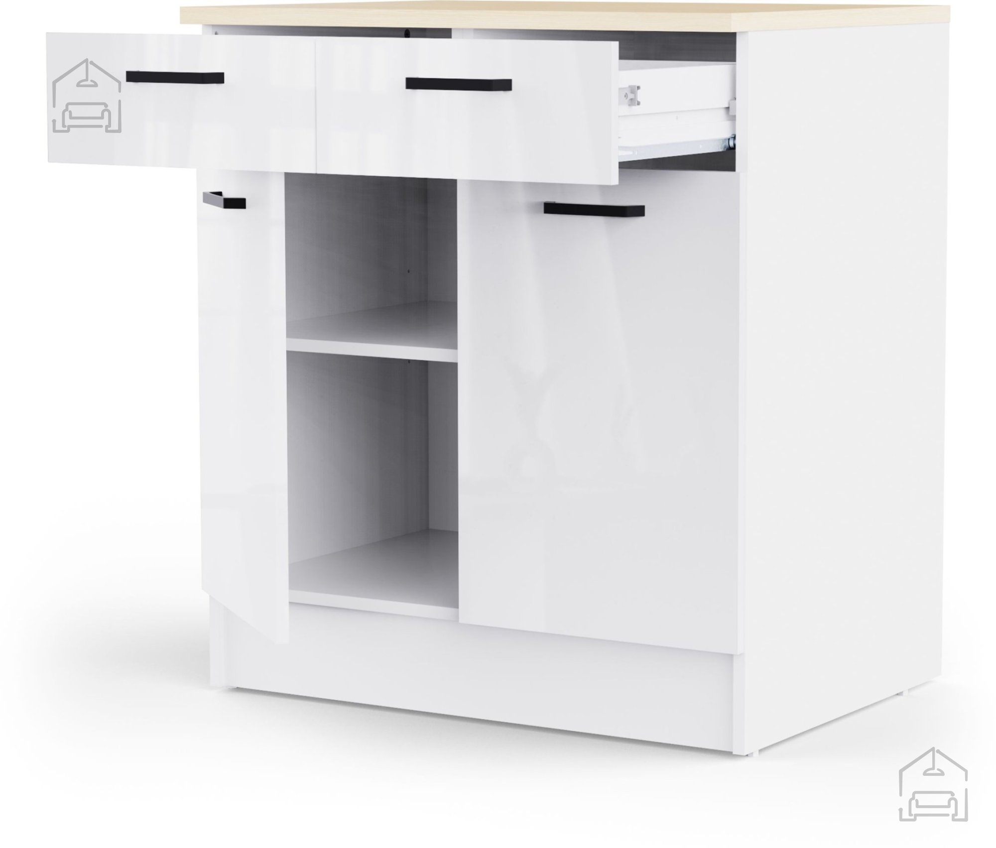 Unter den Schubladen befindet sich ein Schrank mit Doppeltüren, die auf klassischen Scharnieren montiert sind. Im Inneren befindet sich ein Einlegeboden mit den ungefähren Maßen 77x50 cm. Dieser lässt sich auf drei verschiedene Höhen verstellen, sodass der Stauraum individuell an die Größe der Küchenutensilien angepasst werden kann. So schaffen Sie ganz einfach Platz für Töpfe, Schüsseln, Geräte oder Serviergeschirr.