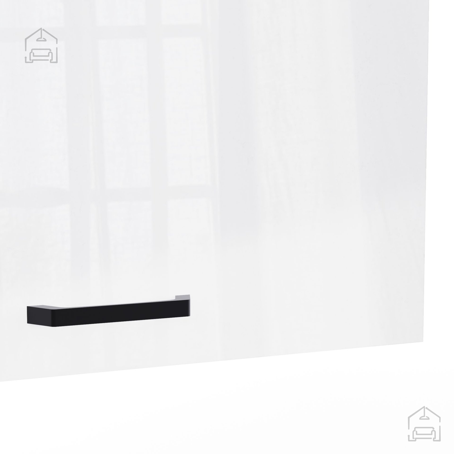 Die Tür ist auf Metallscharnieren montiert und mit einem Dämpfmechanismus für sanftes Schließen ausgestattet. Dieses System verhindert lautes Zuschlagen und verlängert die Lebensdauer des Schranks, während es gleichzeitig eine angenehme, leise Bedienung ermöglicht. Der schwarze Aluminiumgriff setzt einen dezenten Akzent zur glänzend weißen Front und unterstreicht das moderne Design. Die Tür kann wahlweise links oder rechts angeschlagen werden – so lässt sich der Schrank perfekt an die individuelle Küchenplanung anpassen.
