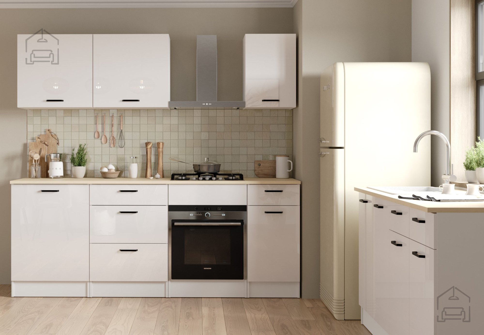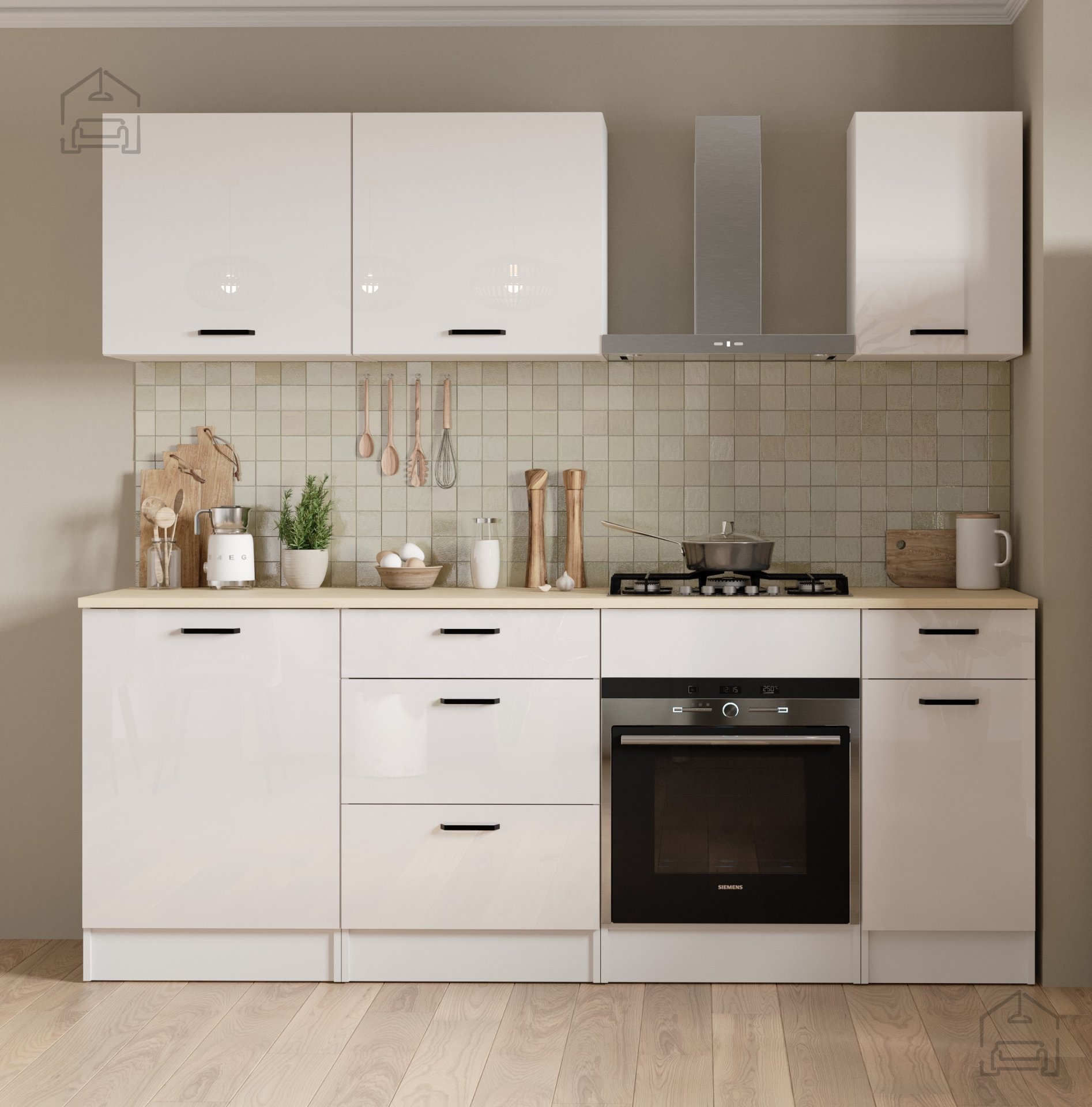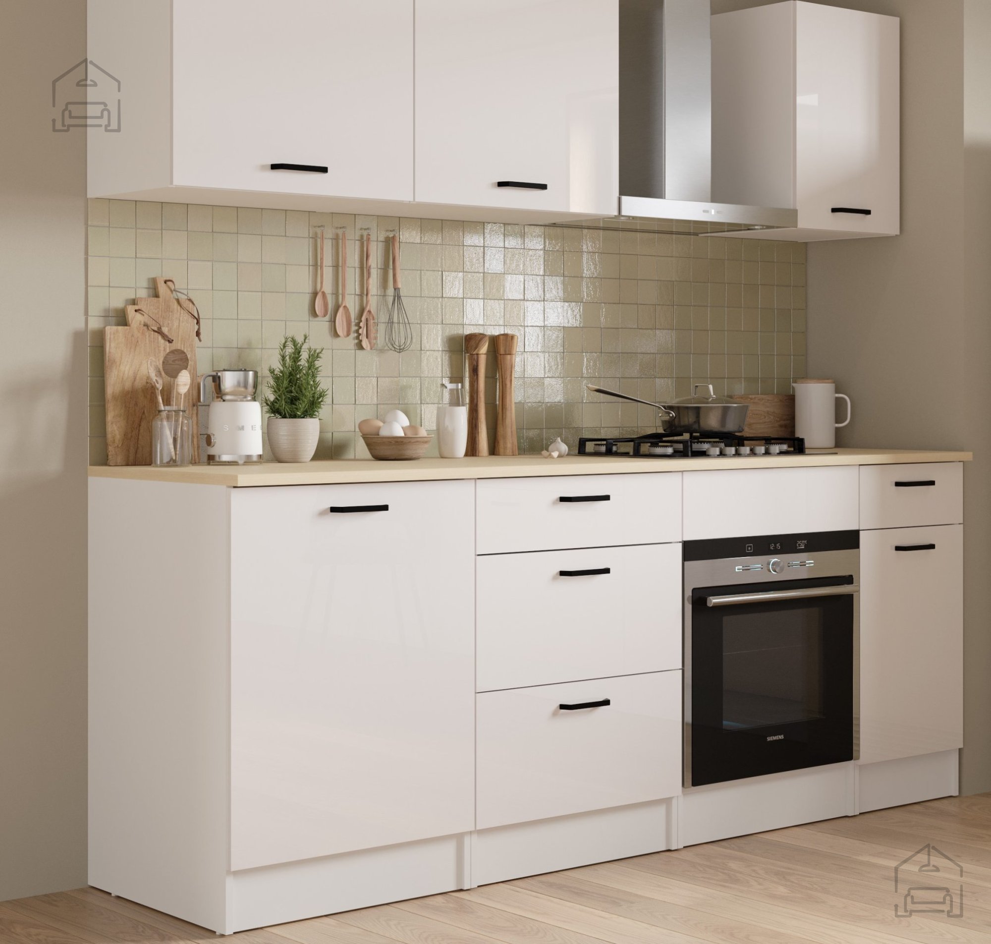 Der Korpus besteht aus Spanplatte, einem beliebten Material für modernes Mobiliar, das mit einer Melaminbeschichtung versehen ist, um es vor Feuchtigkeit, Hitze und Kratzern zu schützen. Diese Oberfläche lässt sich leicht reinigen und behält über viele Jahre hinweg ihr gepflegtes Aussehen. Der hochglänzende Weißton unterstreicht die elegante Wirkung und lässt sich mühelos mit anderen Küchenelementen in ähnlichen oder kontrastierenden Farben kombinieren. Durch die lichtreflektierende Oberfläche wirkt der Raum frischer und optisch weiter.