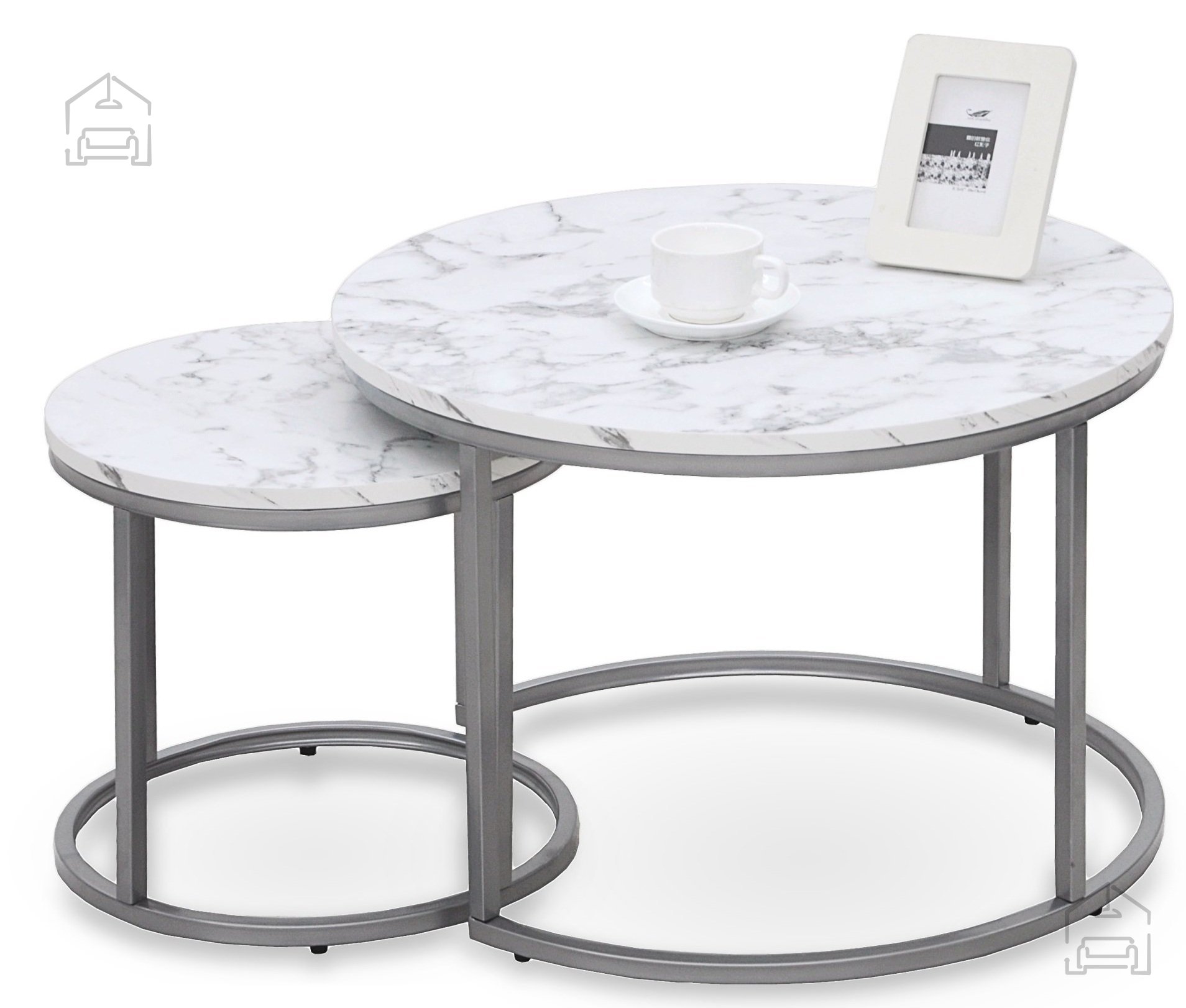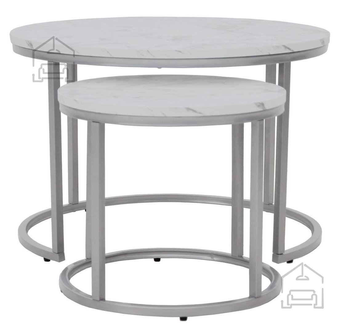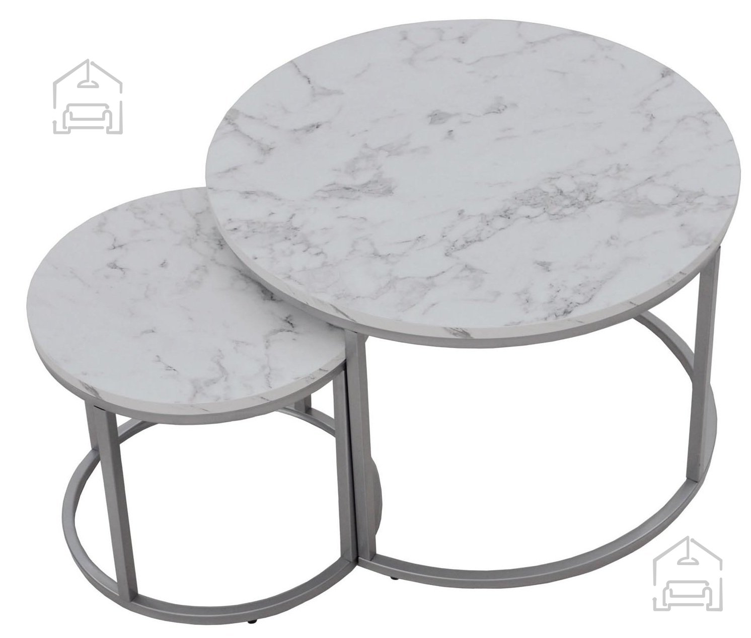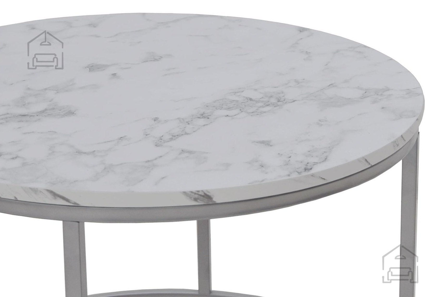 Die Ausführung in schwarzer Marmoroptik und silbernem Metall verleiht den Tischen einen modernen und zugleich zeitlosen Charakter. Das Marmordekor sorgt für eine edle und natürliche Ausstrahlung, während das Metallgestell einen dezenten industriellen Touch und eine optische Leichtigkeit einbringt. Diese harmonische Kombination lässt sich leicht mit verschiedensten Möbeln kombinieren – egal ob in einem modernen, skandinavischen oder klassischen Einrichtungsstil.