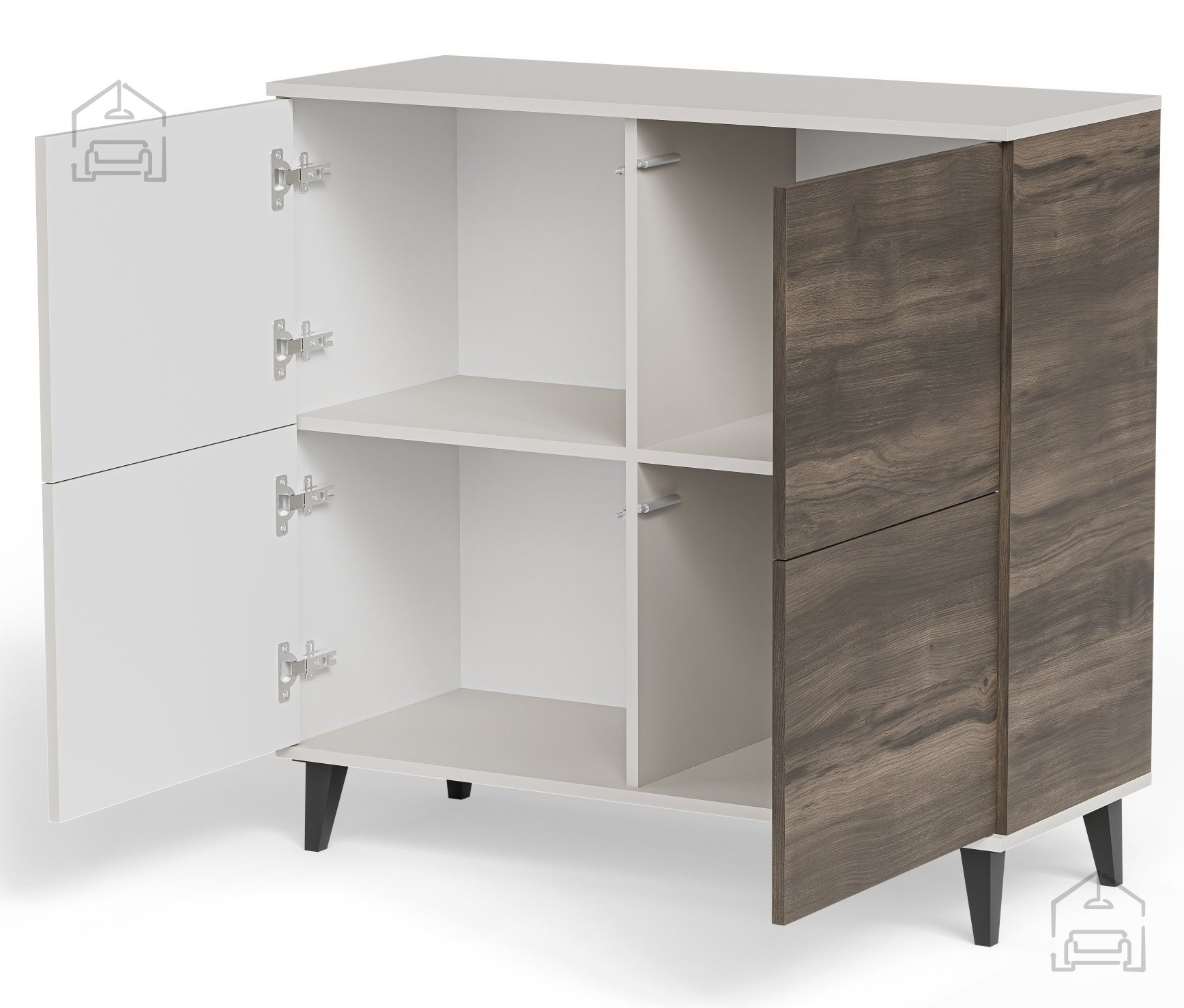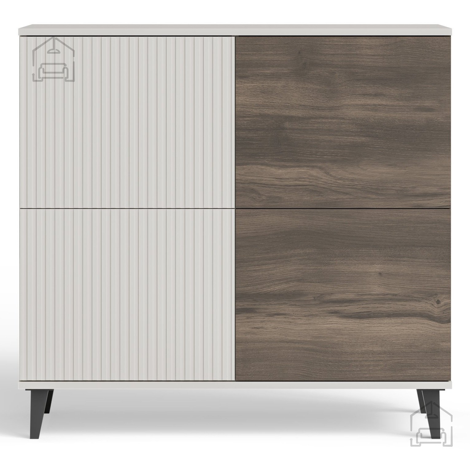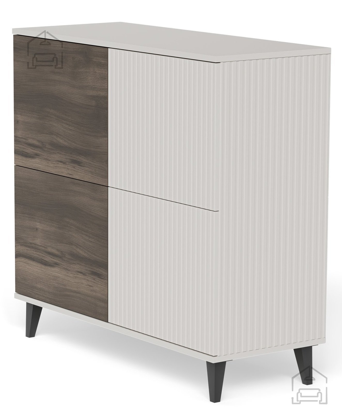 Die Kommode besteht aus veredeltem MDF und beschichteter Spanplatte, die eine glatte Oberfläche, hohe Widerstandsfähigkeit und einfache Pflege gewährleisten. Zusätzliche Elemente aus Polypropylen tragen zur Stabilität und Langlebigkeit bei. Die Oberfläche ist so behandelt, dass sie auch bei täglichem Gebrauch ihr ansprechendes Aussehen behält. Diese Materialkombination macht die Kommode leicht, aber dennoch stabil genug, um verschiedenste Gegenstände aufzunehmen.