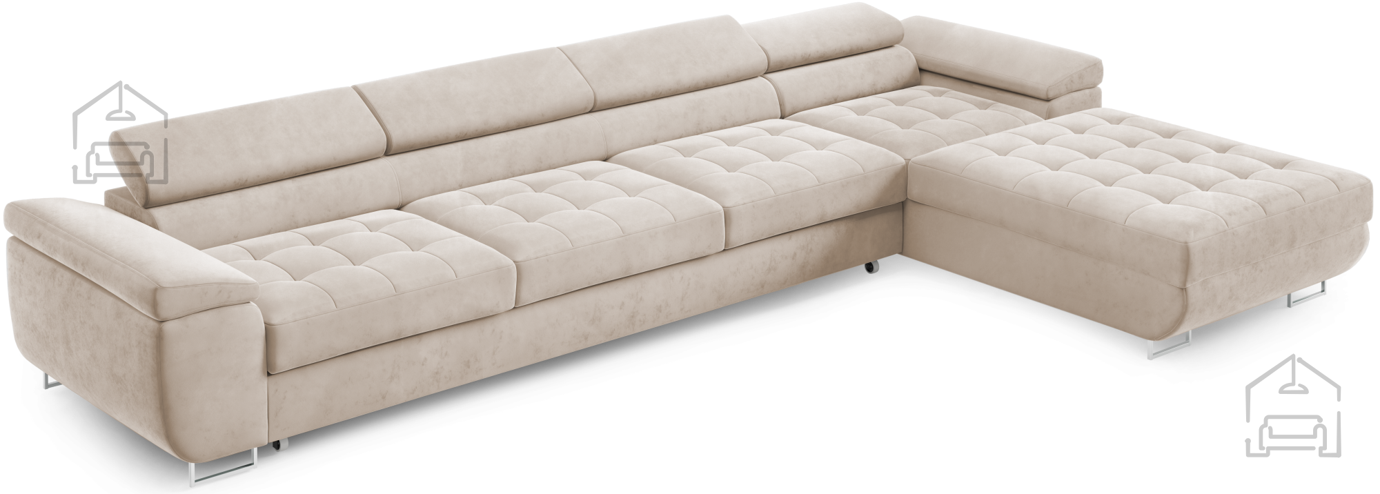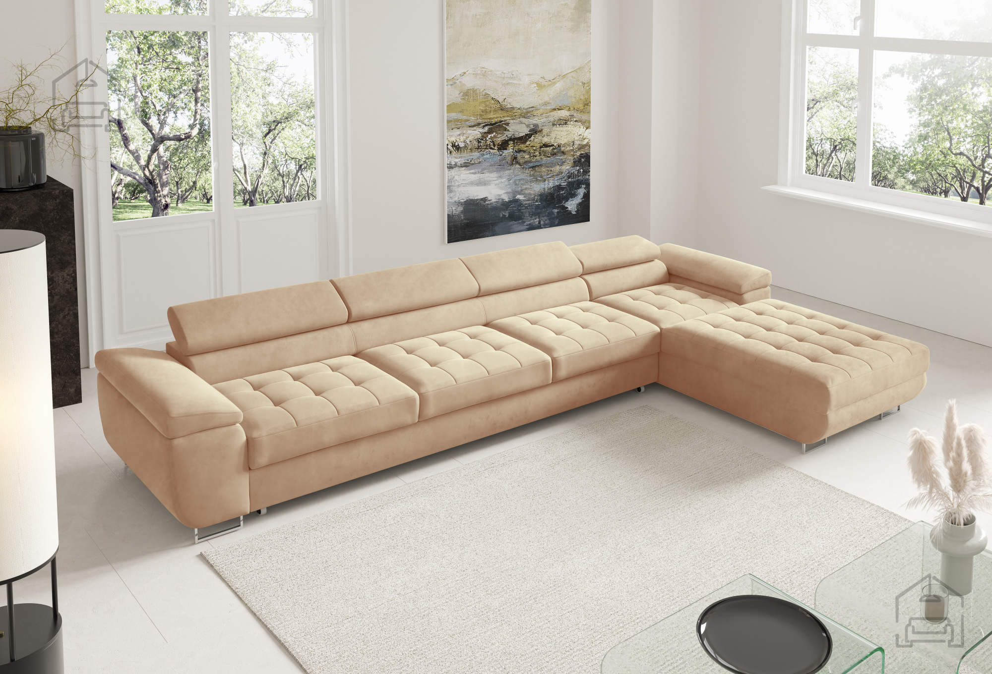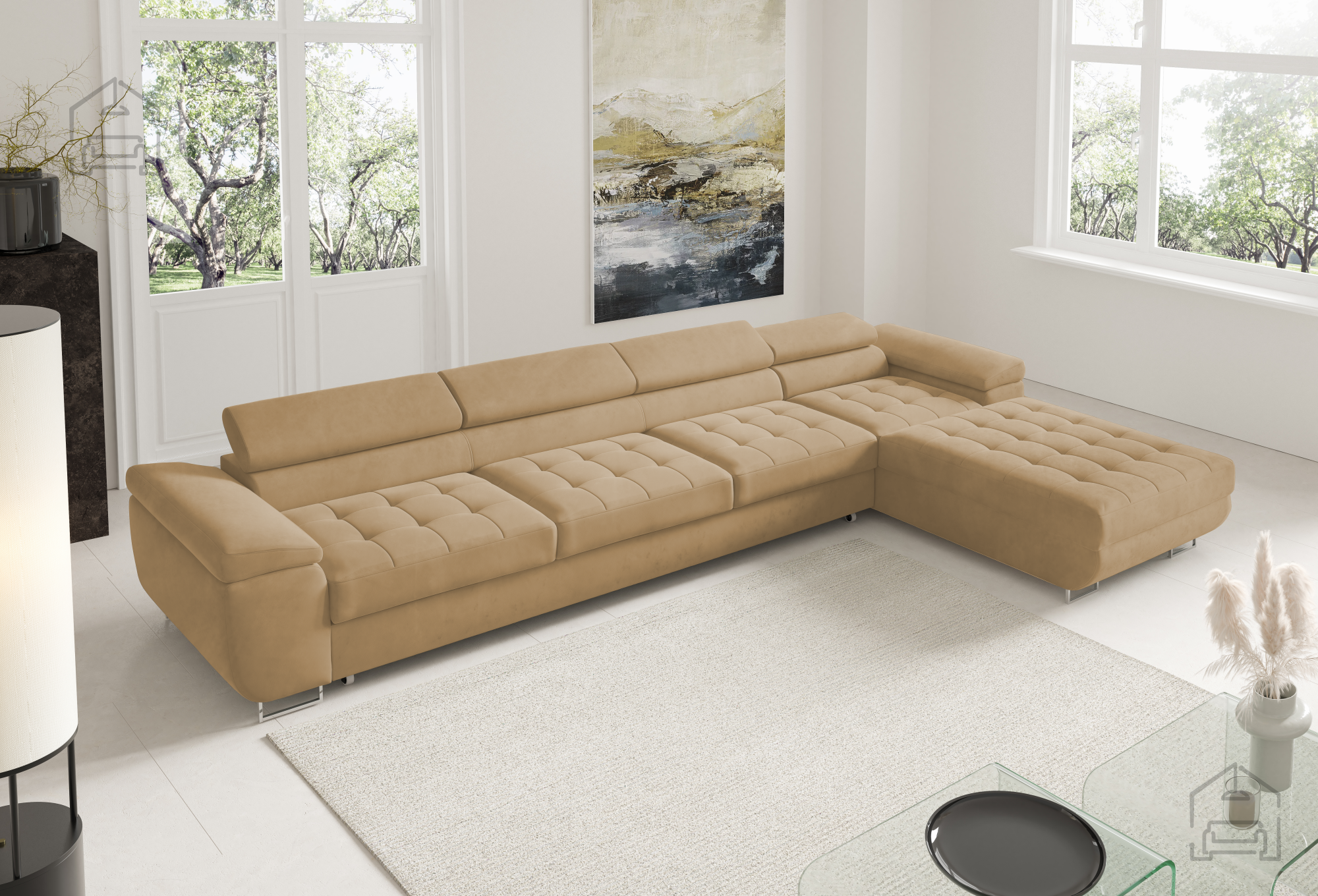 Die Eckgarnitur Benjamin 155 XL vereint modernes Design mit dem Komfort, den man sich von hochwertigen Möbeln erwartet. Hergestellt wird sie in der polnischen Manufaktur PKMebel, wo präzise Verarbeitung, langlebige Materialien und bewährte Mechanismen zusammentreffen. Sie ist ideal für großzügige Wohnzimmer, in denen Bequemlichkeit, Funktionalität und ein elegantes Erscheinungsbild im Vordergrund stehen. Mit einer Gesamtlänge von 331 cm, einer Breite von 201 cm und einer Höhe von 72 cm bietet sie ausreichend Platz zum Entspannen für mehrere Personen. Dank der praktischen Schlaffunktion lässt sie sich im Handumdrehen in eine komfortable Liegefläche von 125 × 250 cm verwandeln.