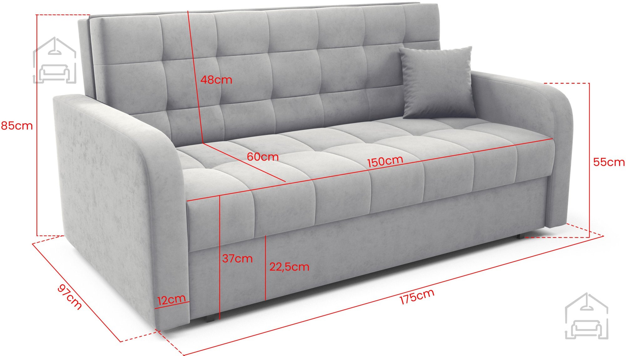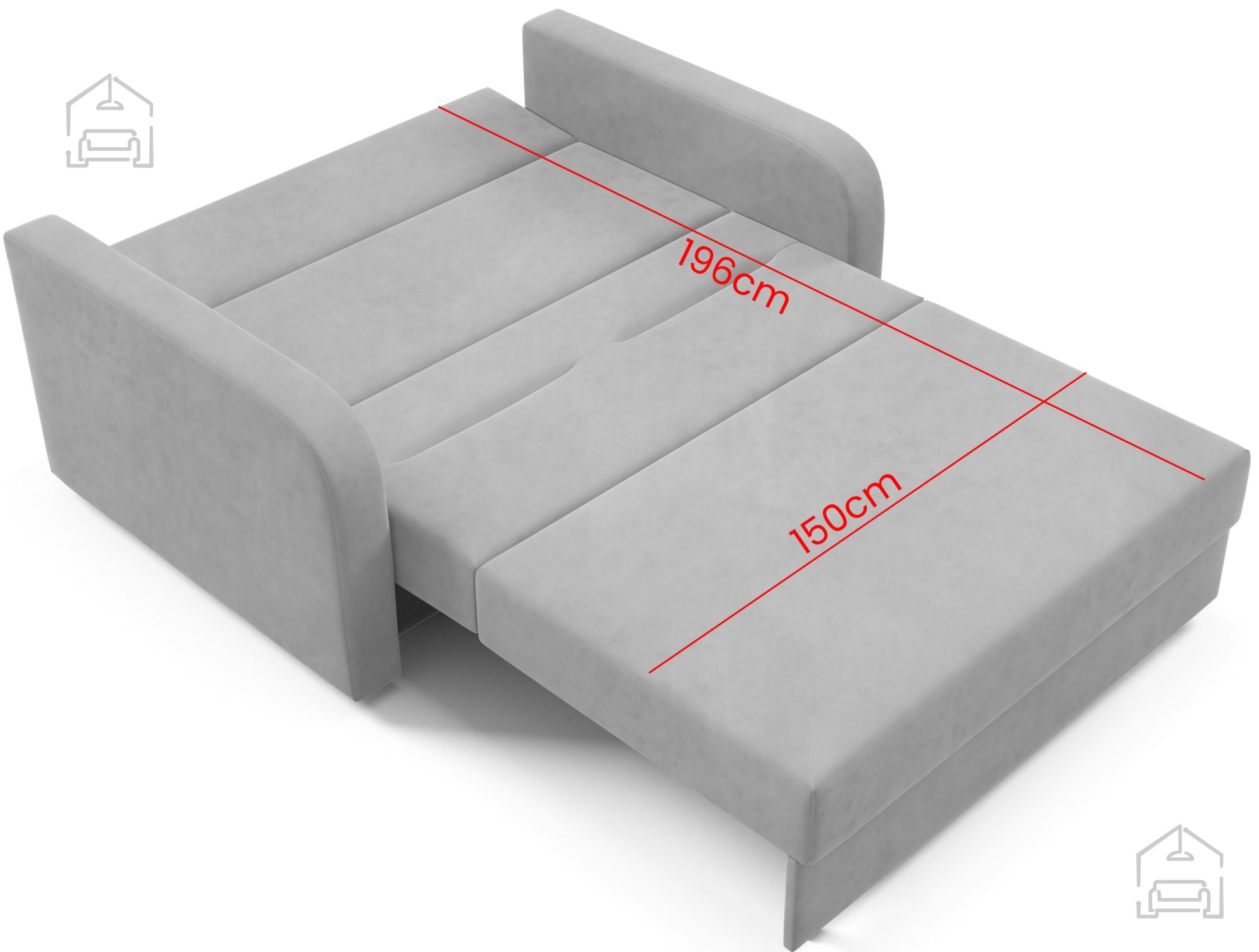 Dank dieser Maße passt das Sofa problemlos in kleinere Wohnzimmer, Kinderzimmer oder Garçonnièren. Durch das kompakte Design eignet es sich besonders für Räume mit begrenztem Platzangebot, wo jeder Zentimeter zählt. Trotz seiner kompakten Außenmaße bietet es eine überraschend große Liegefläche – vergleichbar mit einem Standard-Doppelbett.