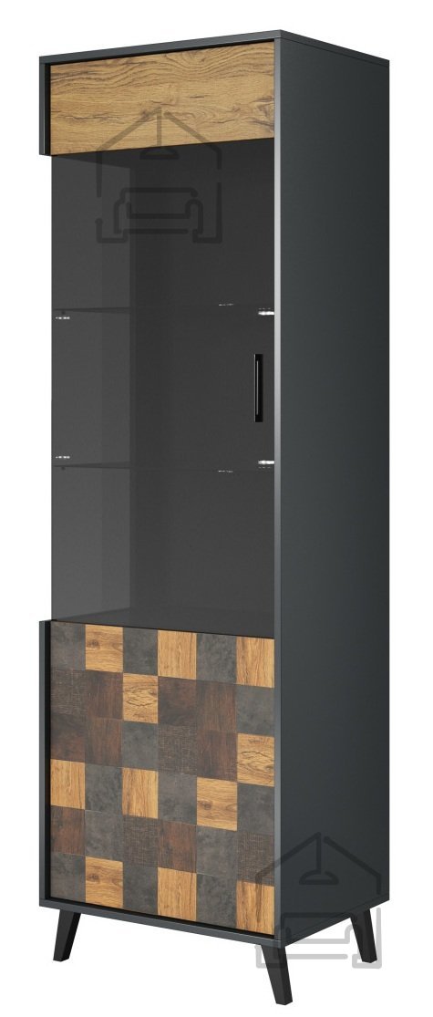 Die durchdachte Farbkombination verleiht der Vitrine Soul 1D ihren besonderen Charakter. Das anthrazitfarbene Korpus wirkt modern und elegant, während die dekorative Front dem Raum Wärme und Natürlichkeit gibt. Der schwarze Metallgriff unterstreicht die klare Linienführung und sorgt für bequemes Öffnen der Tür. Ergänzt wird das Design durch schwarze, matte Metallfüße mit einer Höhe von 12 cm, die nicht nur optisch überzeugen, sondern auch das Reinigen unter der Vitrine erleichtern.
