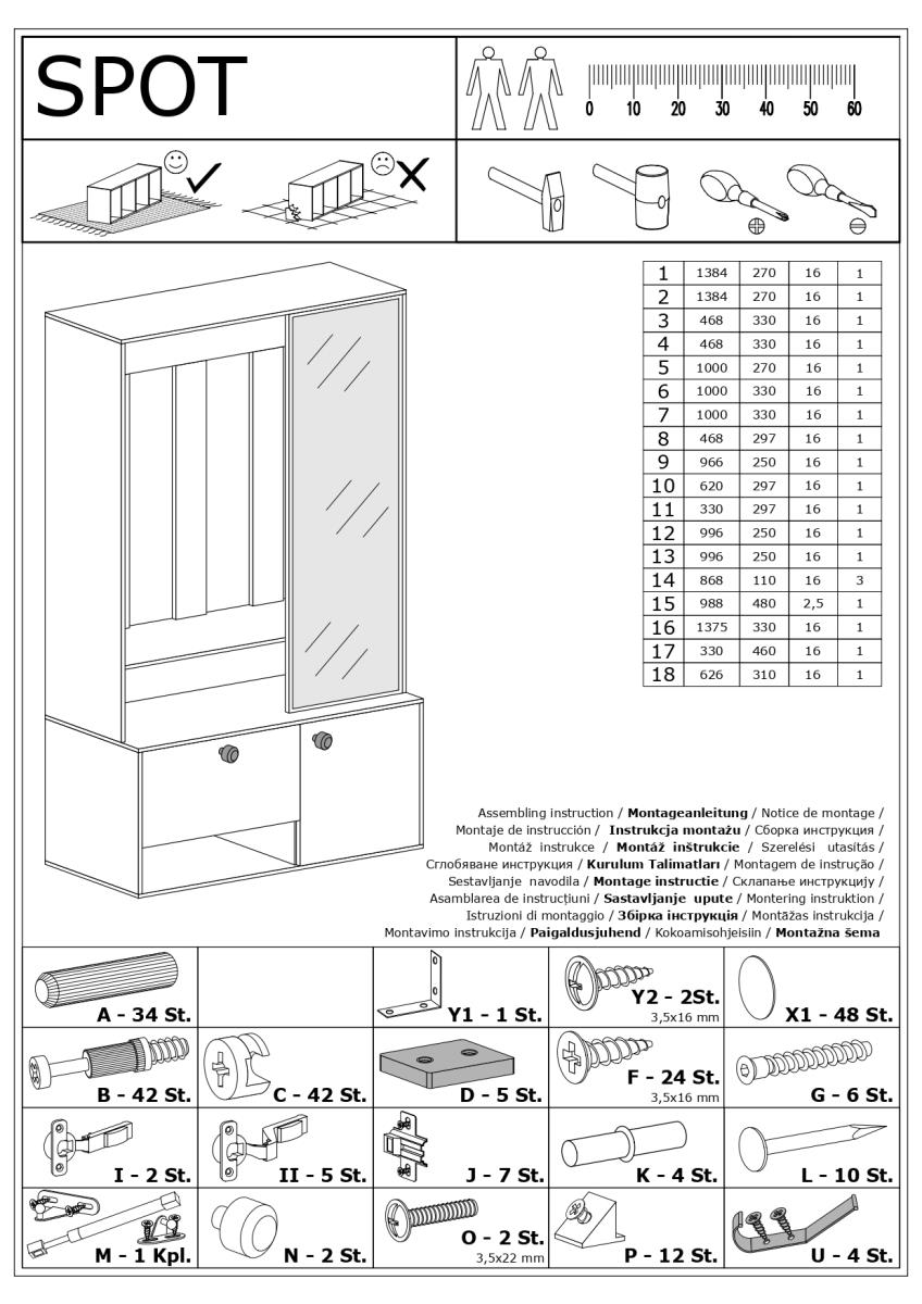 Halmar Spot ist so gestaltet, dass die tägliche Nutzung besonders angenehm ist. Die laminierte Oberfläche lässt sich leicht reinigen – meist reicht ein feuchtes Tuch mit mildem Reinigungsmittel. Dank der kompakten Maße passt das Set perfekt an die Wand des Vorzimmers und bietet dennoch ausreichend Stauraum für Kleidung und Schuhe. Die integrierte Kleiderstange sorgt für Übersicht, während die Metallgriffe einen sicheren Halt bieten. Die stabile Konstruktion und passgenaue Elemente erleichtern die Montage und gewährleisten eine sichere Verwendung.