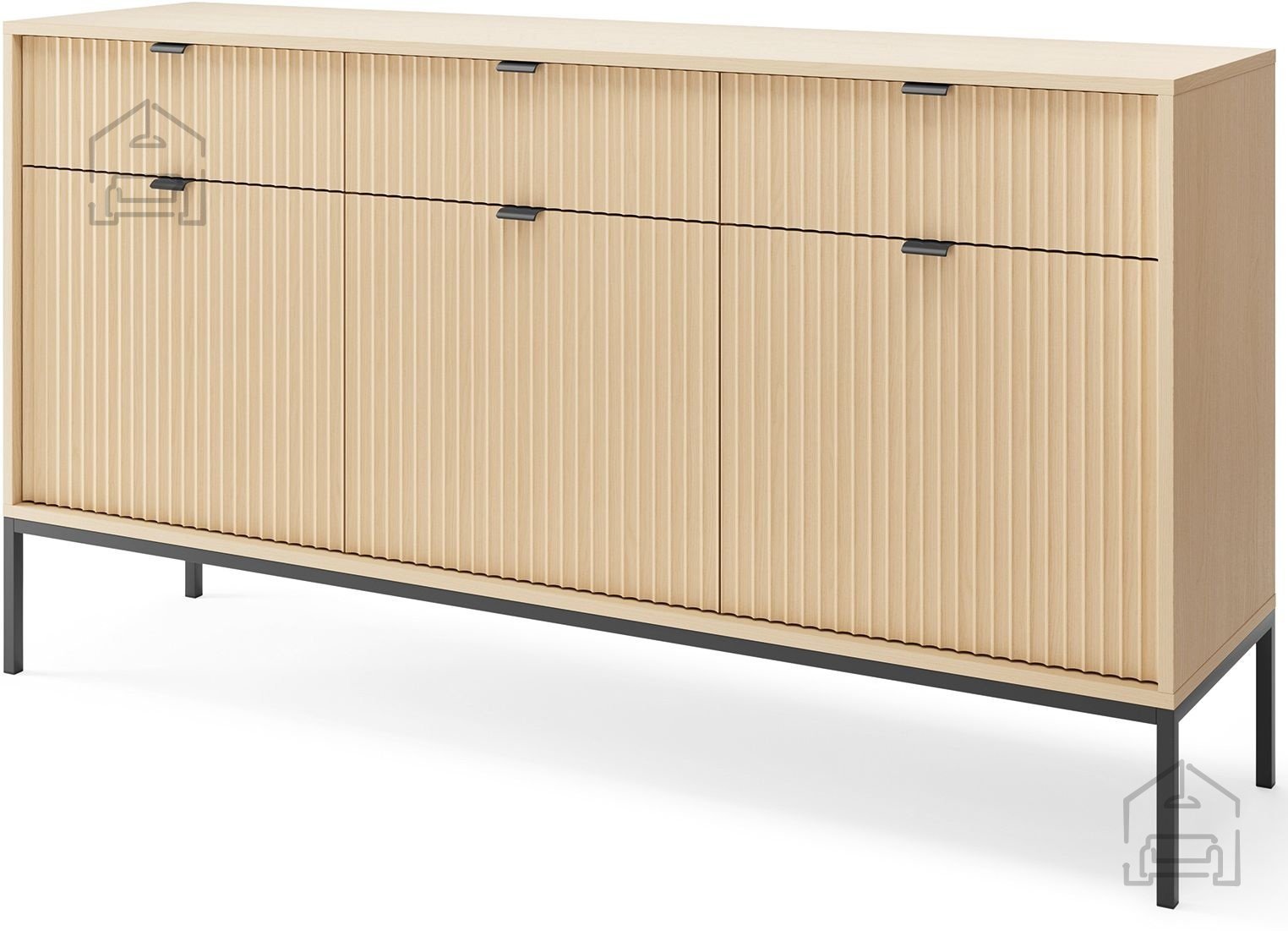 Die Kommode Nova KSZ154 in der Farbe Eiche Vicenza ist ein gelungenes Beispiel für modernes Wohndesign, das die warme Ausstrahlung natürlicher Holzoptik mit der klaren Eleganz von Metall verbindet. Gefertigt wird sie in der polnischen Möbelmanufaktur Piaski, wo handwerkliche Tradition auf moderne Produktionstechnologien trifft. Dank ihrer ausgewogenen Proportionen und gut durchdachten Funktionalität passt diese Kommode sowohl ins Wohnzimmer als auch in den Vorraum oder das Schlafzimmer. Mit den Maßen 154x39x83 cm nutzt sie den vorhandenen Platz optimal, ohne zu wuchtig zu wirken.