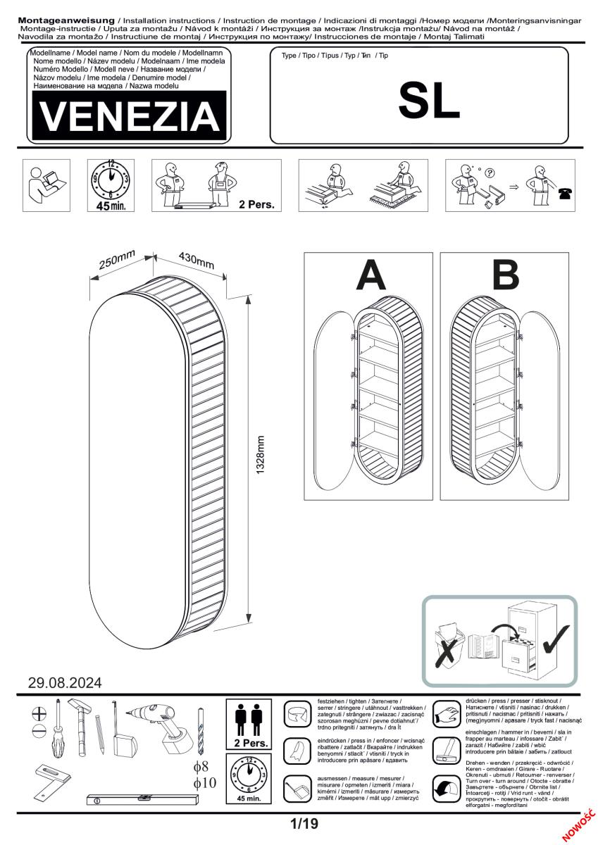 Der Venezia 1D verfügt über verstellbare Wandhalterungen, mit denen sich Höhe und Position leicht an den verfügbaren Platz oder die gewünschte Nutzung anpassen lassen. Die Wandmontage ist unkompliziert und sicher, wodurch sich der Schrank auch in kleineren Badezimmern rasch installieren lässt. Dank seiner kompakten Bauweise und der Möglichkeit zur individuellen Anpassung passt er sowohl in moderne als auch in klassisch gestaltete Badumgebungen.