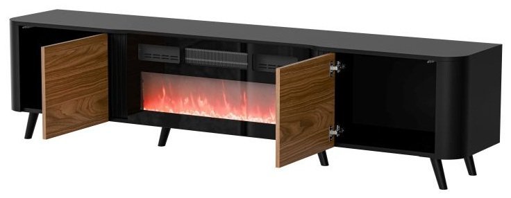 Ein besonderes Merkmal des Modells Volare 200 EF ist die Möglichkeit, einen Kamin zu integrieren. Der Kamin wird separat bestellt, die Kommode ist jedoch bereits für die einfache Installation vorbereitet. So lässt sich ein gemütliches Ambiente schaffen – ganz ohne bauliche Veränderungen oder Schornstein. Ein eingebauter Elektrokamin sorgt für angenehme Wärme und einen schönen Lichteffekt, der die Kombination aus Schwarz und Nussbaum zusätzlich hervorhebt.