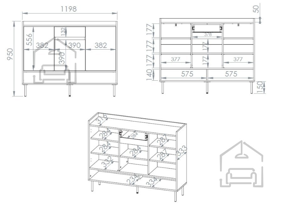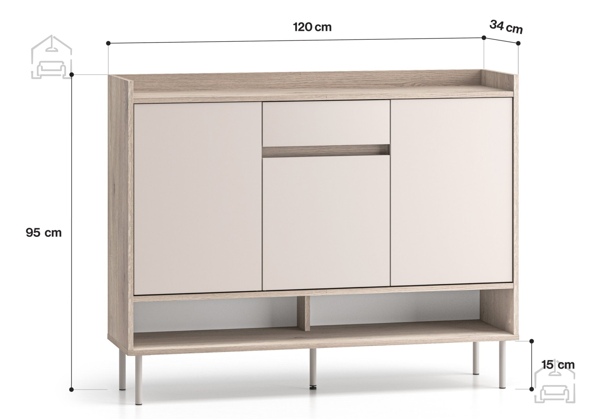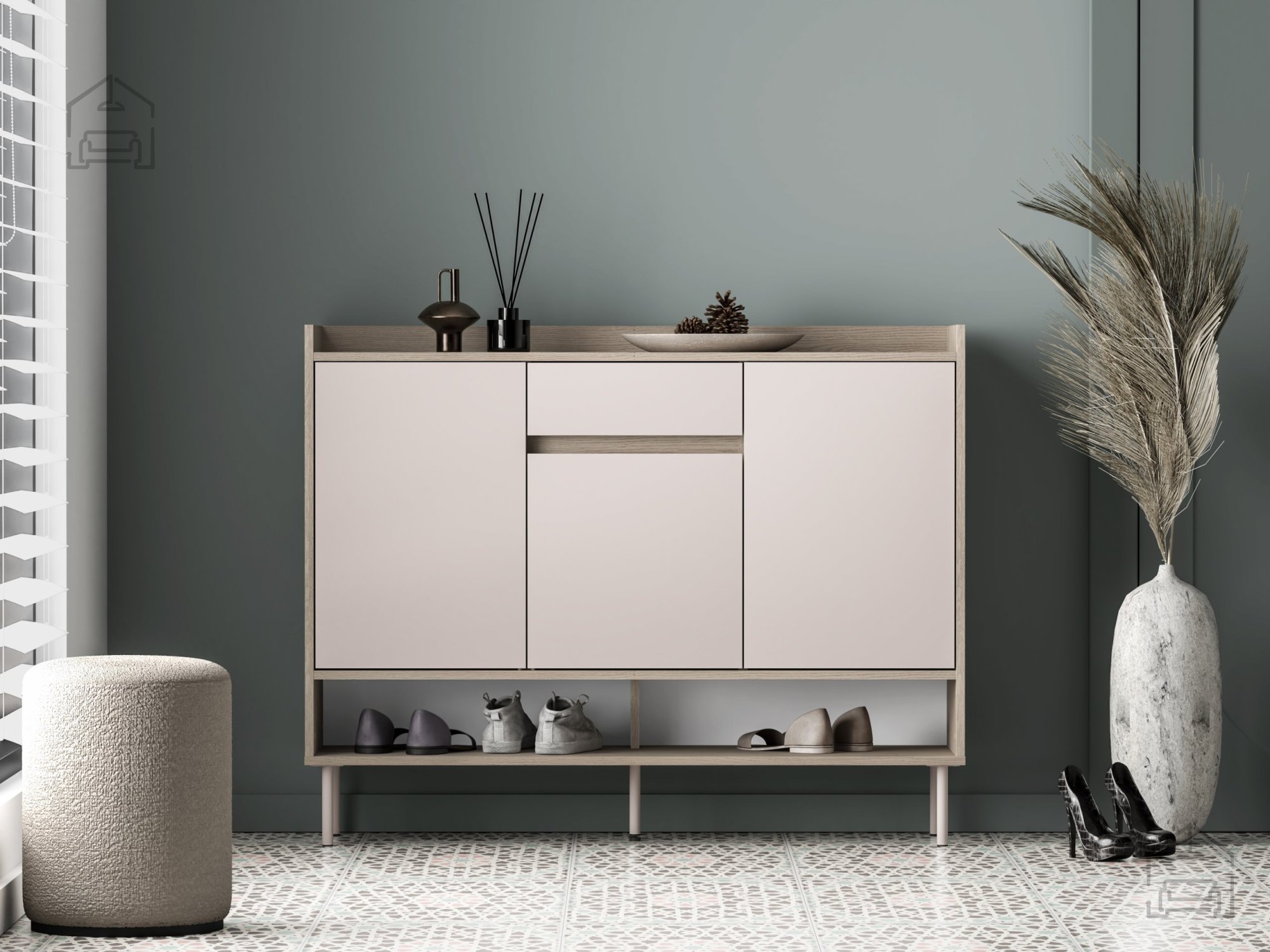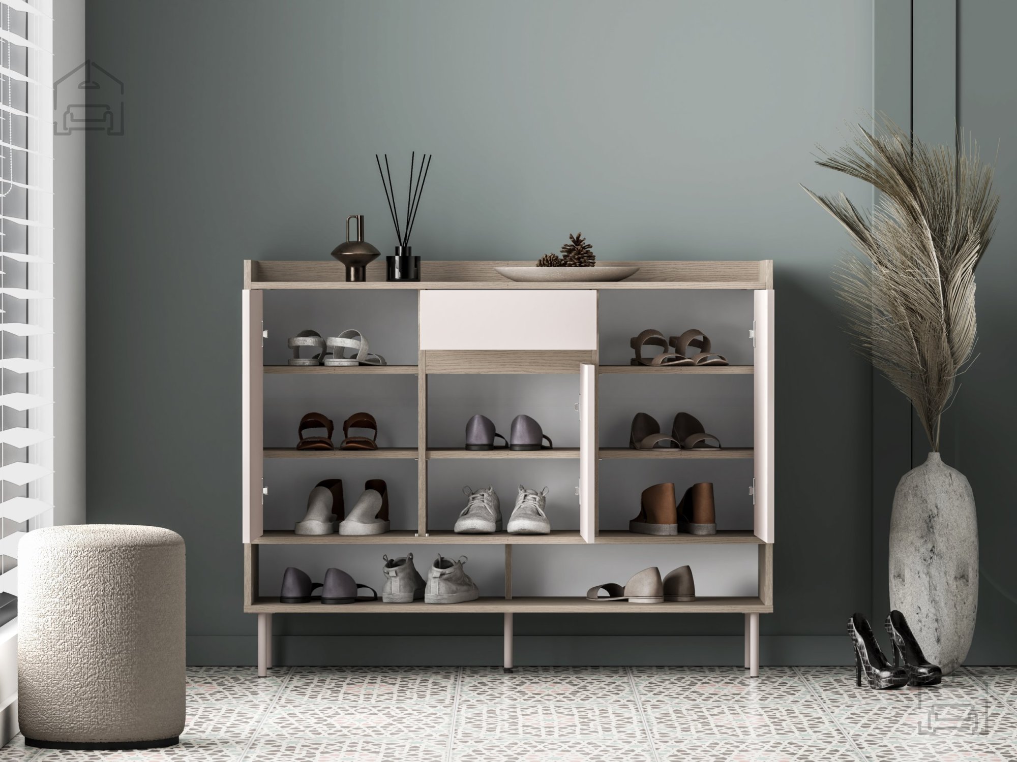 Mit den Maßen 120x34x95 cm bietet der Schuhschrank Voco 02 ein ideales Verhältnis zwischen Stauraum und kompakter Größe. Dank seiner Breite finden mehrere Paar Schuhe bequem Platz, ohne dass der Schrank zu viel Raum einnimmt. Drei gleichmäßig angeordnete Fächer sorgen für eine übersichtliche Aufbewahrung – von Alltagsschuhen bis hin zu eleganten Modellen für besondere Anlässe.