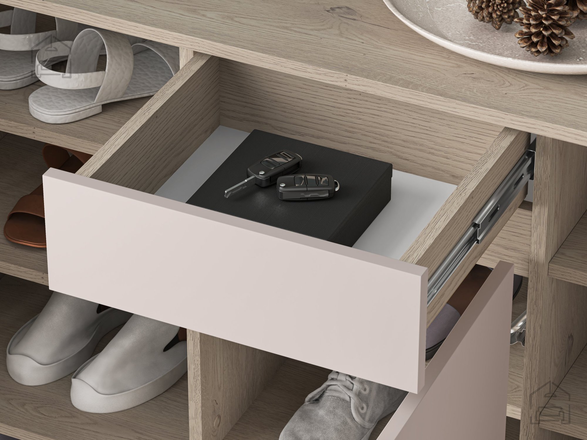 Das Modell ist mit 3 Türen ausgestattet, die sich über praktische Griffe öffnen lassen. Der Soft-Close-Mechanismus ermöglicht ein leises und angenehmes Schließen – besonders vorteilhaft in Wohnungen, in denen sich der Vorraum in der Nähe des Wohnbereichs befindet. Zudem gewährleisten die Kugelführungen ein sanftes und langlebiges Öffnen und Schließen der Türen und Laden.
