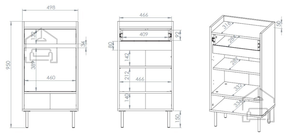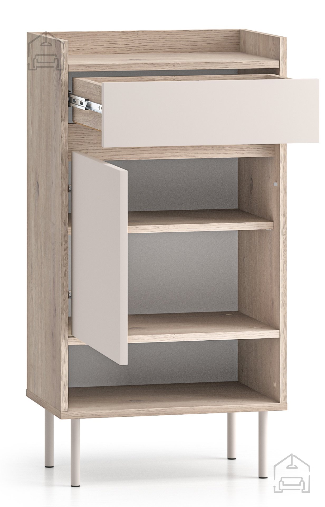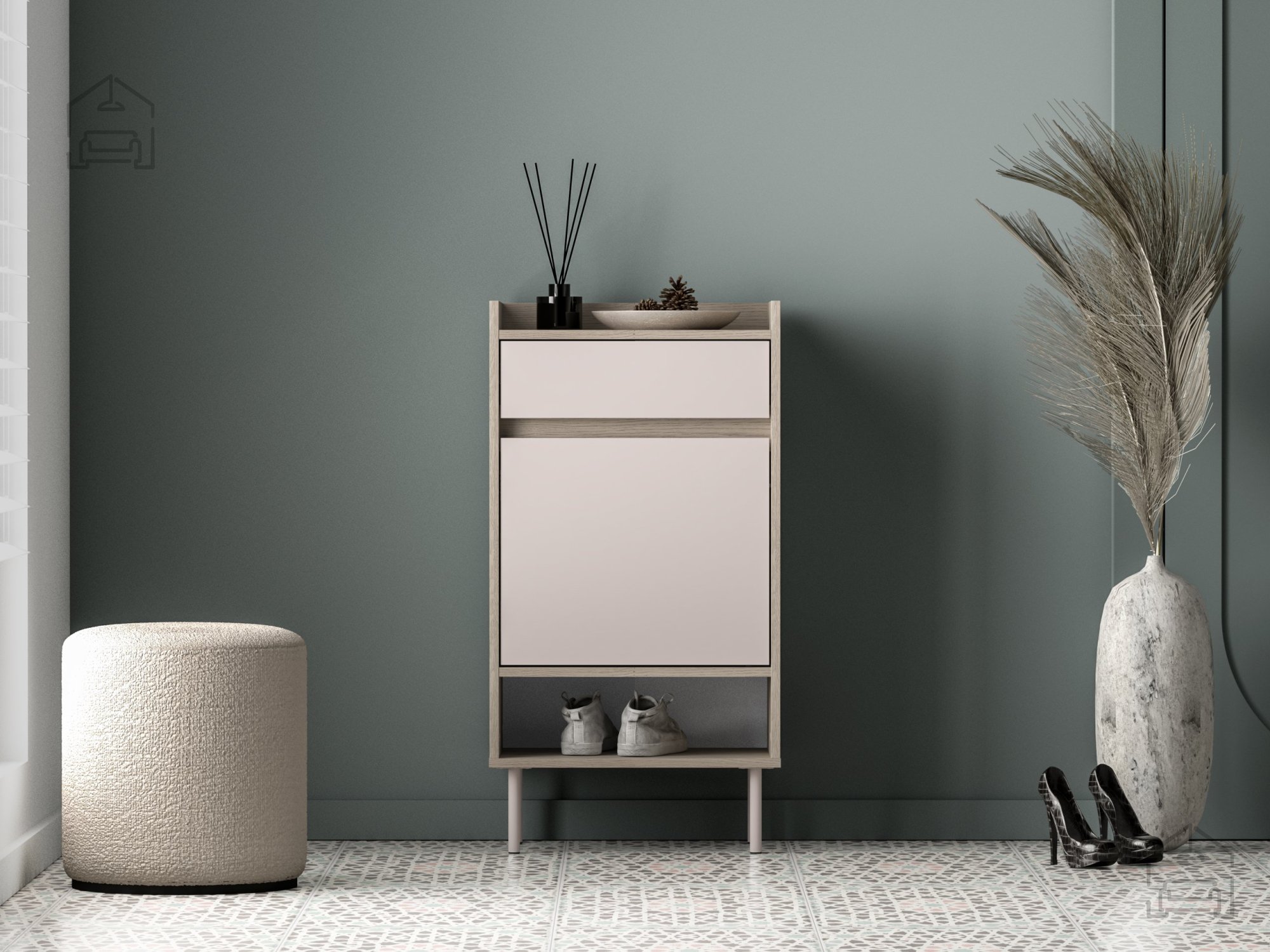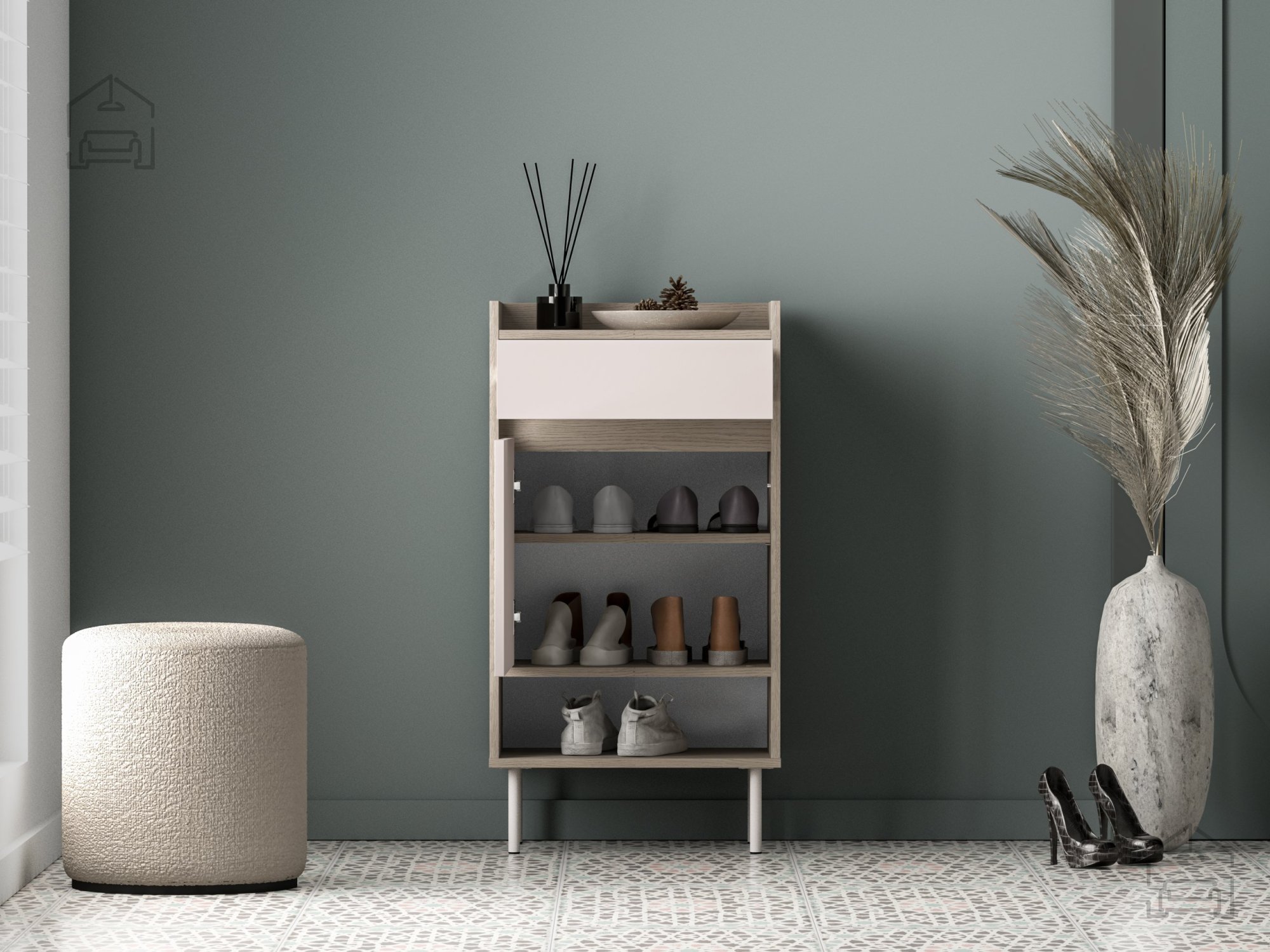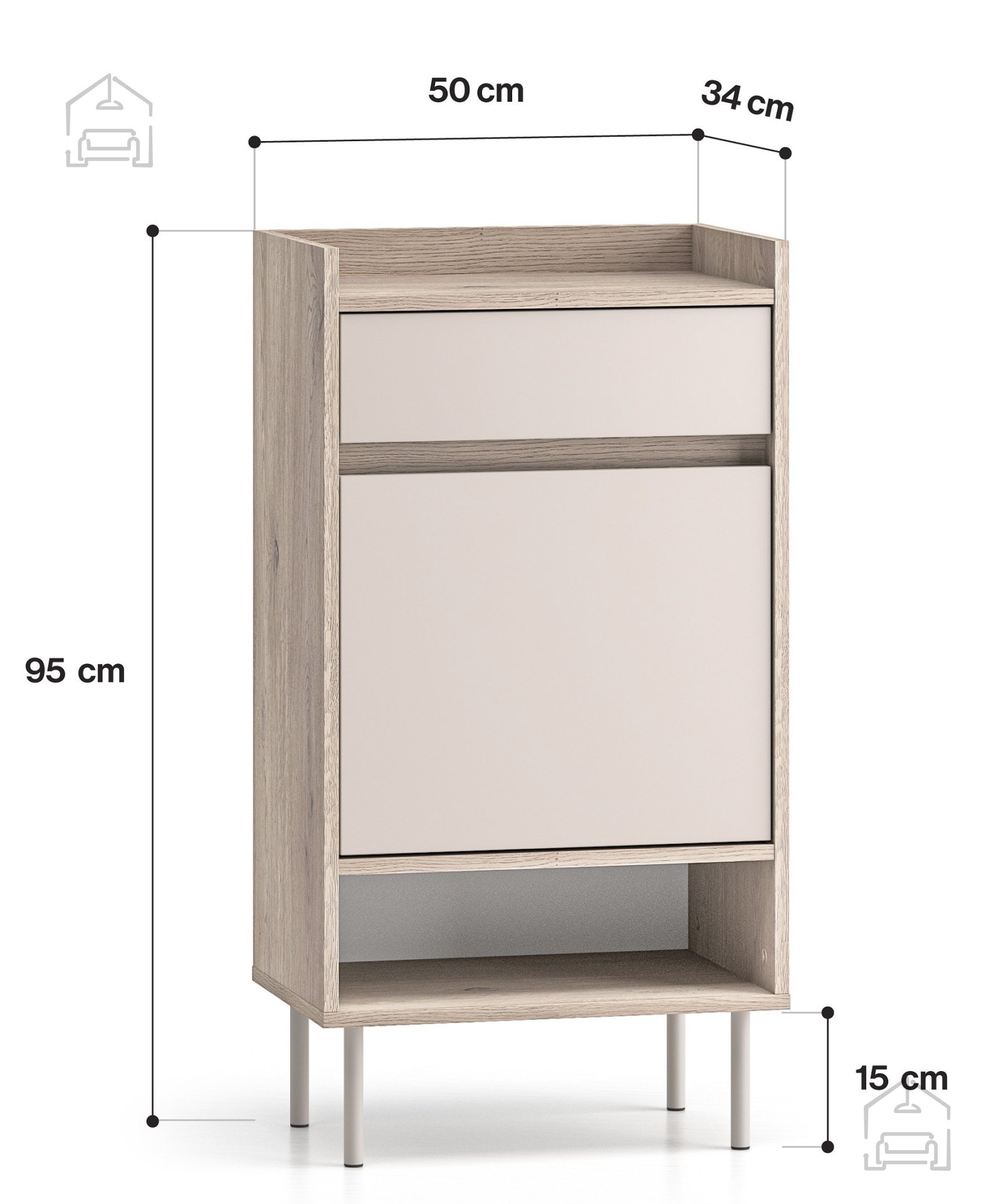 Der Schrank ist 50 cm breit, 34 cm tief und 95 cm hoch. Das Design ermöglicht die Aufbewahrung mehrerer Paar Schuhe, wobei Fächer und Schublade so angeordnet sind, dass der vorhandene Platz optimal genutzt wird. Die obere Ablage eignet sich für kleinere Gegenstände wie Taschen oder Schlüssel und trägt eine maximale Belastung von 10 kg. Dasselbe gilt für den Innenboden, während die Schublade eine Tragkraft von 5 kg hat. Diese Aufteilung bietet ein ausgewogenes Verhältnis zwischen Stauraum und Stabilität – ideal für Möbel, die täglich im Einsatz sind.