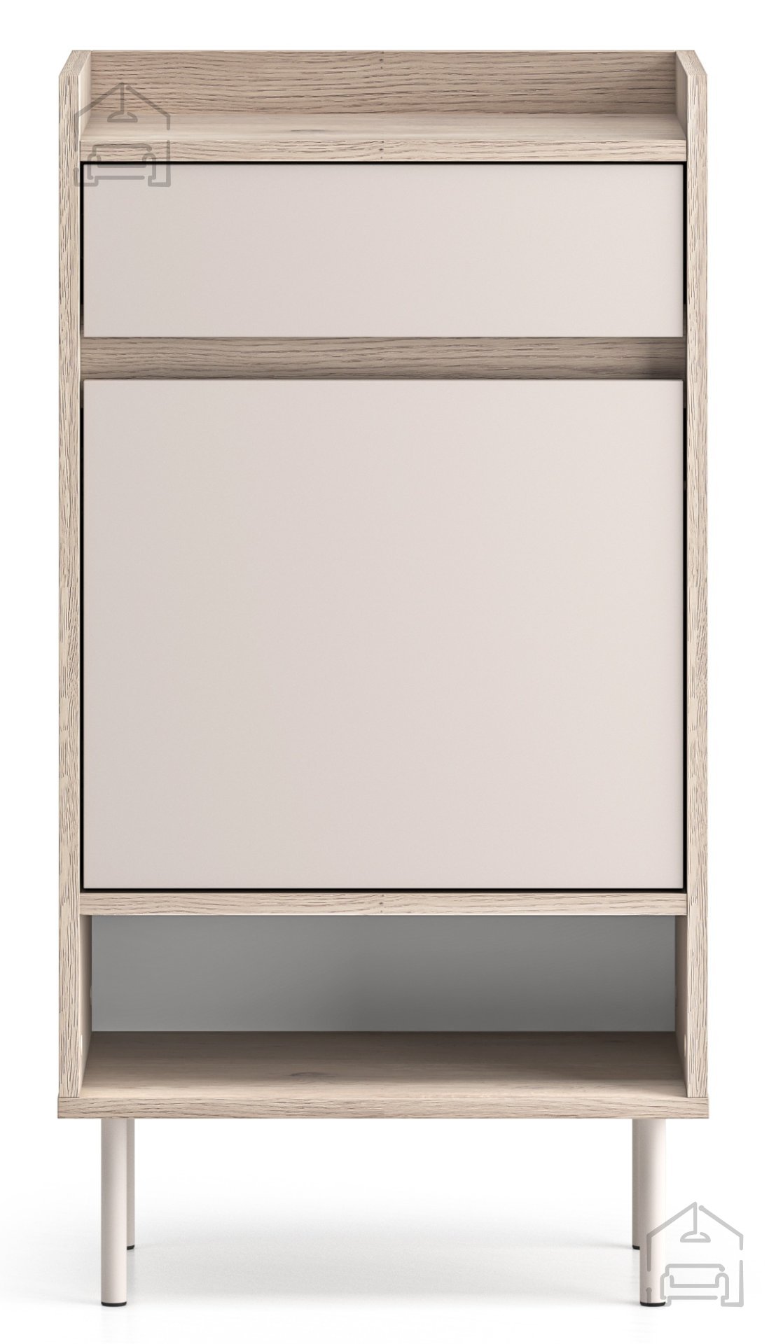 Die Kombination der beiden Farbtöne – des sanften Kaschmirs und des warmen Eichenholzes Cremona Terracotta – schafft einen angenehmen Kontrast, der sich harmonisch in verschiedene Einrichtungsstile einfügt. Der Schuhschrank Voco 04 lässt sich wunderbar mit anderen Elementen der Voco-Kollektion kombinieren, wirkt aber dank seiner zeitlosen Form und Farbgebung auch solo sehr stimmig. Die Holzoptik bringt natürliche Wärme in den Raum, während der hellere Kaschmirton Leichtigkeit und Ordnung vermittelt.