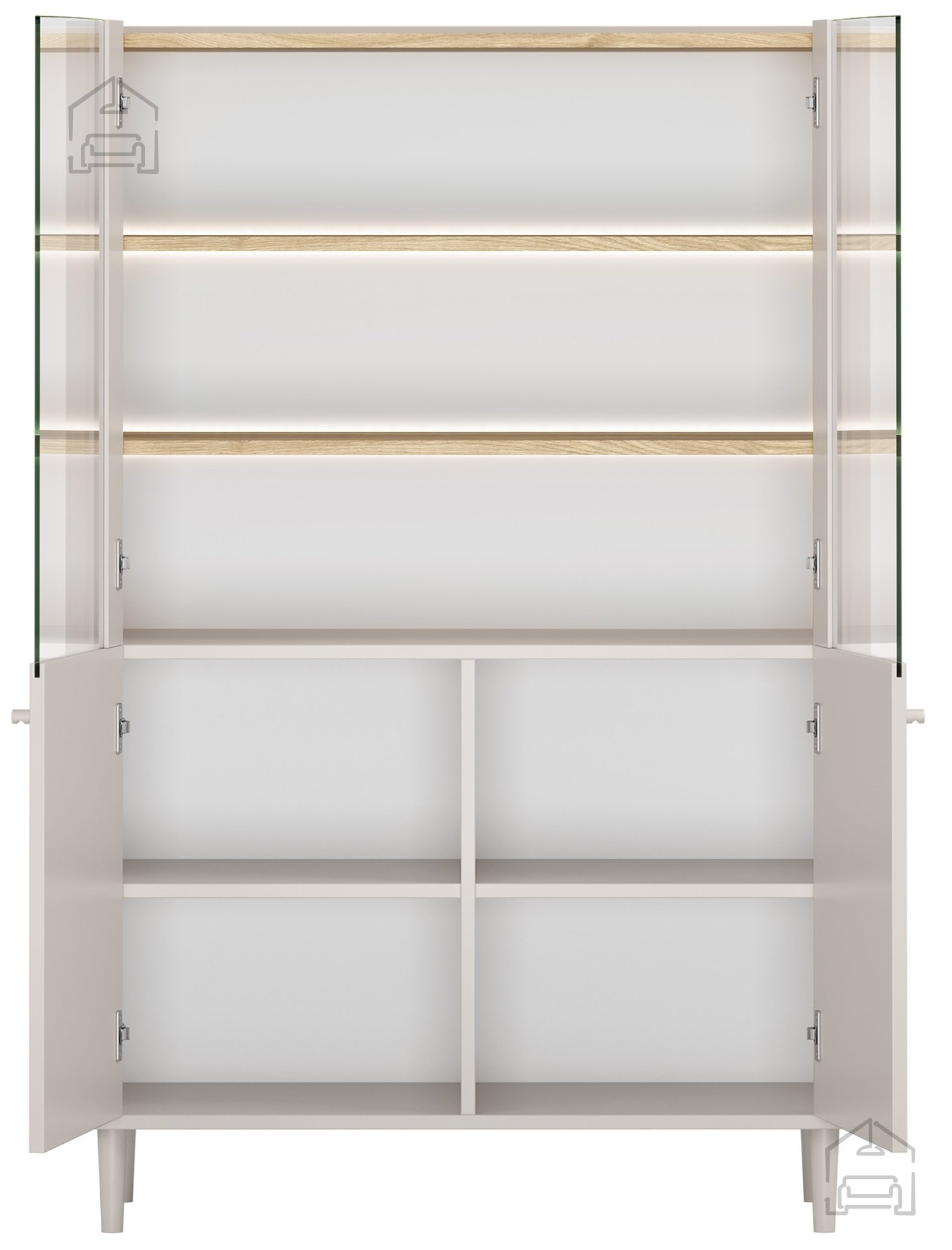 Das Innere der Vitrine ist auf praktische Nutzung ausgelegt. Vier großzügige Ablageflächen bieten übersichtlichen Stauraum und nutzen die gesamte Höhe optimal aus. So bleibt genügend Platz für Gläser, Geschirr, Bücher oder Sammlerstücke. Die Türen sind mit hochwertigen Stahlscharnieren ausgestattet, die ein sanftes, geräuschloses Schließen ermöglichen. Diese Soft-Close-Funktion schützt die Konstruktion und verlängert ihre Lebensdauer.