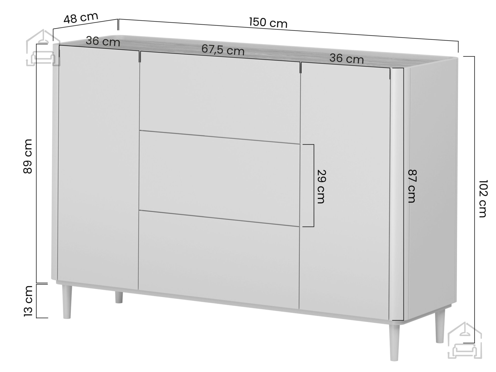 Melamin- und MDF-Platte 150x48x102 cm: Kommode Elivo 150 2D3SZ mit Beinen – Bogart.