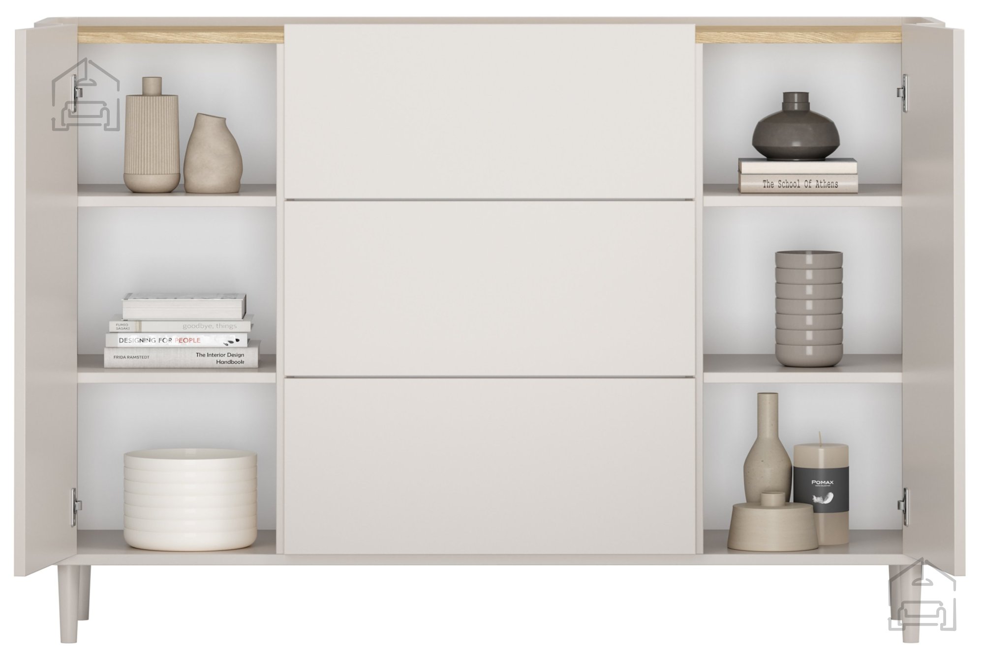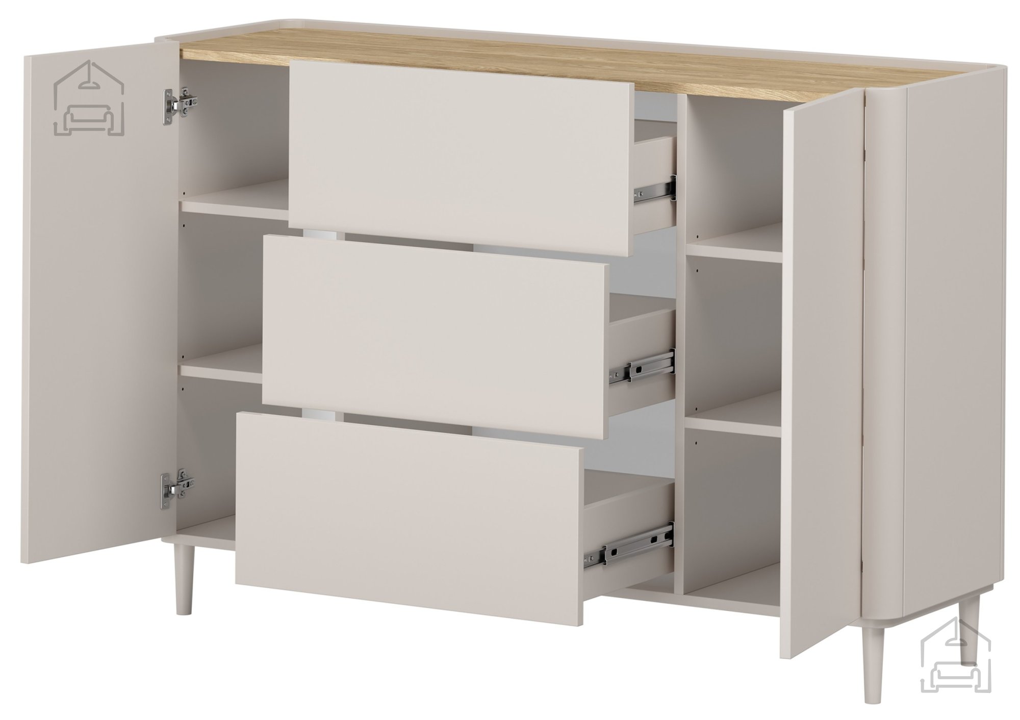 Die Kommode bietet eine durchdachte Innenaufteilung. Drei großzügige Laden mit Push-to-Open-System und Soft-Close-Funktion ermöglichen einen leisen, komfortablen Zugriff auf den Inhalt. Zusätzlich gibt es vier höhenverstellbare Einlegeböden, die je nach Bedarf angepasst werden können. Die beiden Türen öffnen weit und bieten einen guten Überblick, während das Innere optimal auf Stauraum ausgelegt ist. So lassen sich je nach Einsatzbereich Textilien, Dokumente, Geschirr oder dekorative Accessoires ordentlich unterbringen.