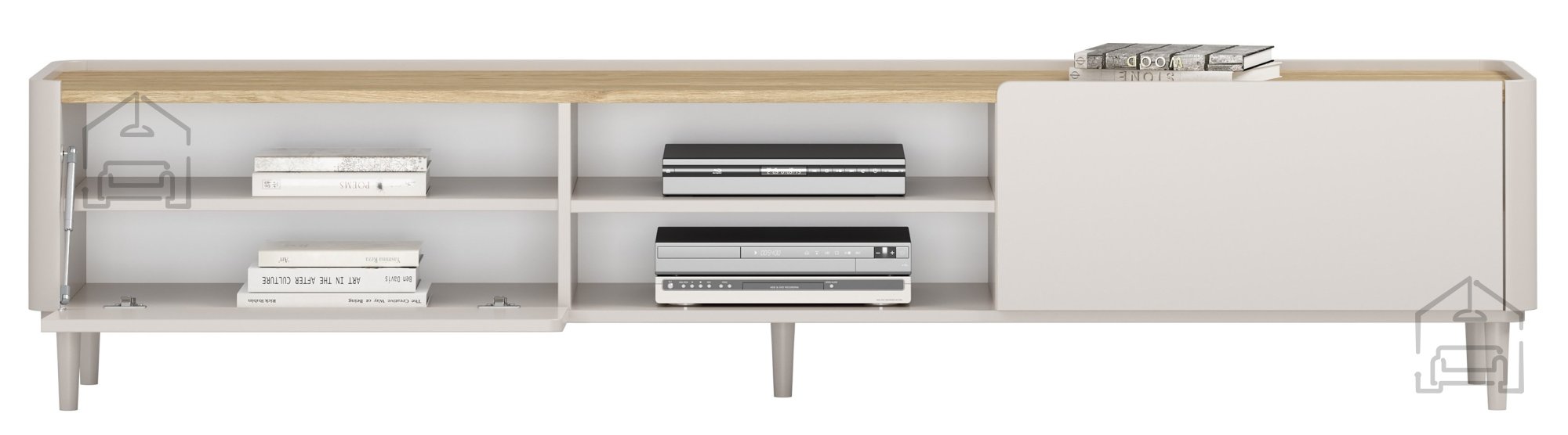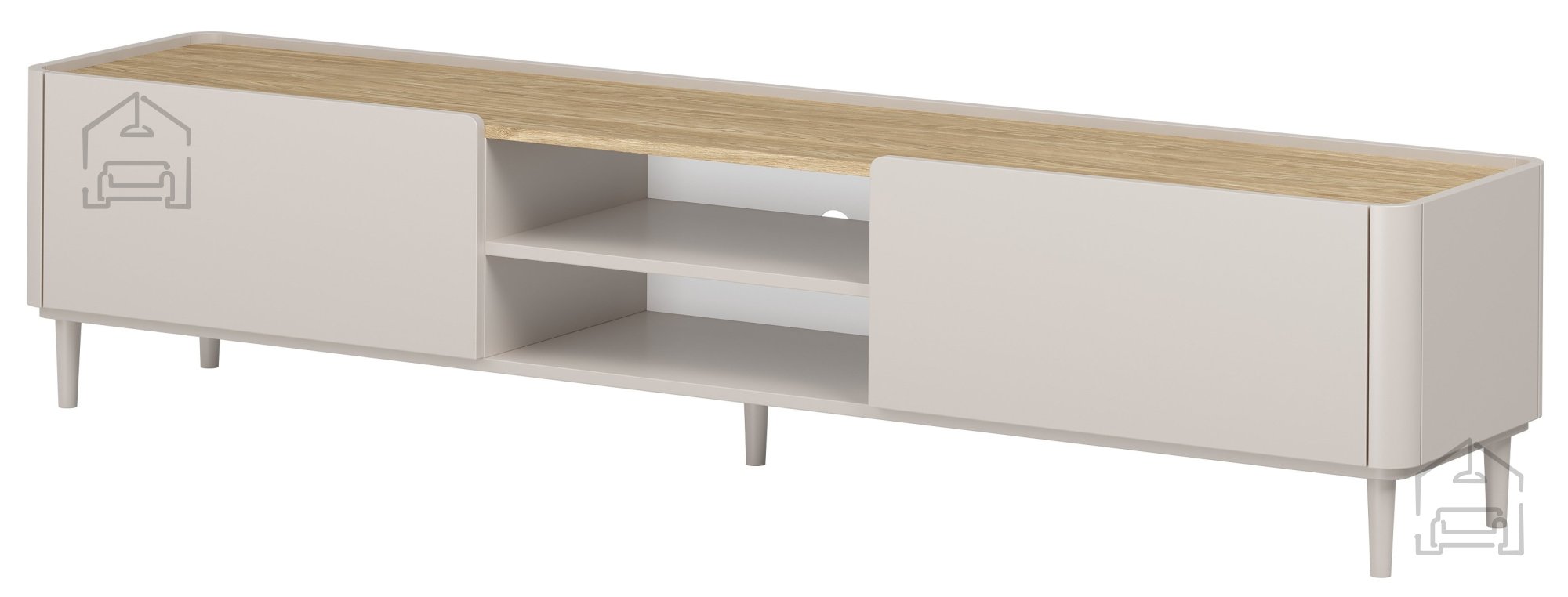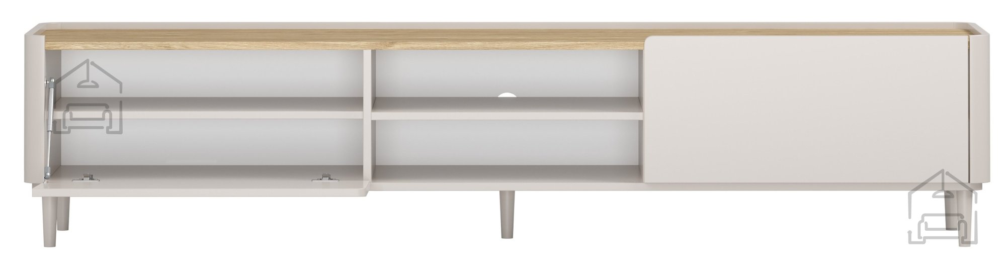 Die TV-Kommode Elivo 220 1K1SZ in der Farbe Kaschmir mit einer Deckplatte in geölter Eiche ist die ideale Wahl für alle, die Wert auf feine Ästhetik und Funktionalität legen. Mit ihren ausgewogenen Proportionen und den Maßen 220 x 48 x 48 cm bietet sie viel Stauraum und wirkt dabei dennoch leicht und modern – perfekt für verschiedenste Wohnstile. Die Kombination aus matter Oberfläche und natürlicher Holzstruktur verleiht dem Raum Wärme und Ordnung, betont durch das klare Design ohne Griffe.