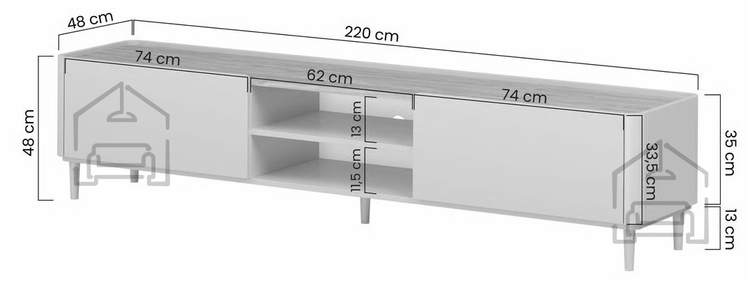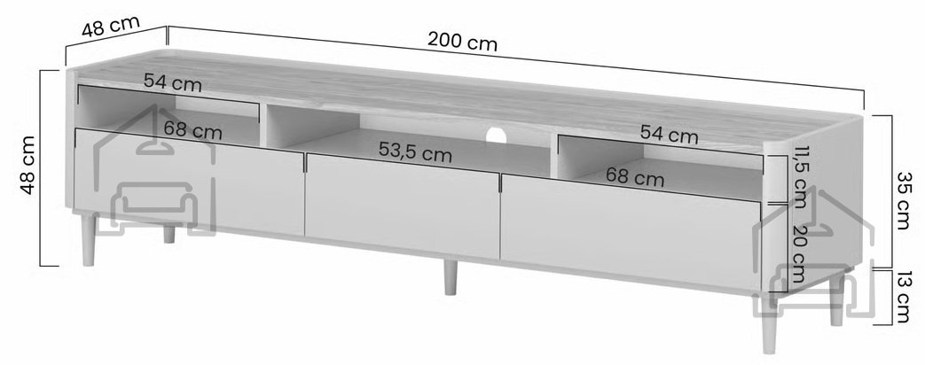 Die Basis der Kommode besteht aus 18 mm starker, beschichteter Spanplatte und MDF, was Stabilität und Langlebigkeit garantiert. Die robusten ABS-Kanten schützen zuverlässig vor Stößen und Abnutzung. Ein zusätzlicher mittlerer Fuß sorgt für noch mehr Stabilität – besonders wichtig bei größeren Belastungen wie modernen Fernsehern oder Multimedia-Geräten. Die Fertigung im Werk Bogart in Polen steht für präzise Verarbeitung und sorgfältige Details.