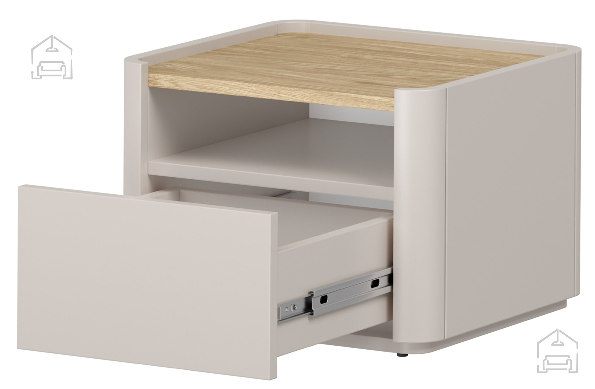 Der Nachttisch verfügt über eine großzügige Schublade, die nach oben geöffnet wird. Ein Kugellager-Auszug ermöglicht ein sanftes, leises Gleiten, während der Soft-Close-Mechanismus dafür sorgt, dass die Lade leise und stoßfrei schließt. Dieses Detail erhöht den Bedienkomfort und verlängert zugleich die Lebensdauer der Beschläge.