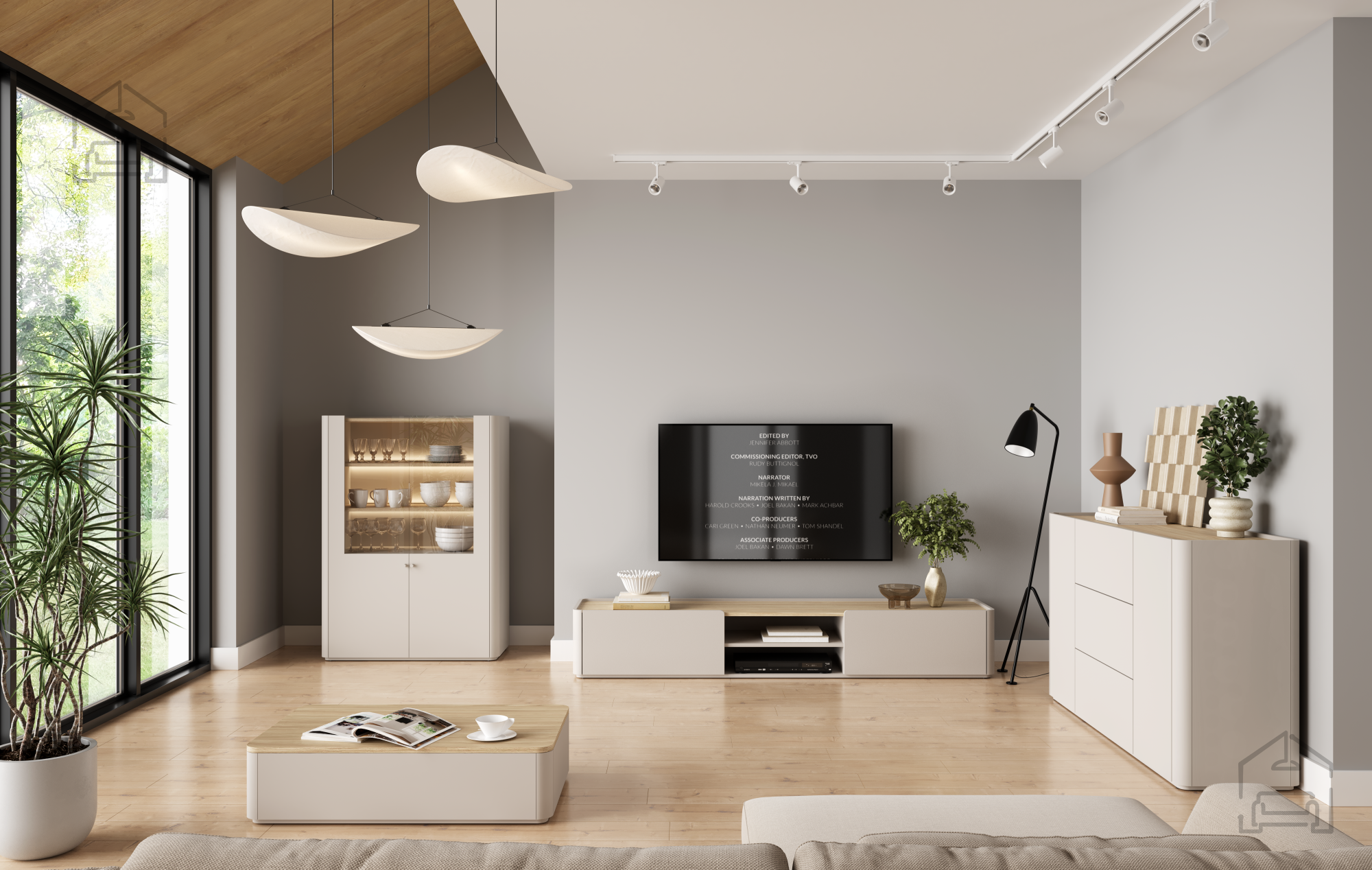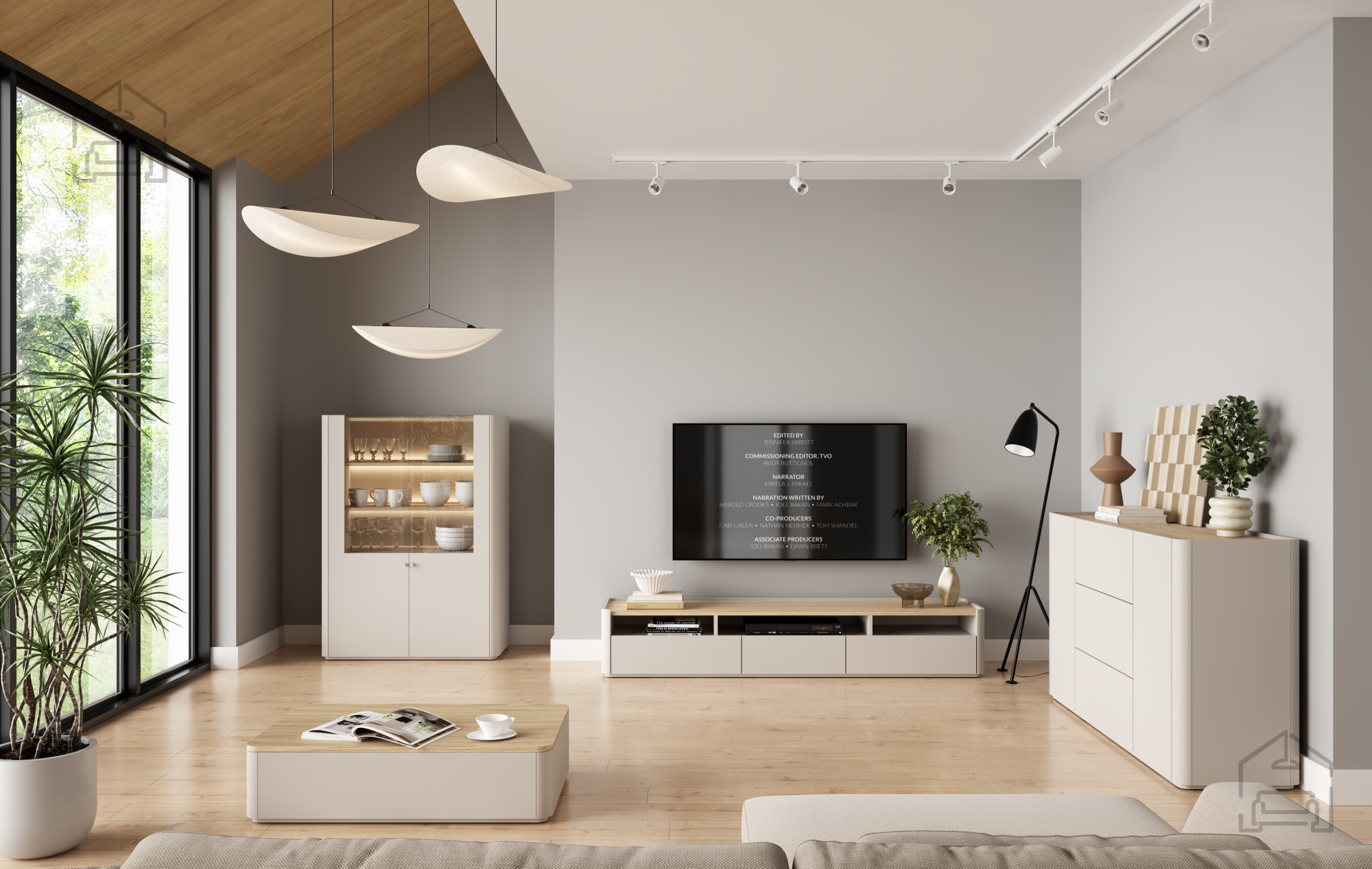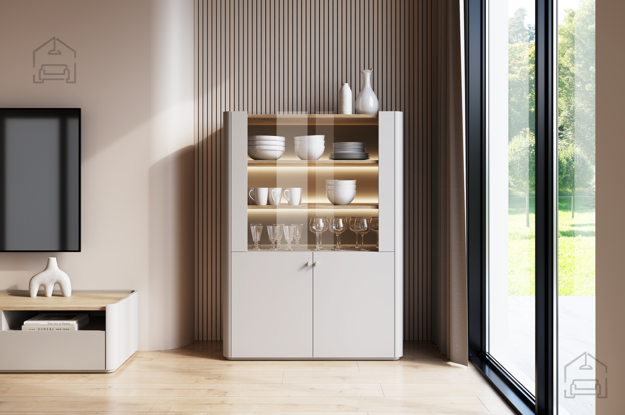 Das Hauptmaterial besteht aus einer 18 mm starken Melaminplatte, die Stabilität, Kratzfestigkeit und einfache Reinigung gewährleistet. Ergänzende MDF-Elemente sorgen für Formstabilität und eine exakte Verarbeitung, während Buchenholzdetaile der Vitrine eine natürliche Note verleihen. Die Kanten sind mit einem ABS-Band geschützt, was die Haltbarkeit erhöht und Beschädigungen im täglichen Gebrauch vorbeugt.