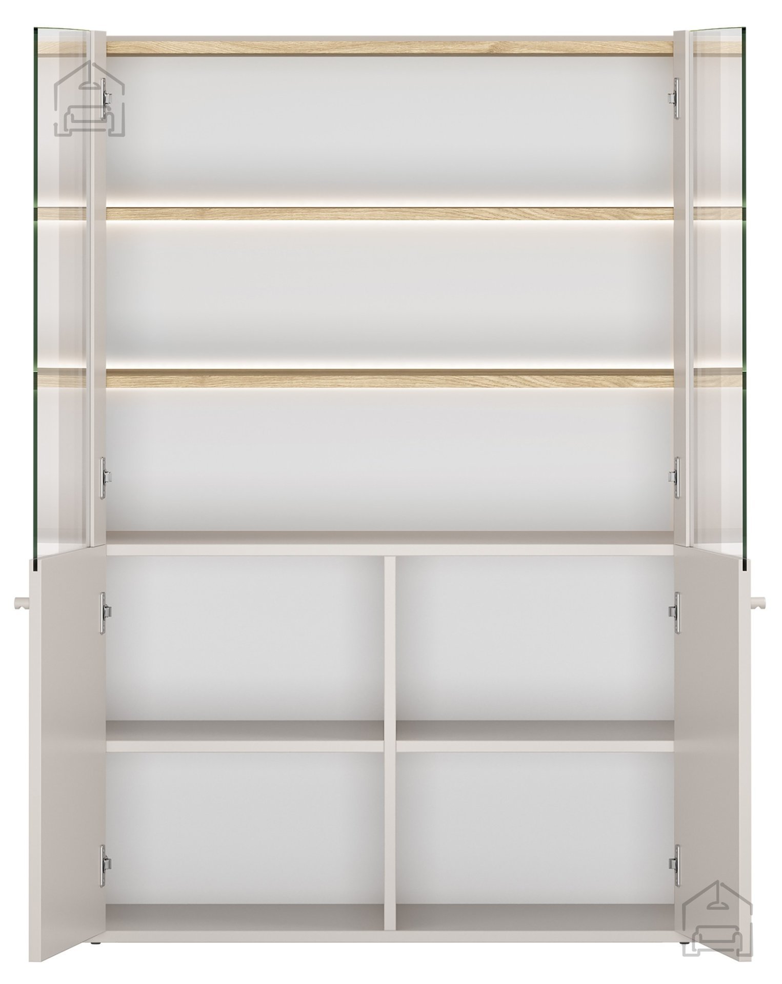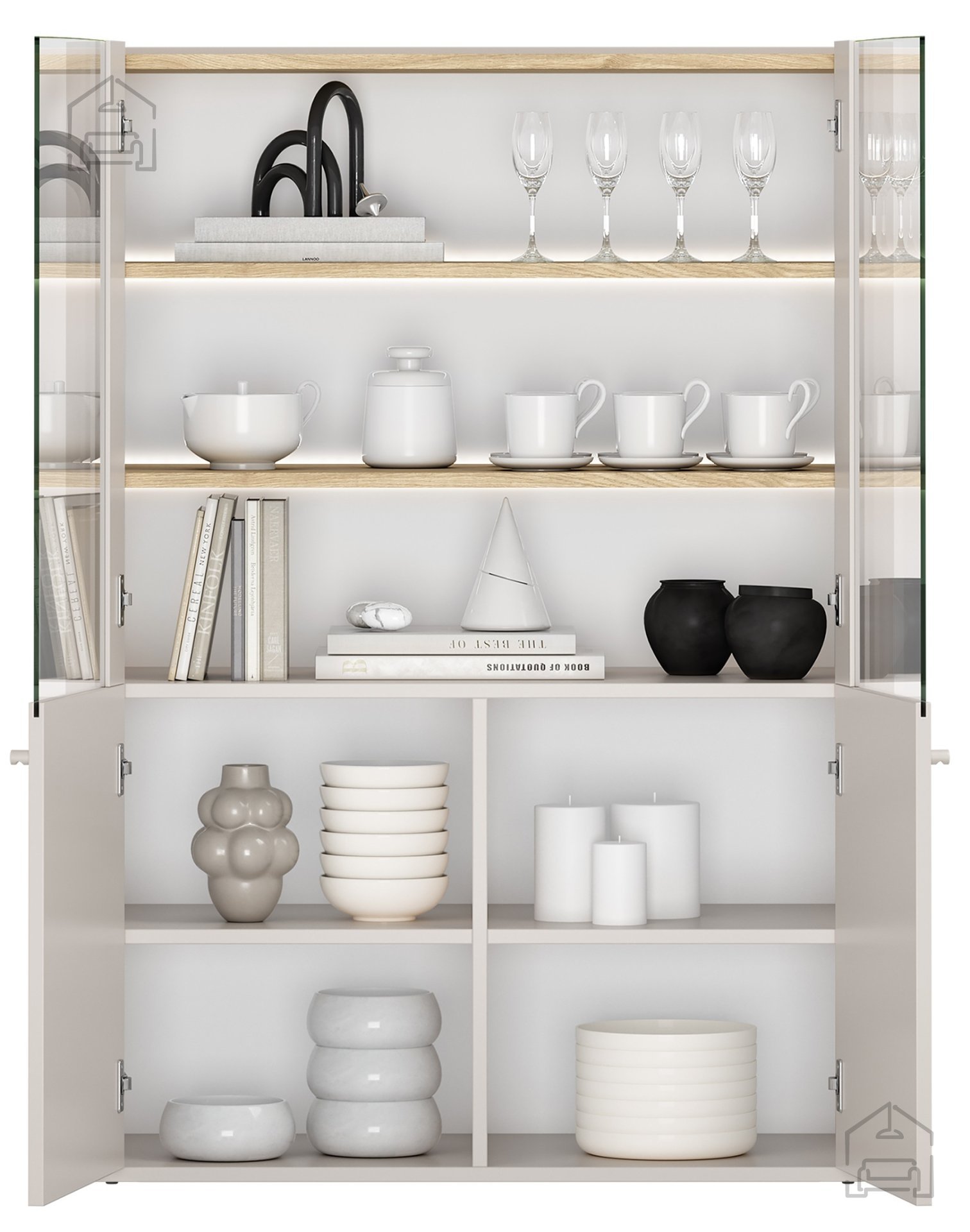 Der Innenraum bietet genügend Platz, um sowohl dekorative als auch nützliche Gegenstände ordentlich zu verstauen – von Gläsern, Porzellan und Büchern bis hin zu Erinnerungsstücken und persönlichen Accessoires. Durch die gut durchdachte Aufteilung der Einlegeböden bleibt alles übersichtlich und aufgeräumt.