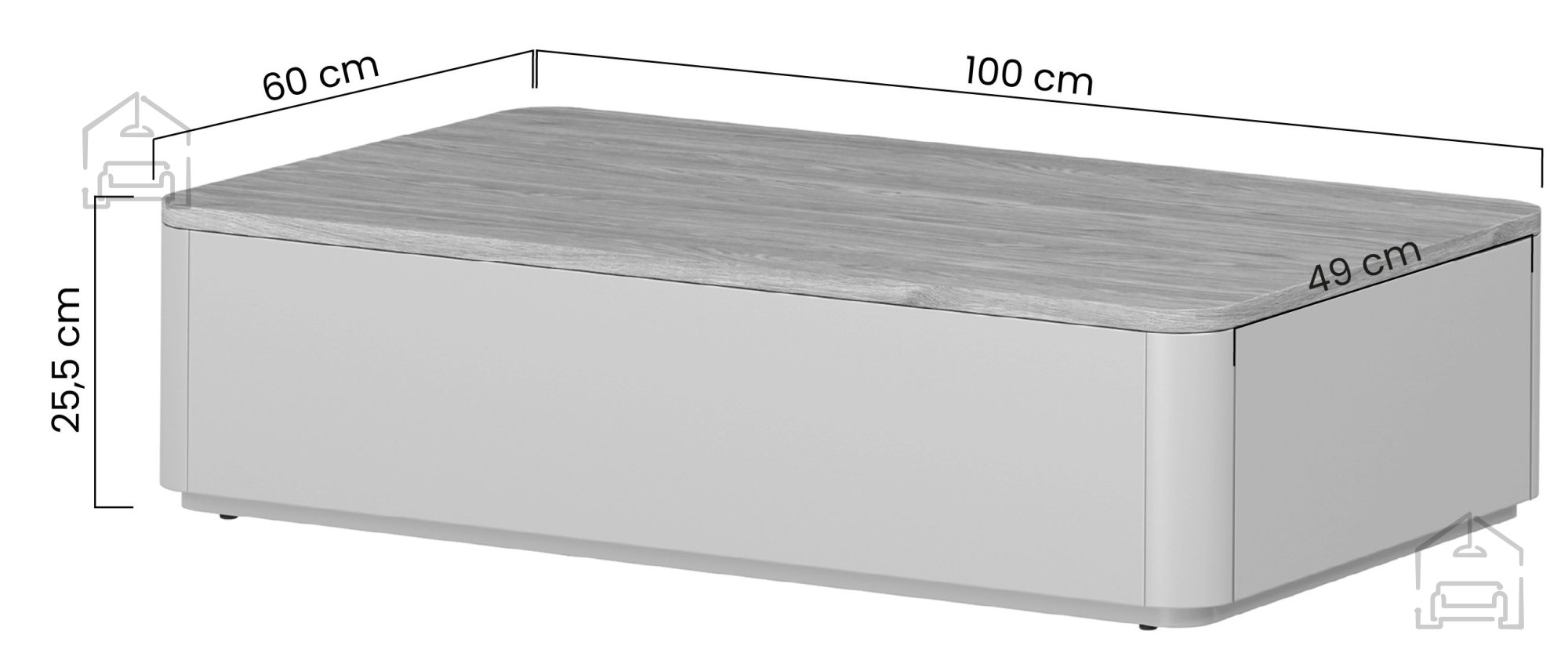 Die Maße des Tisches betragen 100 × 60 × 25,5 cm – ein ideales Verhältnis zwischen Nutzfläche und kompakter Größe. Die solide Konstruktion gewährleistet Stabilität, auch bei höherer Belastung. Der Tisch fügt sich perfekt in mittelgroße Wohnzimmer ein, entweder als zentrales Element oder als praktische Ergänzung zur Sofalandschaft.