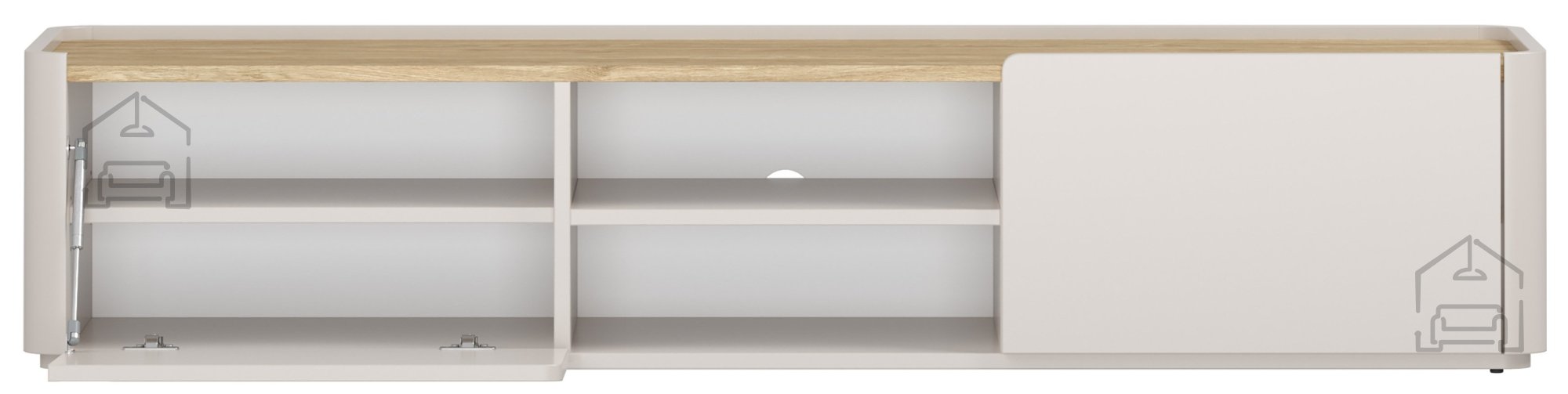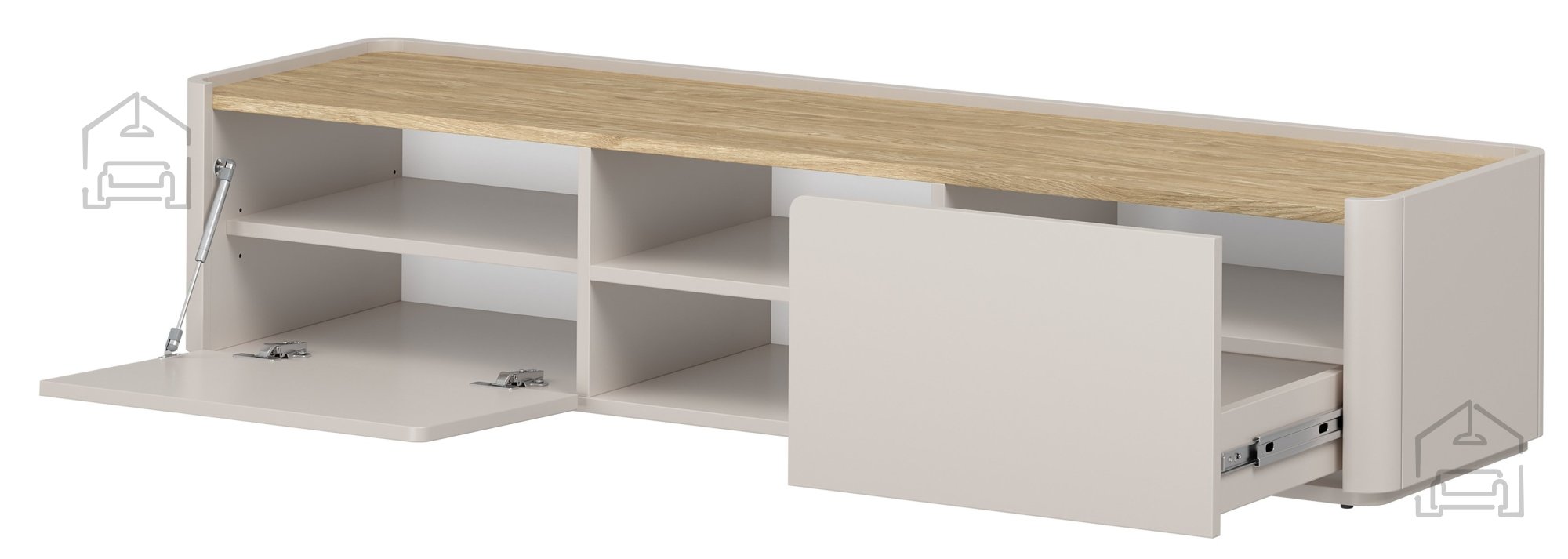 Die Kommode wurde für die Nutzung moderner Elektronik konzipiert. Auf der Rückseite befindet sich eine Kabelöffnung, durch die Strom- und Signalleitungen ordentlich geführt werden können – ganz ohne sichtbare Kabel. Eine Tür und eine Schublade bieten ausreichend Platz für Fernbedienungen, Spielkonsolen, Receiver oder dekorative Accessoires. Dank des leisen Mechanismus schließen Türen und Schubladen sanft und geräuschlos, was den alltäglichen Komfort erhöht.