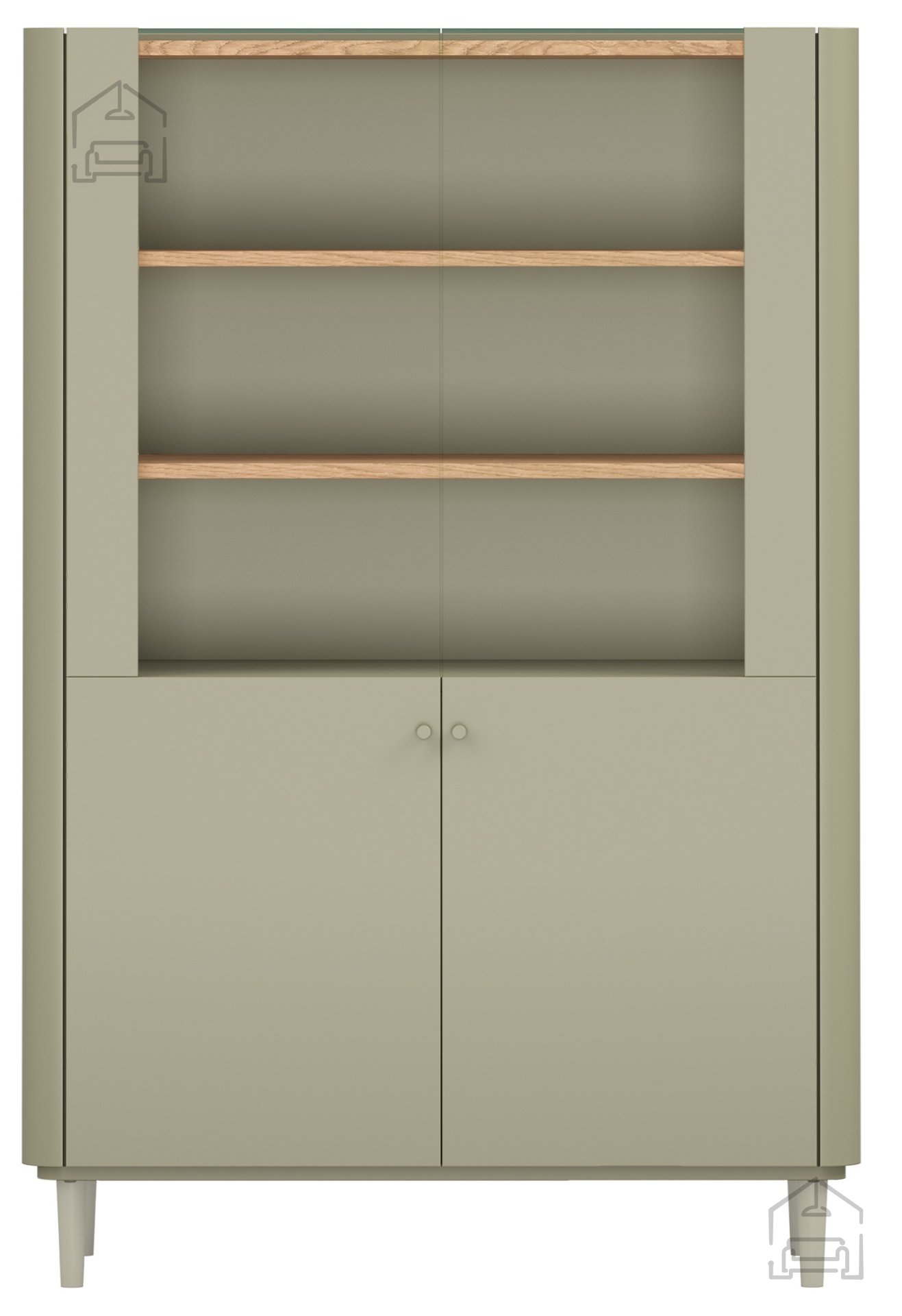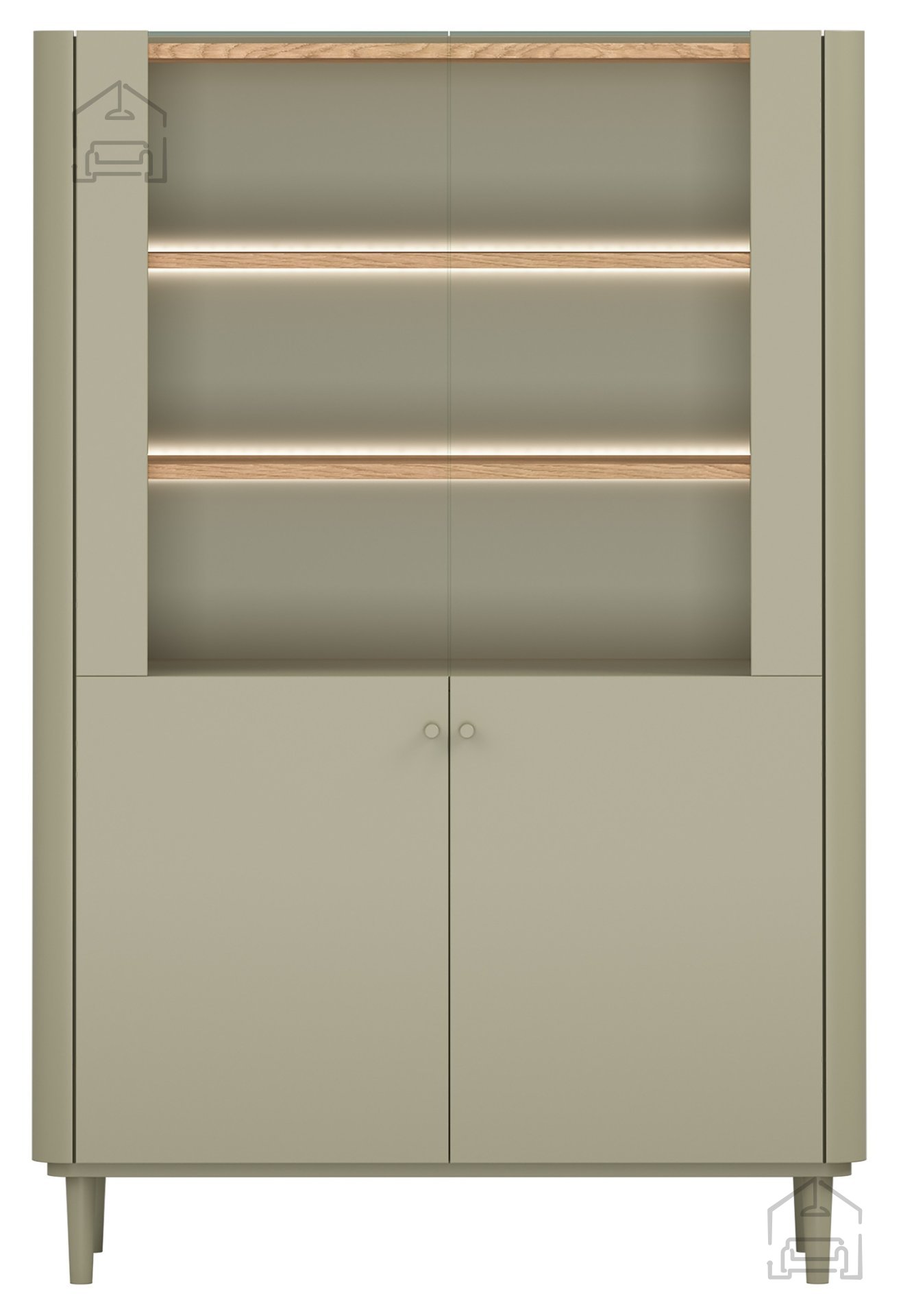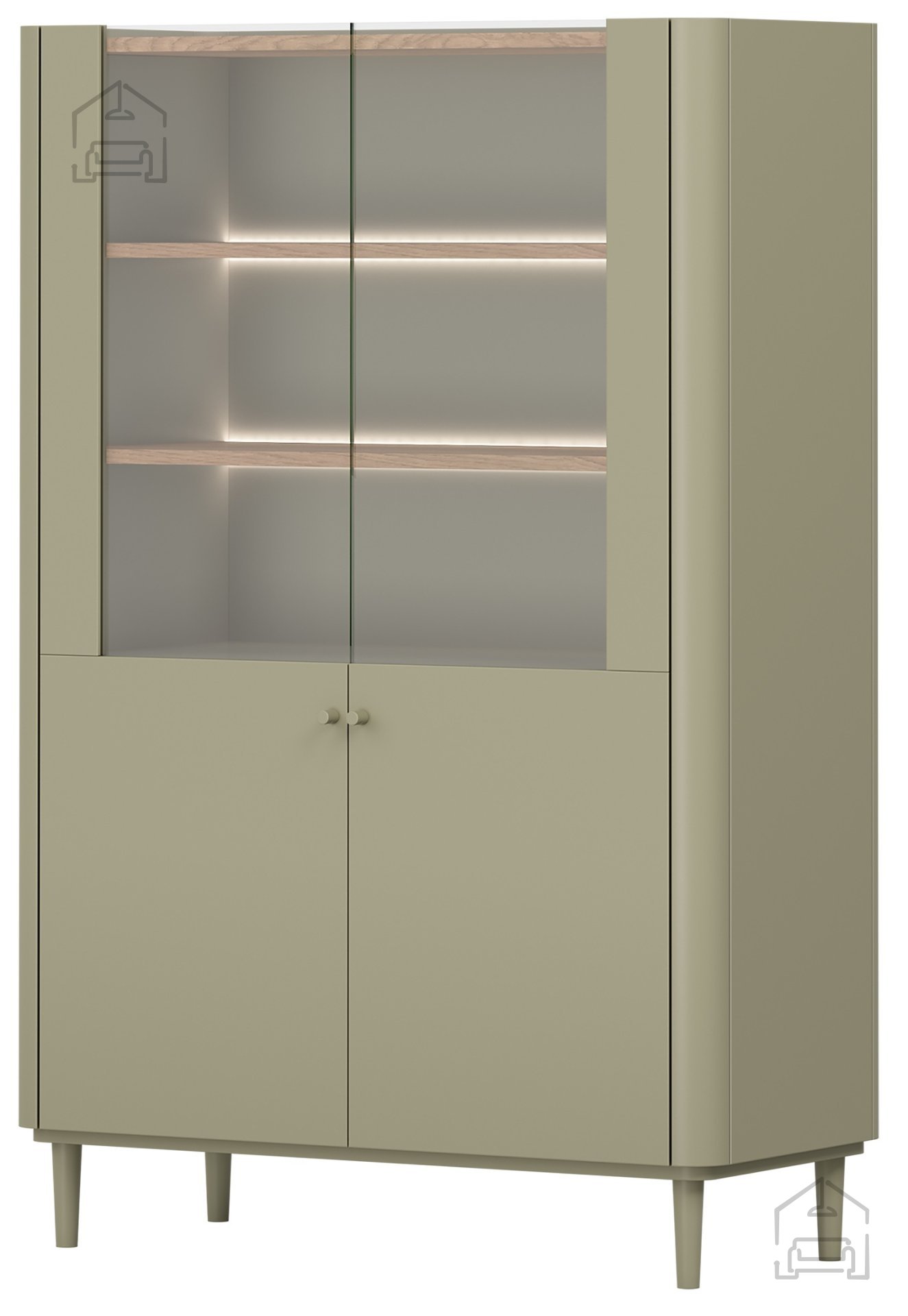 Die Konstruktion besteht aus einer 18 mm starken Melaminplatte und MDF, was Stabilität und Widerstandsfähigkeit im täglichen Gebrauch gewährleistet. ABS-Kanten schützen die Oberfläche vor Beschädigungen und sorgen dafür, dass das Möbelstück auch nach Jahren gepflegt aussieht. Buchenholzbeine mit einer Höhe von 13 cm, lackiert in Eukalyptusfarbe, verleihen zusätzliche Eleganz und erleichtern zugleich die Reinigung unter der Vitrine – ein Detail, das ihre schwebende Optik unterstreicht.