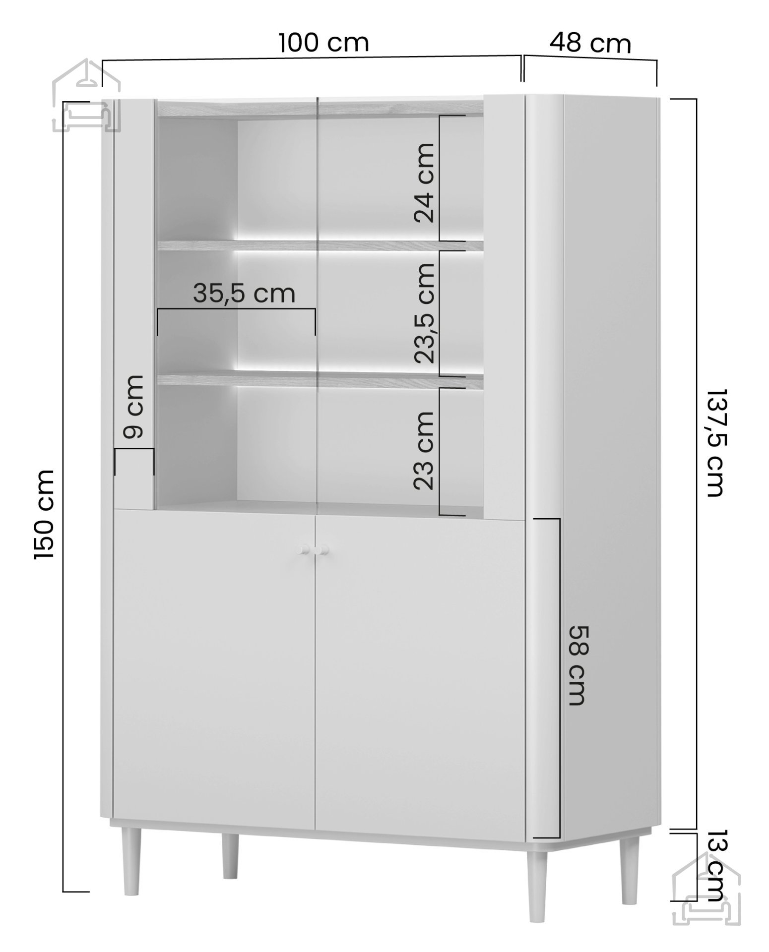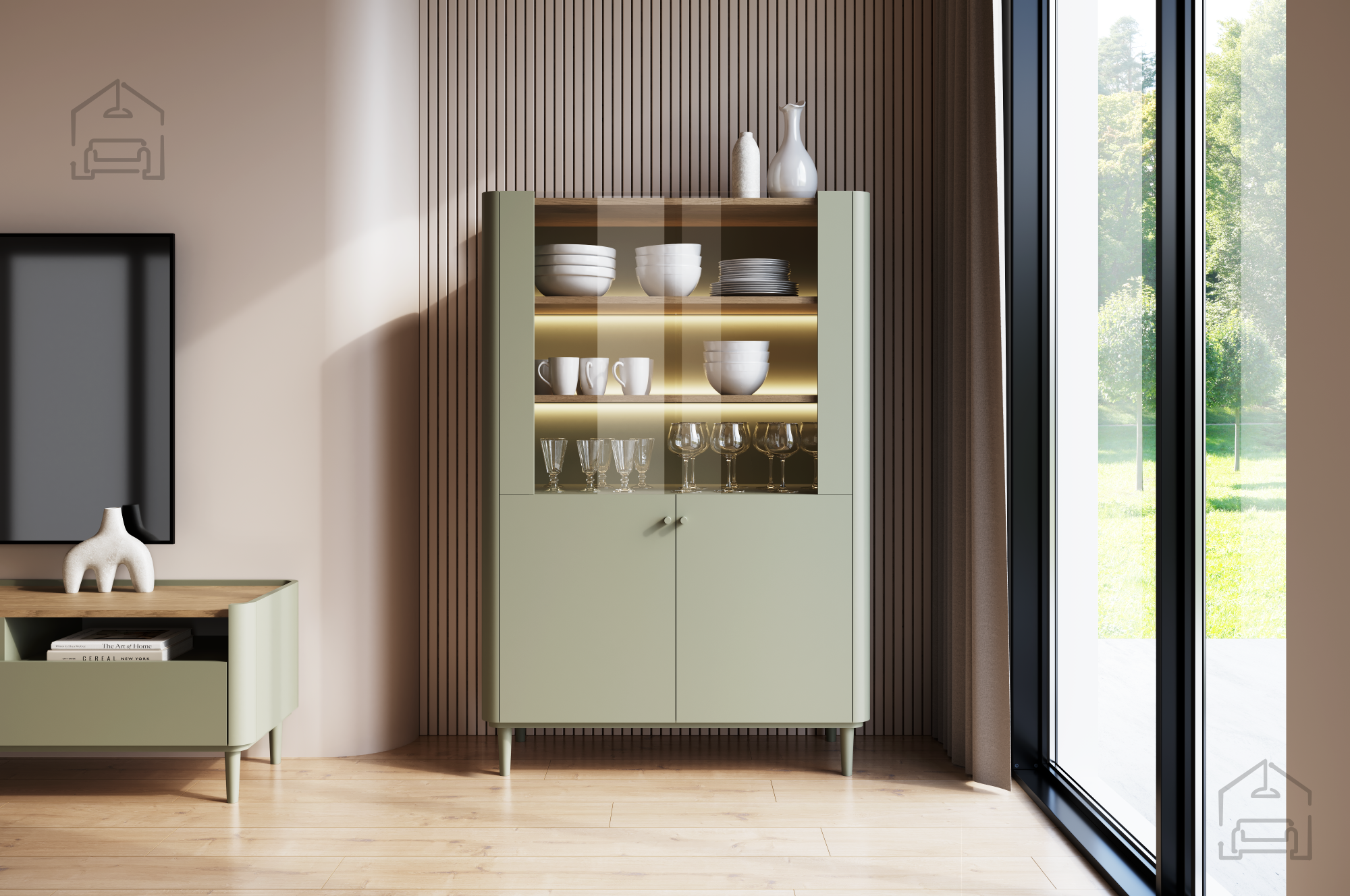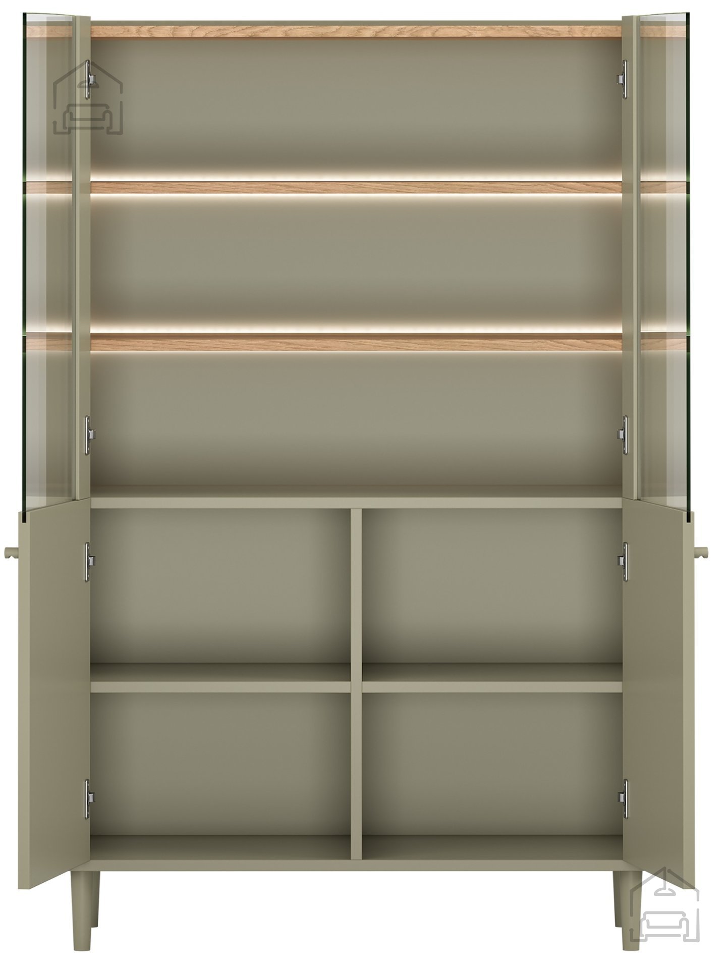 Die Konstruktion besteht aus einer 18 mm starken Melaminplatte und MDF, was Stabilität und Widerstandsfähigkeit im täglichen Gebrauch gewährleistet. ABS-Kanten schützen die Oberfläche vor Beschädigungen und sorgen dafür, dass das Möbelstück auch nach Jahren gepflegt aussieht. Buchenholzbeine mit einer Höhe von 13 cm, lackiert in Eukalyptusfarbe, verleihen zusätzliche Eleganz und erleichtern zugleich die Reinigung unter der Vitrine – ein Detail, das ihre schwebende Optik unterstreicht.