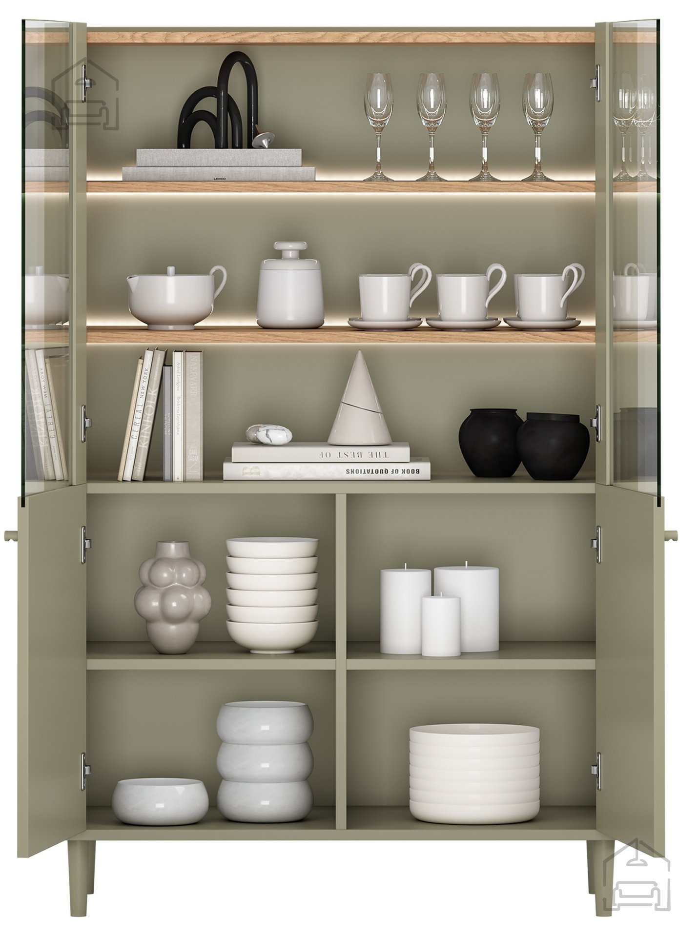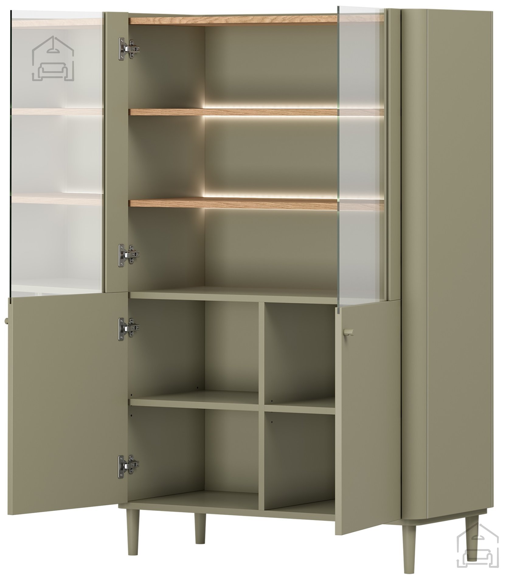 Die Vitrine verfügt über ein Soft-Close-System ohne sichtbare Griffe, was den minimalistischen Look unterstützt und für leises Schließen sorgt. Glastüren ermöglichen einen klaren Blick auf den Inhalt und schützen ihn gleichzeitig vor Staub. Vier großzügige Ablageflächen bieten Platz für Bücher, Porzellan oder persönliche Erinnerungsstücke. Die integrierte LED-Beleuchtung setzt das Innere sanft in Szene und schafft besonders abends eine angenehme Lichtstimmung.