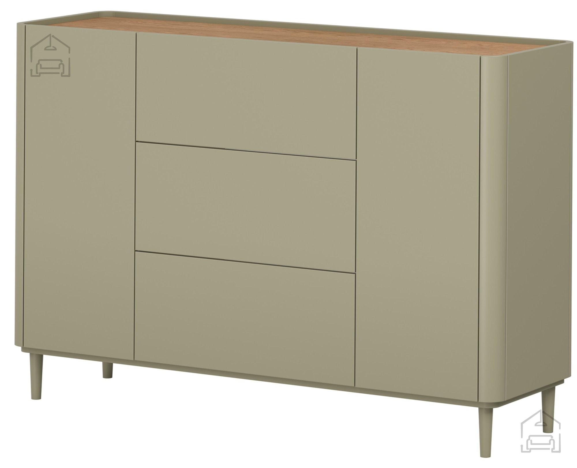 Die natürlichen Eukalyptustöne in Kombination mit der Deckplatte in der Farbe Eiche Baltic Dune ziehen alle Blicke auf sich und verleihen dem Raum eine angenehme, moderne Atmosphäre. Die schlanken Buchenbeine sorgen für Leichtigkeit, während die abgerundeten Kanten der Fronten dem Möbelstück eine dezente Eleganz verleihen. Durch dieses Design kommt die Kommode sowohl im Wohnzimmer als auch im Schlafzimmer, Esszimmer oder Büro perfekt zur Geltung.