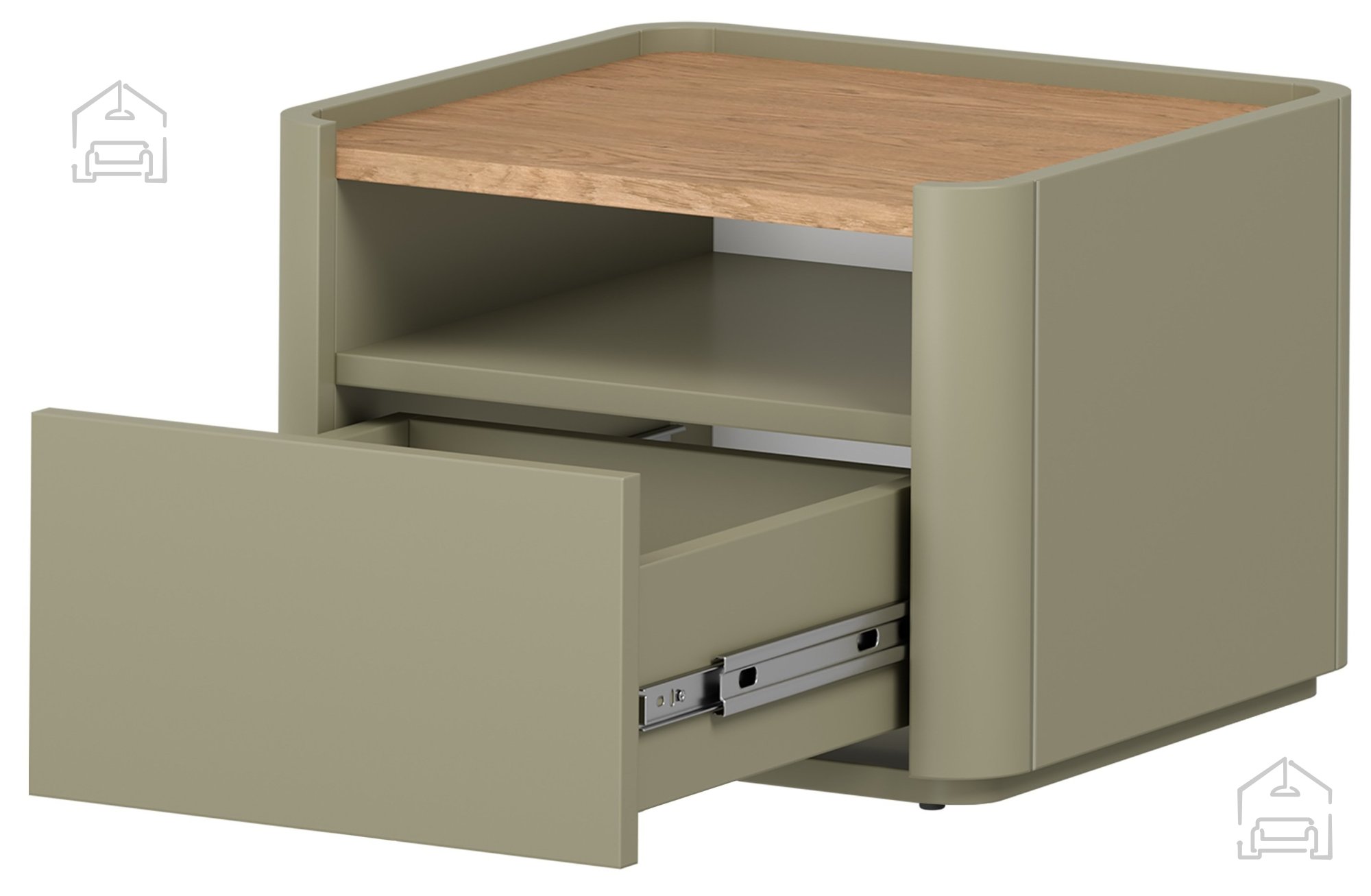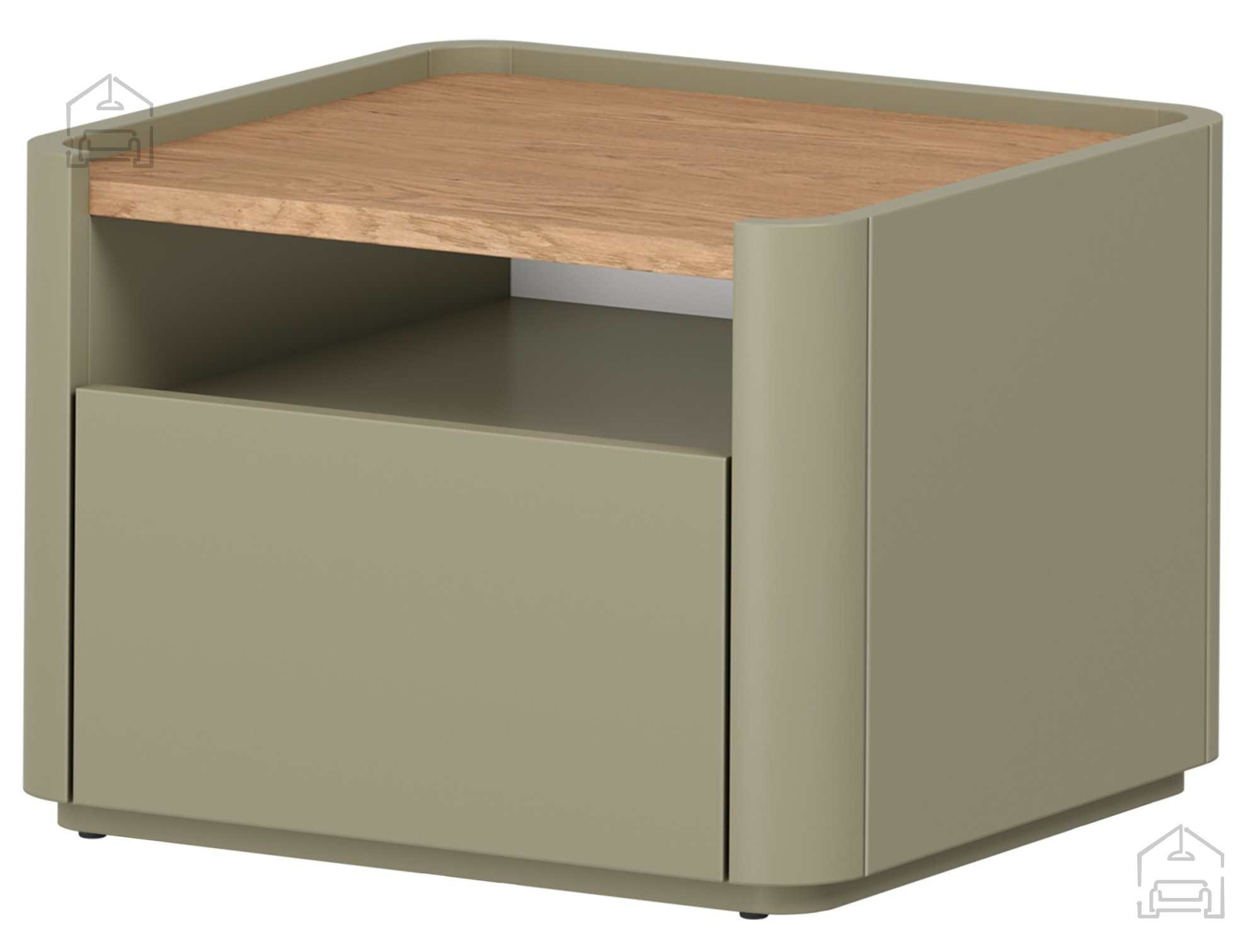 Das Besondere an diesem Modell ist der Kontrast zwischen der Grundfarbe Eukalyptus und der Deckplatte in baltischer Dune-Eiche. Diese Kombination vermittelt ein Gefühl von natürlicher Helligkeit und Frische und harmoniert wunderbar mit anderen Holz- oder Weißtönen im Schlafzimmer. Die Oberfläche ist strapazierfähig und leicht zu reinigen – ideal für den täglichen Gebrauch, etwa für eine Lampe, ein Buch oder eine Tasse Tee.