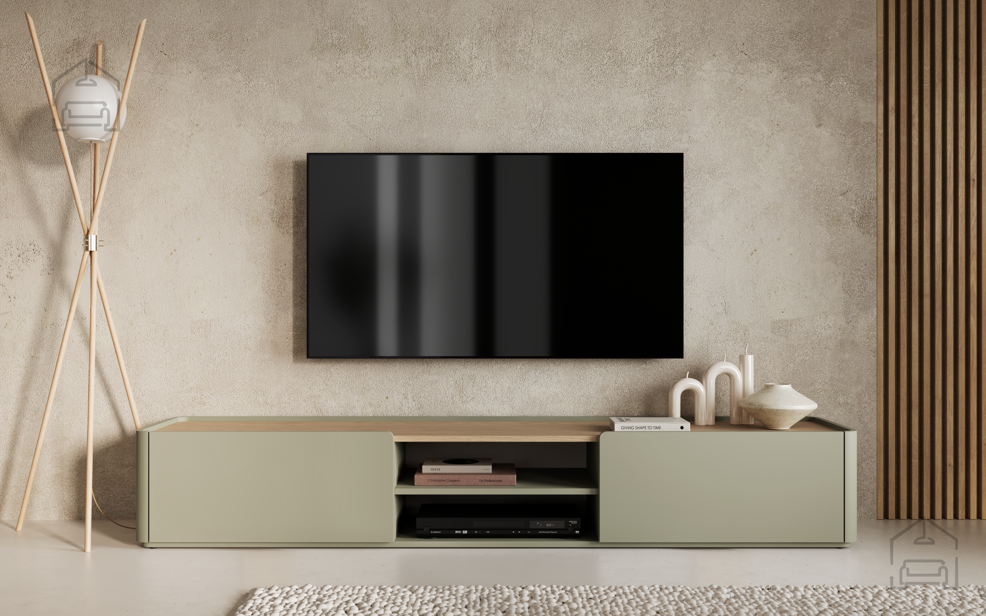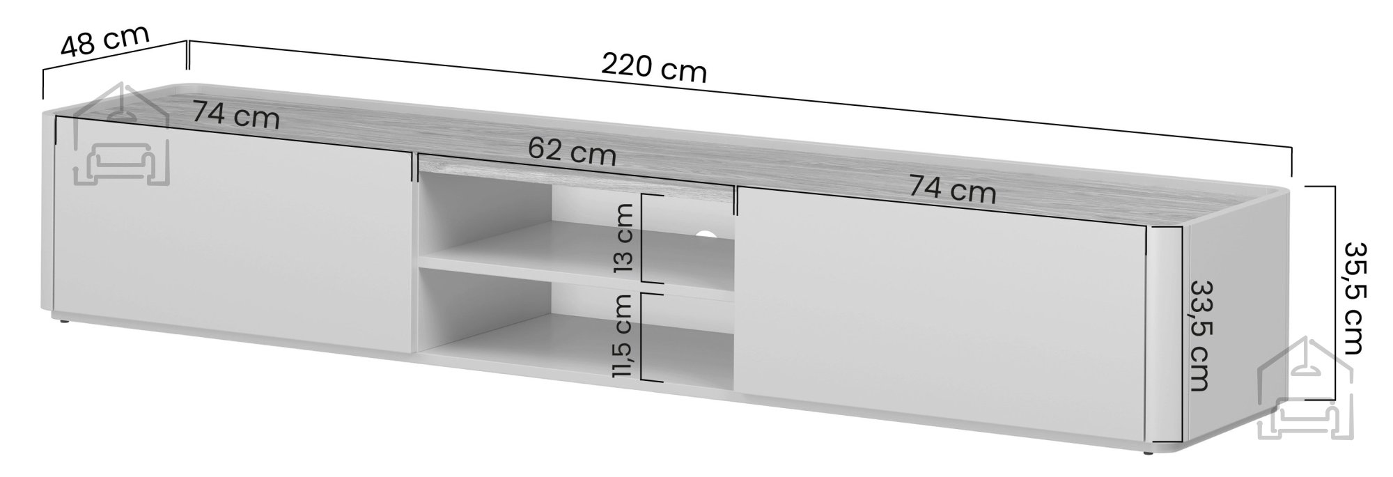 Die TV-Kommode Elivo 220 1K1SZ eignet sich besonders für großzügige Wohnzimmer, in denen ein aufgeräumtes und harmonisches Gesamtbild gewünscht ist. Ihre Höhe ermöglicht bequemes Fernsehen, während die Länge Platz für dekorative Elemente wie Lampen, Pflanzen oder Kunstobjekte bietet. Durch die neutrale Farbkombination lässt sie sich leicht mit anderen Möbelstücken kombinieren – ob in heller Eiche, Weiß oder Grau. Wer minimalistisches Design und Funktionalität schätzt, findet in diesem Modell die ideale Balance zwischen Ästhetik und Alltagstauglichkeit.
