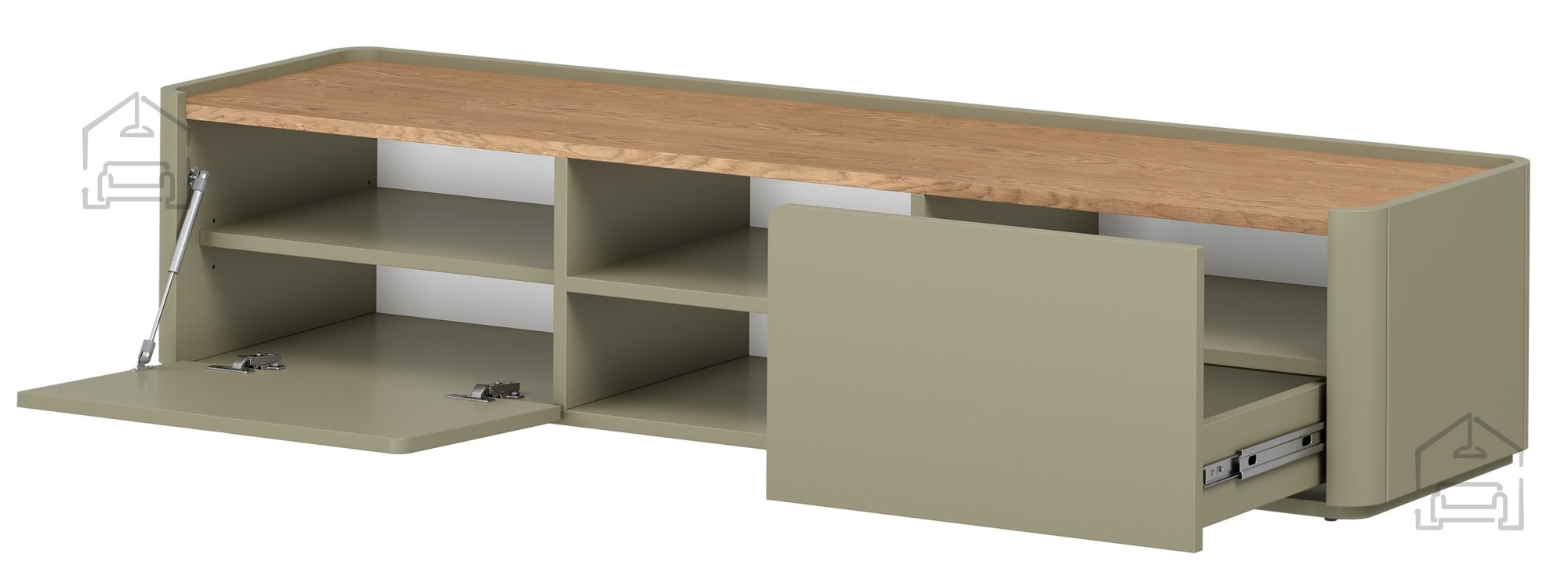 Die Kombination aus Eukalyptusfarbe und heller Eiche Baltic Dune schafft einen angenehmen Kontrast, der dem Raum Wärme und Natürlichkeit verleiht. Mit ihren Maßen von 170 × 48 × 35,5 cm bietet die Kommode ausreichend Platz für moderne Fernseher und Zubehör. Zwei offene Fächer eignen sich ideal für Multimedia-Geräte, Receiver oder Spielkonsolen, während der geschlossene Bereich mit Tür und Schubladen Ordnung schafft und Kabel sowie Zubehör dezent verschwinden lässt.