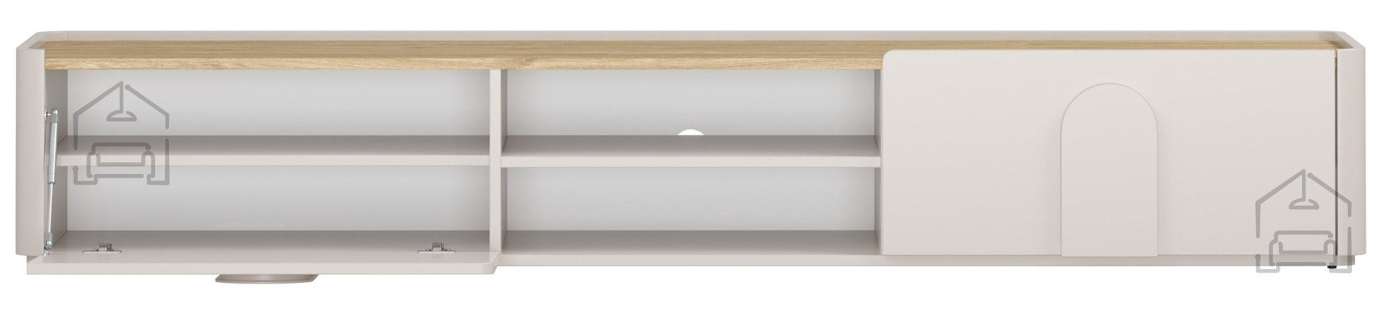 Mit einer Breite von 220 cm sowie einer Höhe und Tiefe von 48 × 35,5 cm bietet die Kommode großzügigen Stauraum. Im Inneren befinden sich eine Schublade, ein geschlossener Schrankbereich und zwei offene Fächer für Multimedia‑Geräte, Bücher oder Deko‑Elemente. Insgesamt gibt es acht verstellbare Einlegeböden, die je nach Bedarf individuell angepasst werden können. Eine Kabelöffnung auf der Rückseite sorgt für eine ordentliche Verbindung der Geräte ohne sichtbare Kabel – für ein aufgeräumtes und harmonisches Gesamtbild im Wohnzimmer.