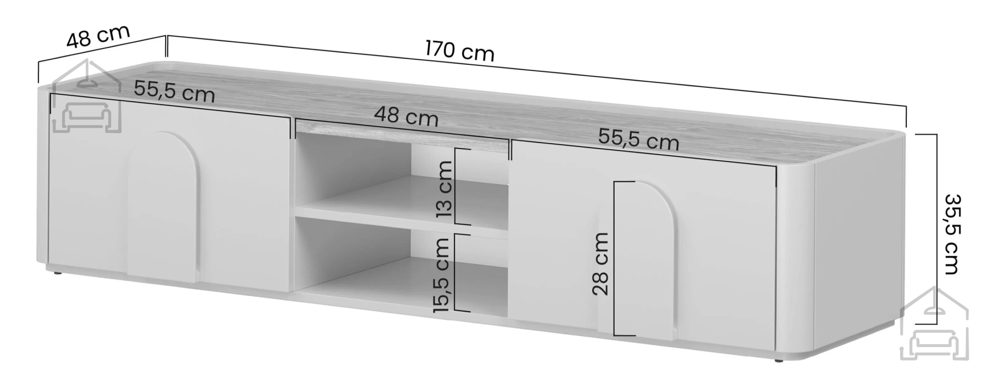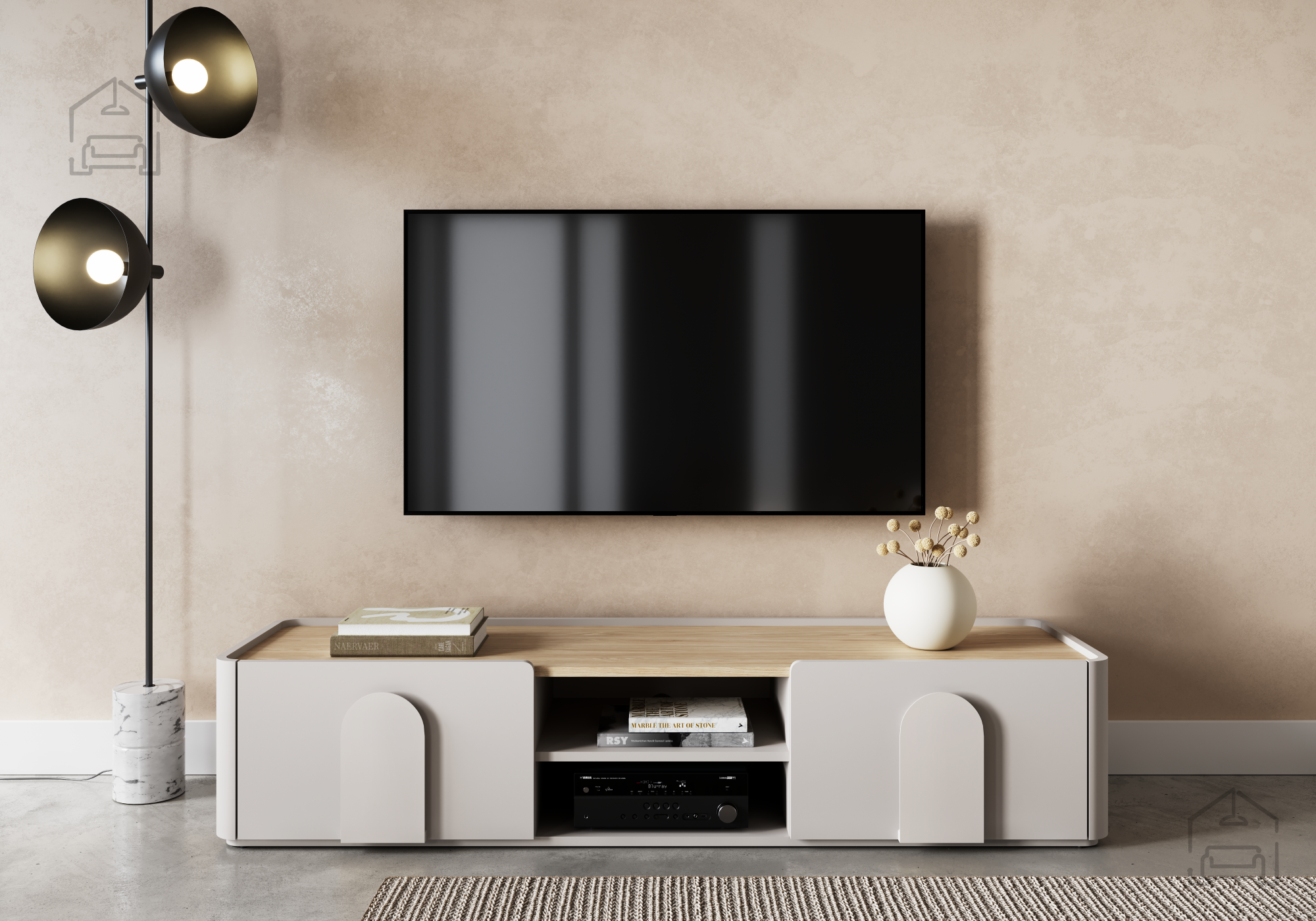 Auf der oberen Platte finden Fernseher, Lautsprecher oder persönliche Dekorationen wie Pflanzen, Kerzen oder Fotos ihren Platz. Dank ausgewogener Proportionen und einer dezenten Farbgebung dominiert die Kommode den Raum nicht, sondern ergänzt ihn harmonisch. Sanfte Linien und abgerundete Kanten vermitteln ein Gefühl von Sicherheit und optischer Weichheit.