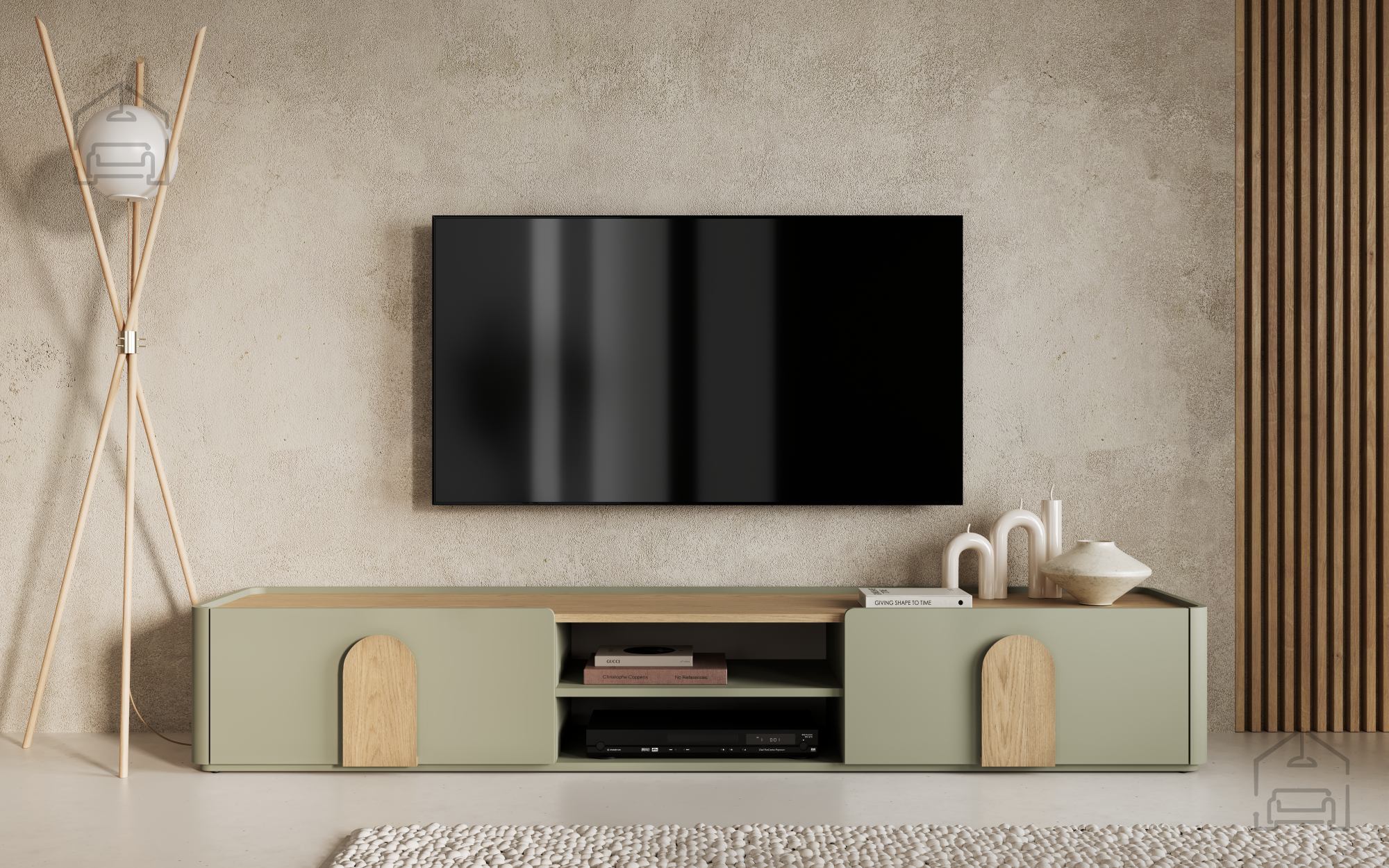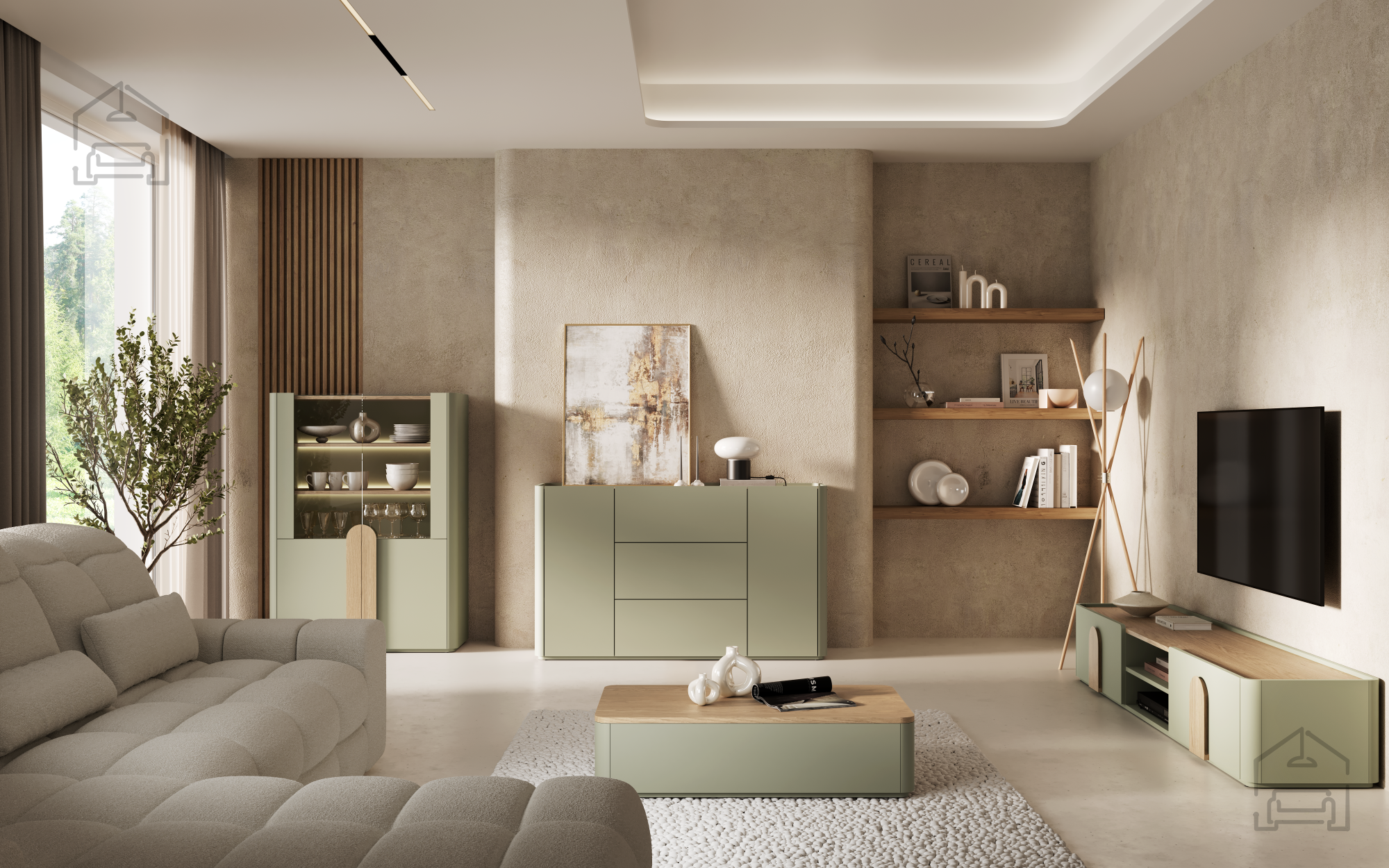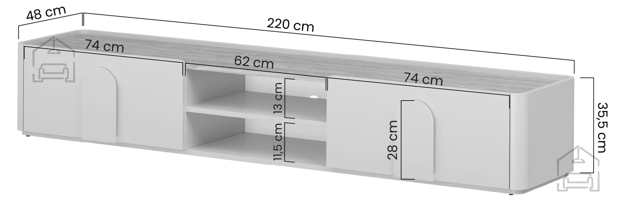 Die Verbindung moderner Linien mit natürlichen Holztönen macht dieses Modell besonders vielseitig. Es harmoniert wunderbar mit Einrichtungen im skandinavischen oder minimalistischen Stil, in denen Helligkeit und Schlichtheit im Vordergrund stehen. Die Kommode kann als zentrales Element im Wohnzimmer wirken oder mit weiteren Stücken derselben Kollektion kombiniert werden, um ein einheitliches Gesamtbild zu schaffen. Dank der Breite von 220 cm bleibt auf der oberen Platte genügend Platz für Dekoartikel, Pflanzen oder Familienfotos – ohne die Funktionalität einzuschränken.