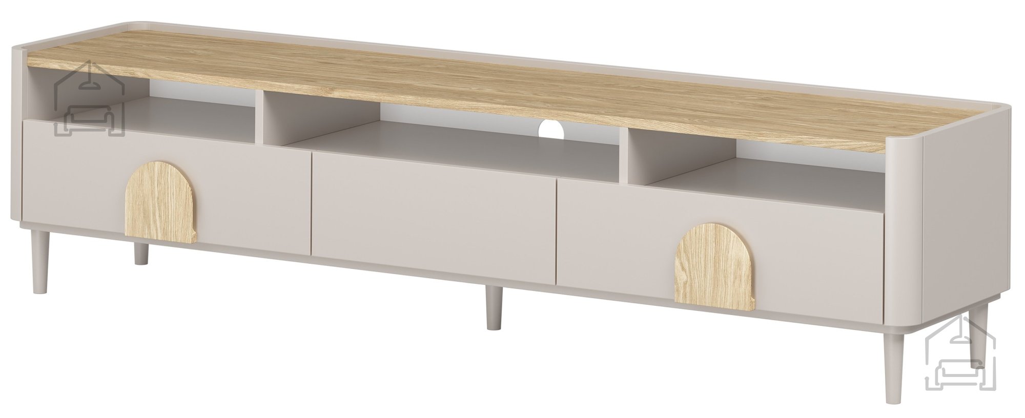 Die TV-Kommode Amilio 200 1K2SZ verkörpert den skandinavischen Minimalismus. Die sanfte Kombination aus Kaschmir und hellem Holz bringt Wärme und natürliche Harmonie in den Raum. Abgerundete Kanten verleihen dem Möbel ein weiches, wohnliches Erscheinungsbild. Dank der schlanken Holzfüße wirkt das Stück optisch leicht und fügt sich wunderbar in helle, offene Wohnräume ein.