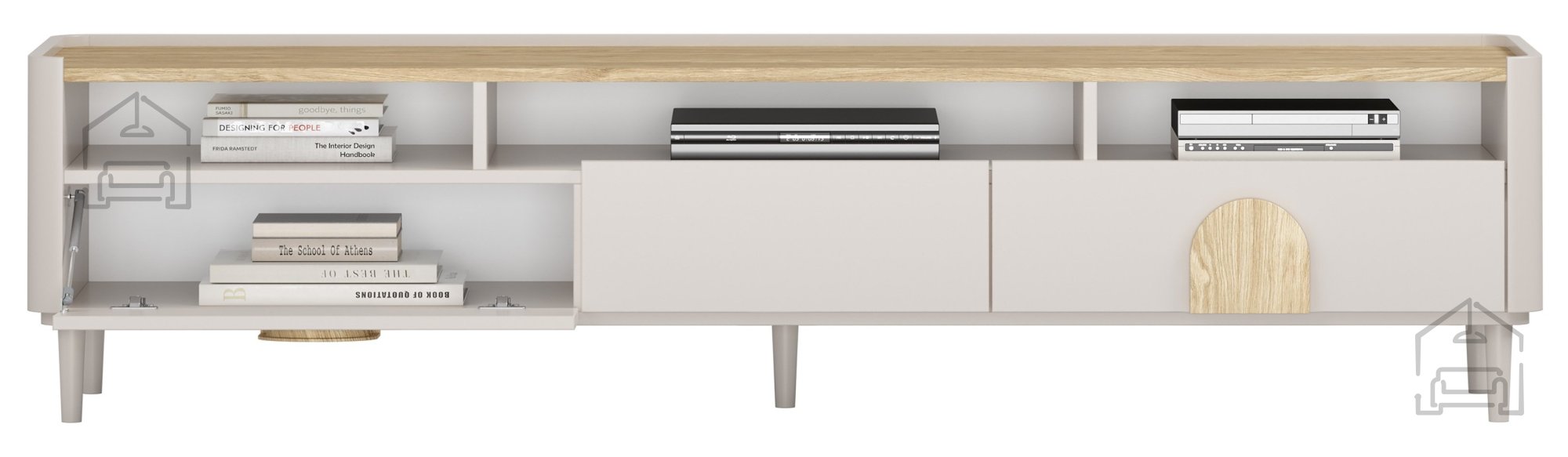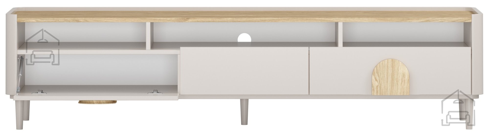 Die TV-Kommode Amilio 200 1K2SZ vereint skandinavische Schlichtheit, die Wärme von Naturholz und moderne Funktionalität. Die Oberfläche im sanften Ton Kaschmir wird durch eine warm geölte Eichenplatte und Griffe aus hellem Eichenholz ergänzt – zusammen entsteht ein harmonisches Gesamtbild, das perfekt zu hellen, natürlichen und minimalistischen Wohnstilen passt. Mit einer Höhe von 48 cm und einer Länge von 200 cm bietet sie Platz für große Fernseher und wirkt dank ihrer schlanken Bauweise dennoch leicht und luftig.