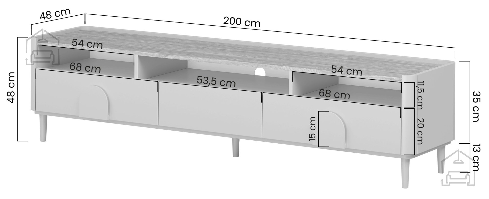 Der Korpus besteht aus einer 18 mm starken melaminbeschichteten Platte und MDF-Platten, was für hohe Stabilität und Widerstandsfähigkeit im Alltag sorgt. Buchenfüße in Kaschmirfarbe mit einer Höhe von 13 cm heben das Möbelstück leicht vom Boden ab und erleichtern das Reinigen darunter. Die Oberflächen sind mit ABS-Kanten mit abgerundeten Abschlüssen versehen – das erhöht die Sicherheit und schützt die Kanten vor Beschädigungen.