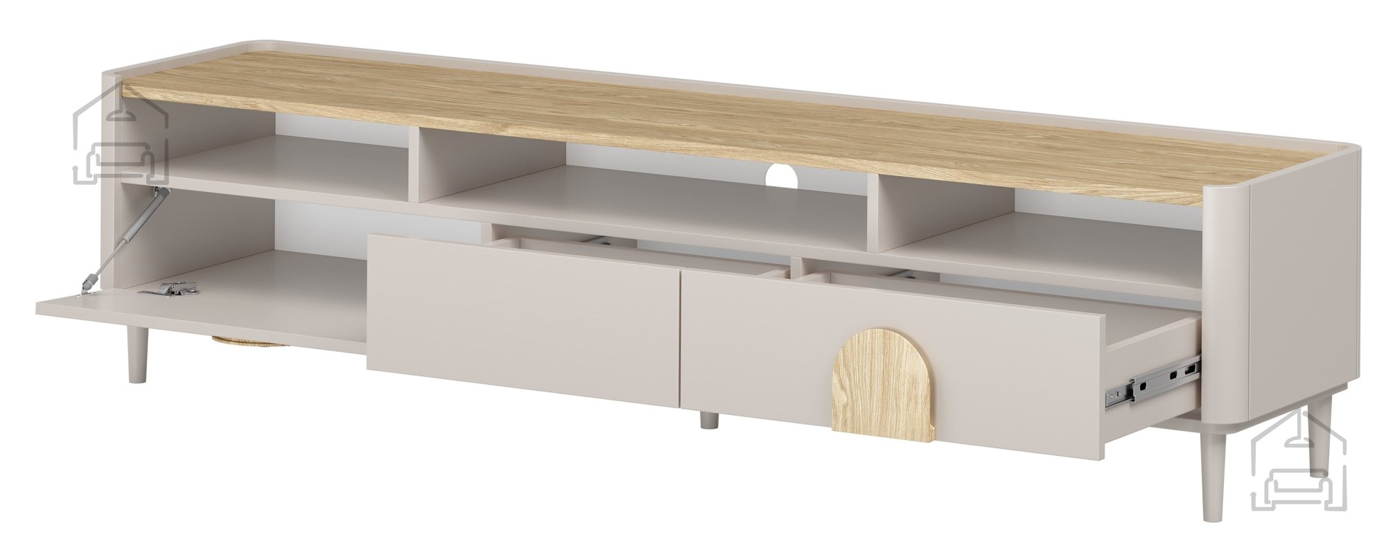 Die Kommode überzeugt durch eine durchdachte Aufteilung des Stauraums und Details, die den Alltag erleichtern. Im Inneren befinden sich zwei geräumige Schubladen auf Kugelführungsschienen, die ein leises und sanftes Gleiten ermöglichen. Der Soft-Close-Mechanismus verhindert ein abruptes Zuschlagen und verlängert die Lebensdauer des Möbels. Zusätzlich gibt es drei offene Fächer sowie eine praktische Klappe für Zubehör oder Dokumente.