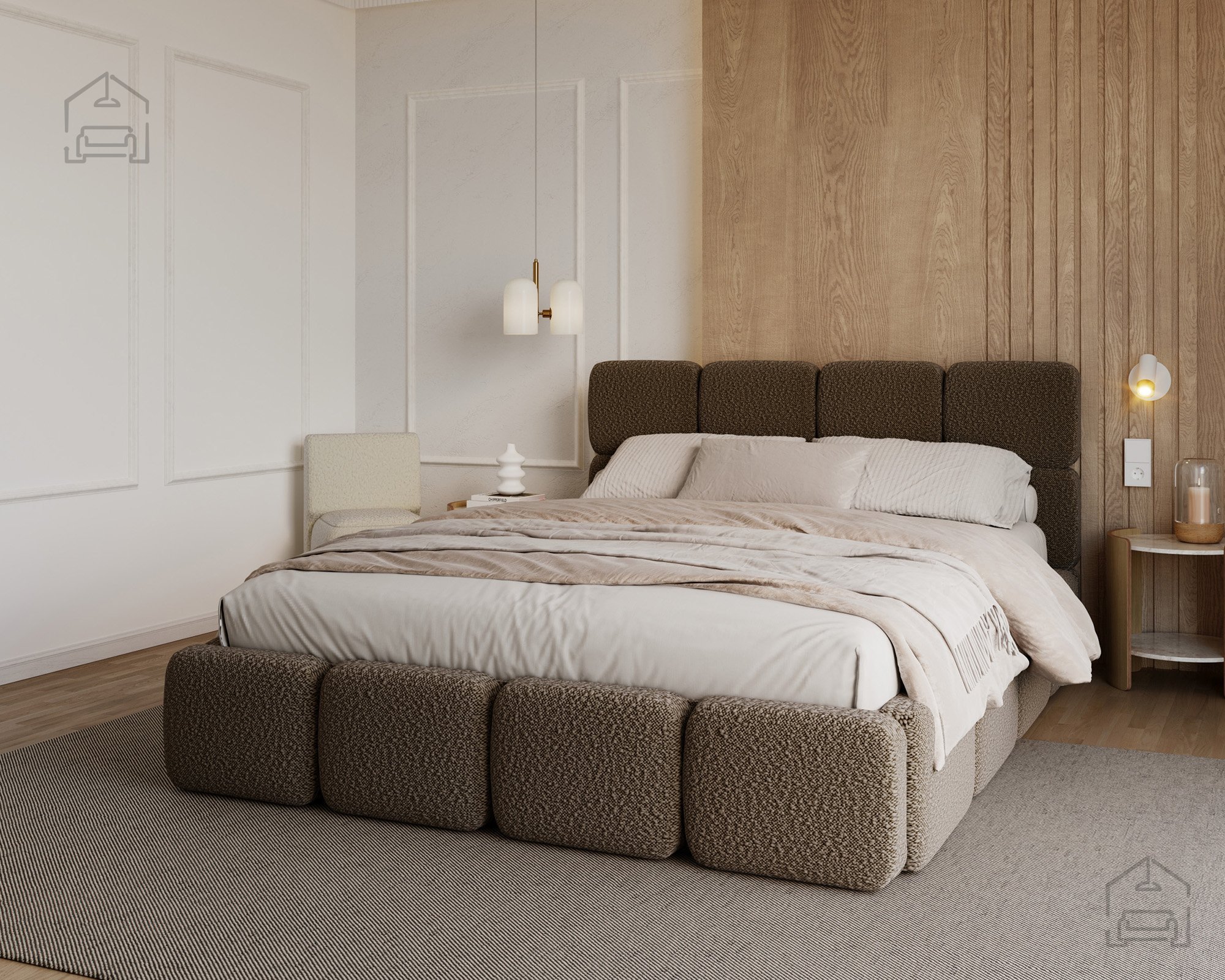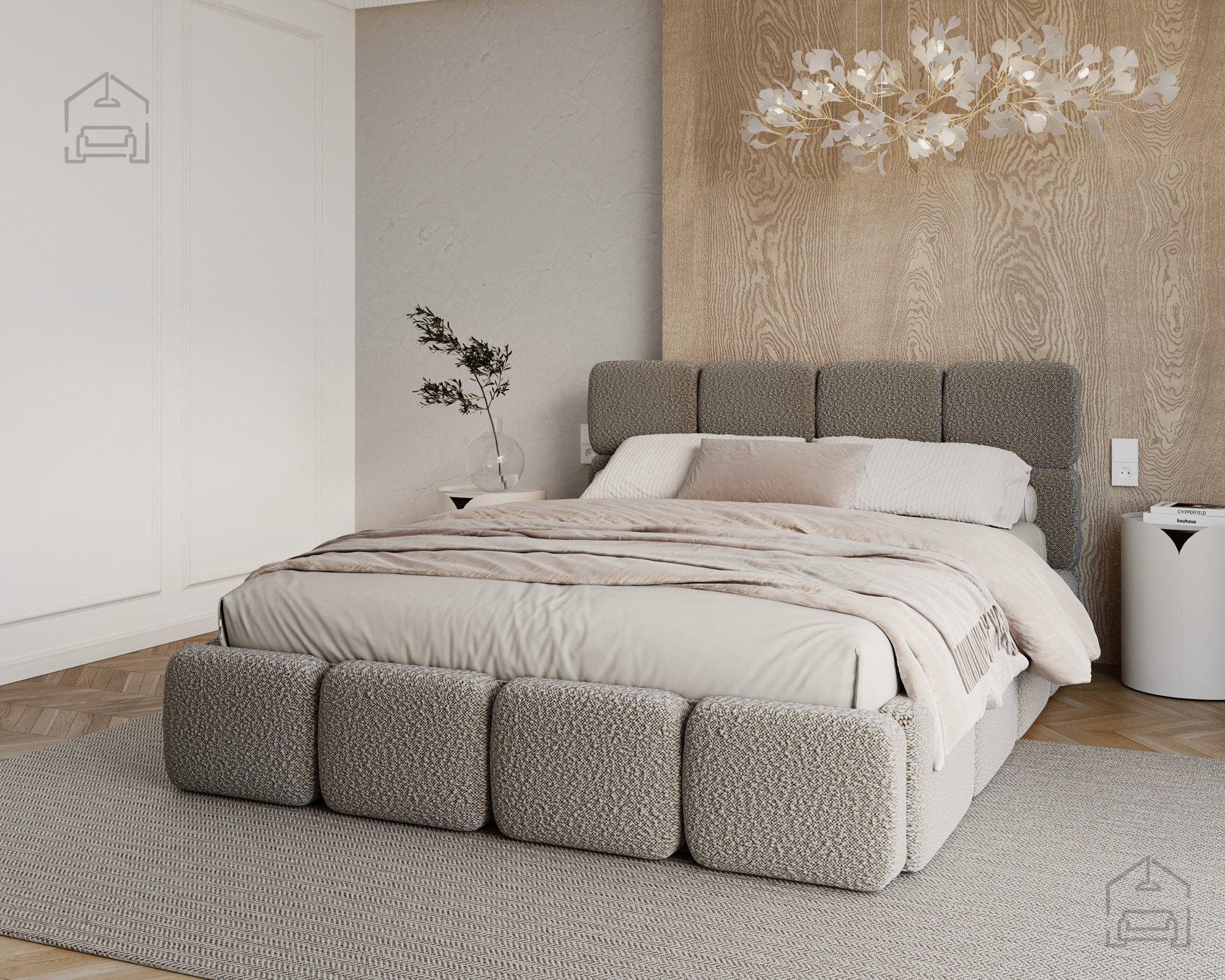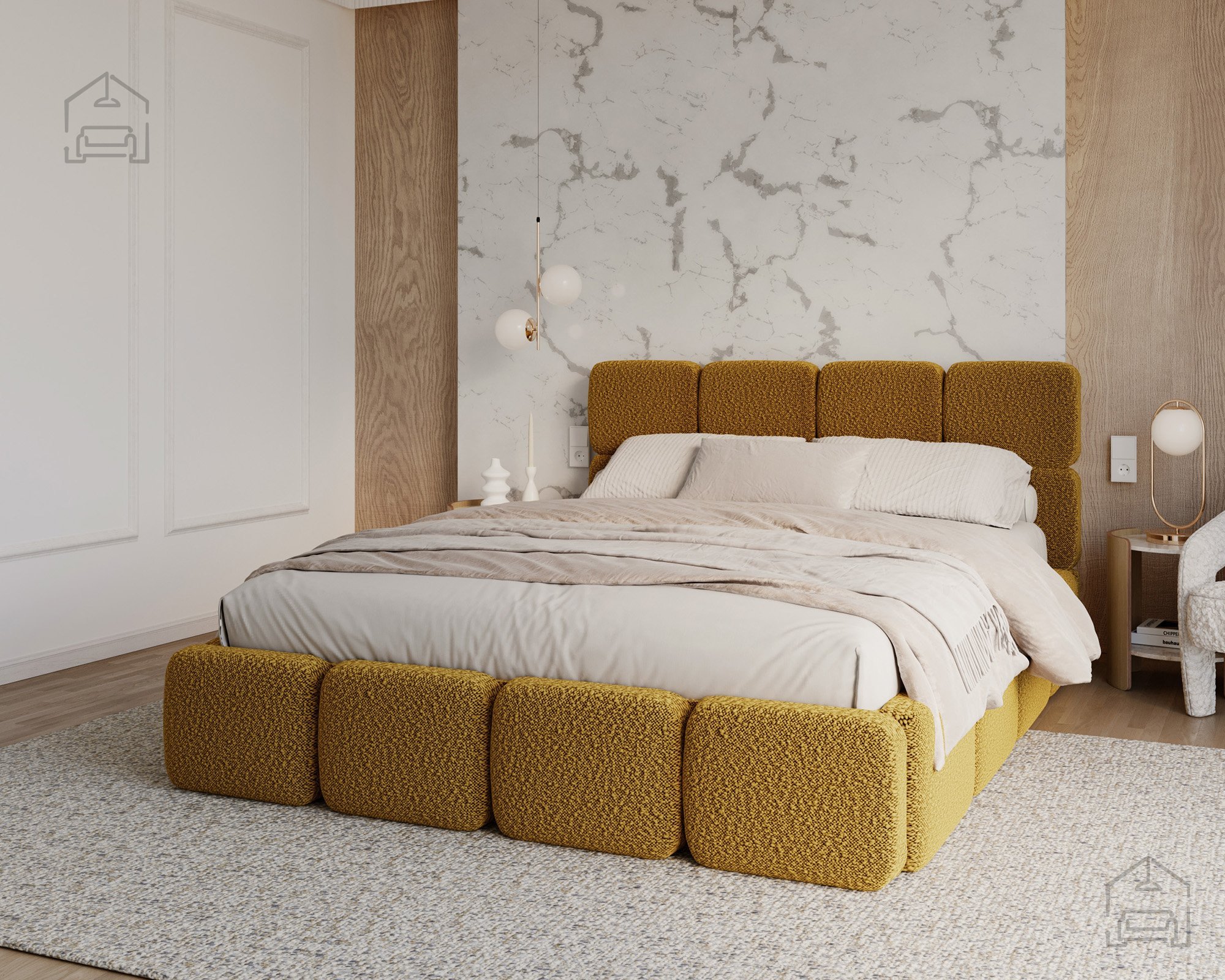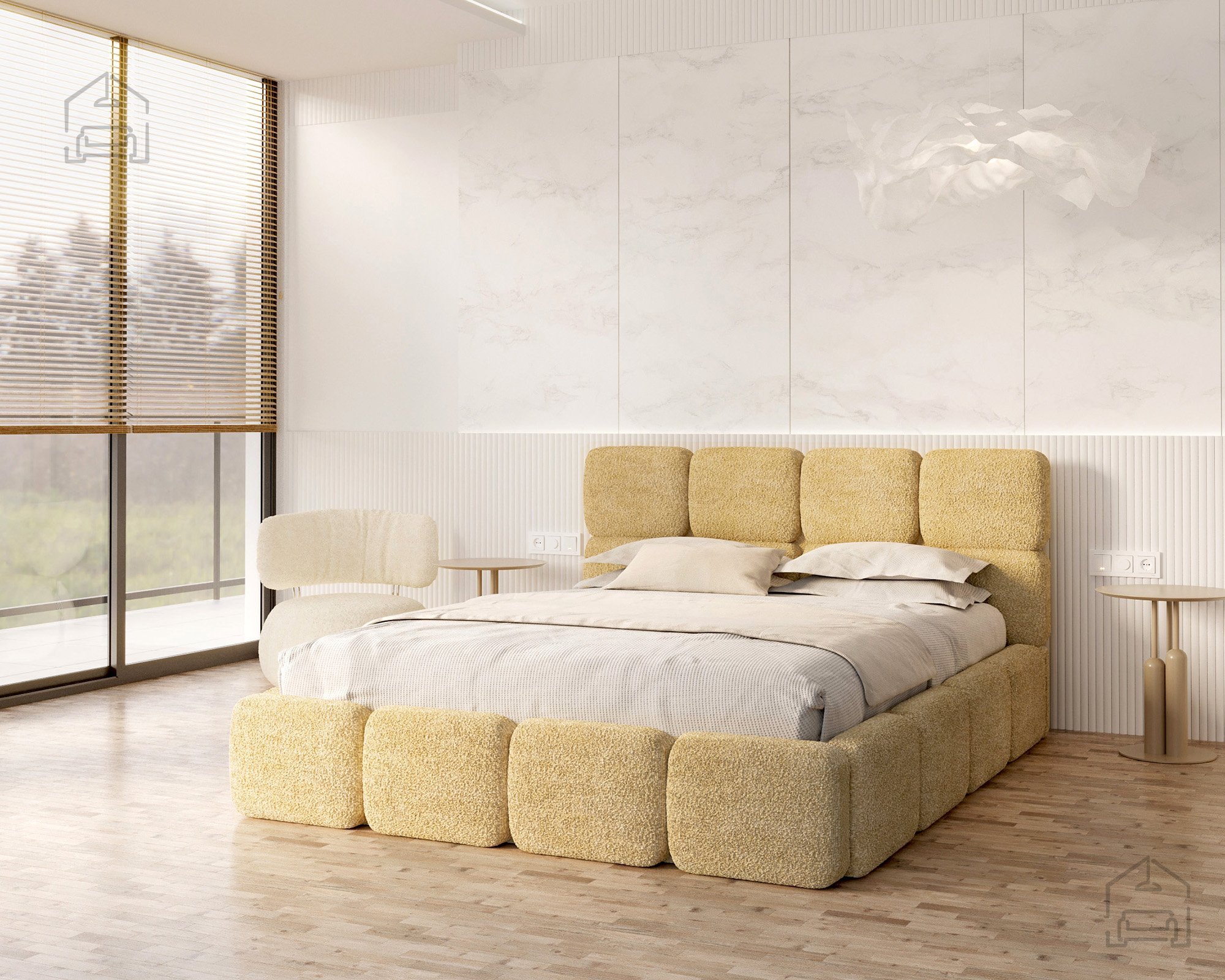 Die Basis des Bettes besteht aus Spanplatte und Holz, was Stabilität und Langlebigkeit gewährleistet. Die Polsterung aus T-25-Schaumstoff bietet genau die richtige Balance zwischen Komfort und Elastizität und behält ihre Form auch bei längerer Nutzung. Der gepolsterte Rahmen ist mit dem Stoff Cleo Honey bezogen, der sich angenehm weich anfühlt und widerstandsfähig gegen Abnutzung ist. Die warmen Farbtöne und Strukturen schaffen eine gemütliche Atmosphäre, in der man sich Tag für Tag wohlfühlt.