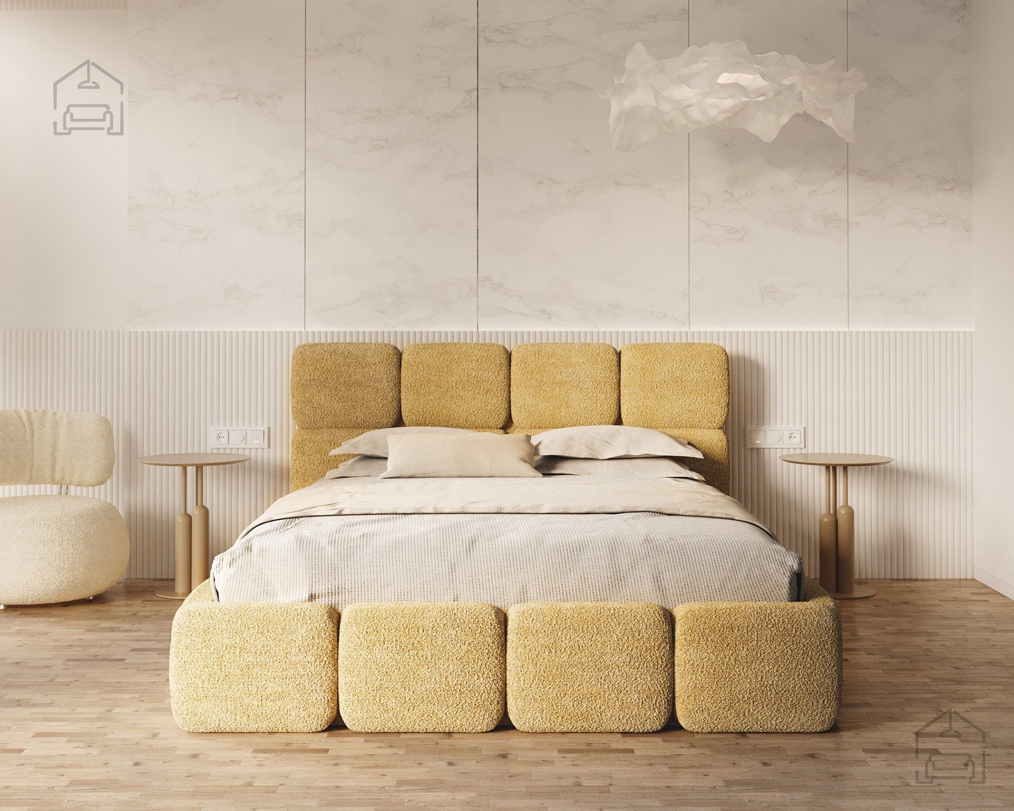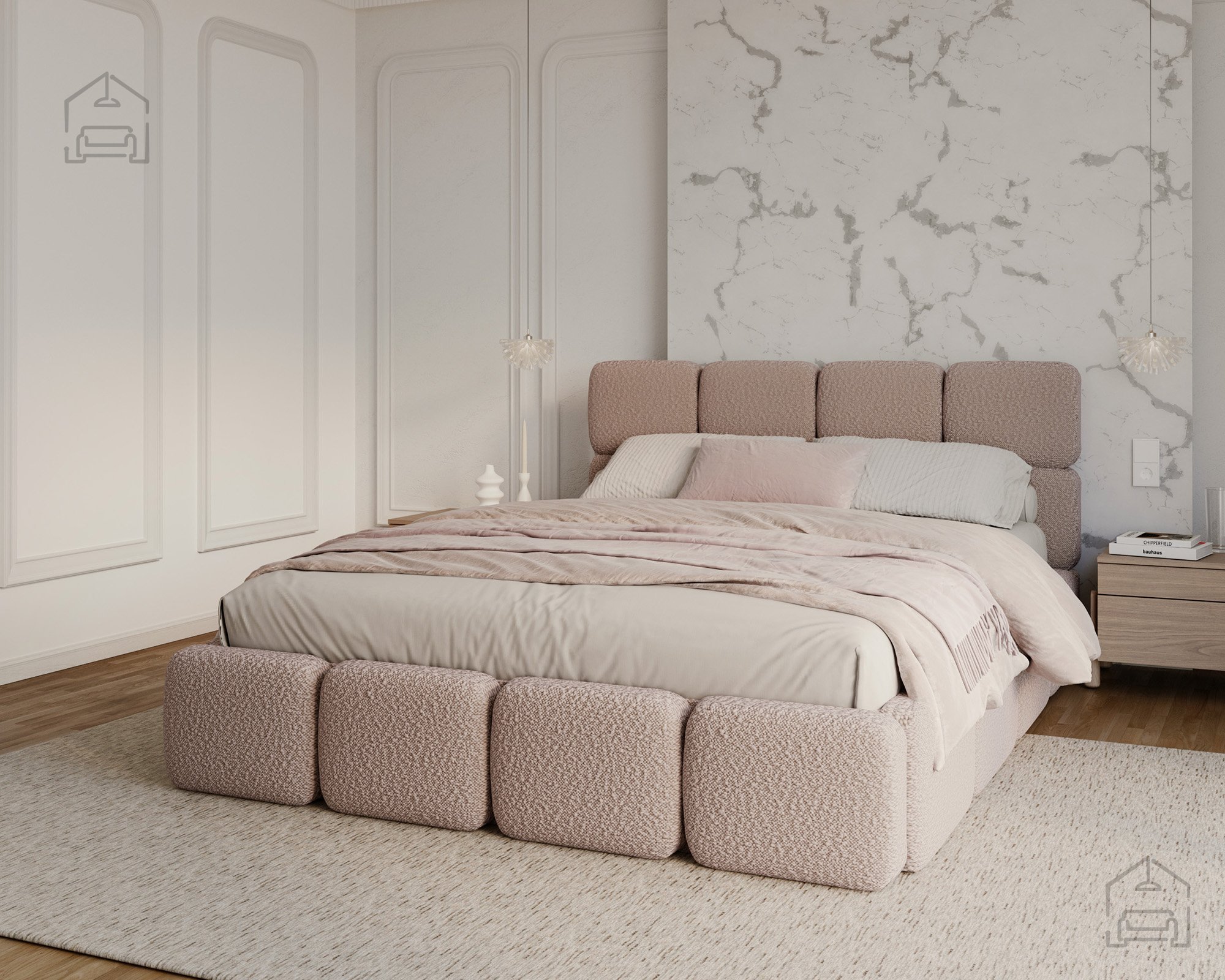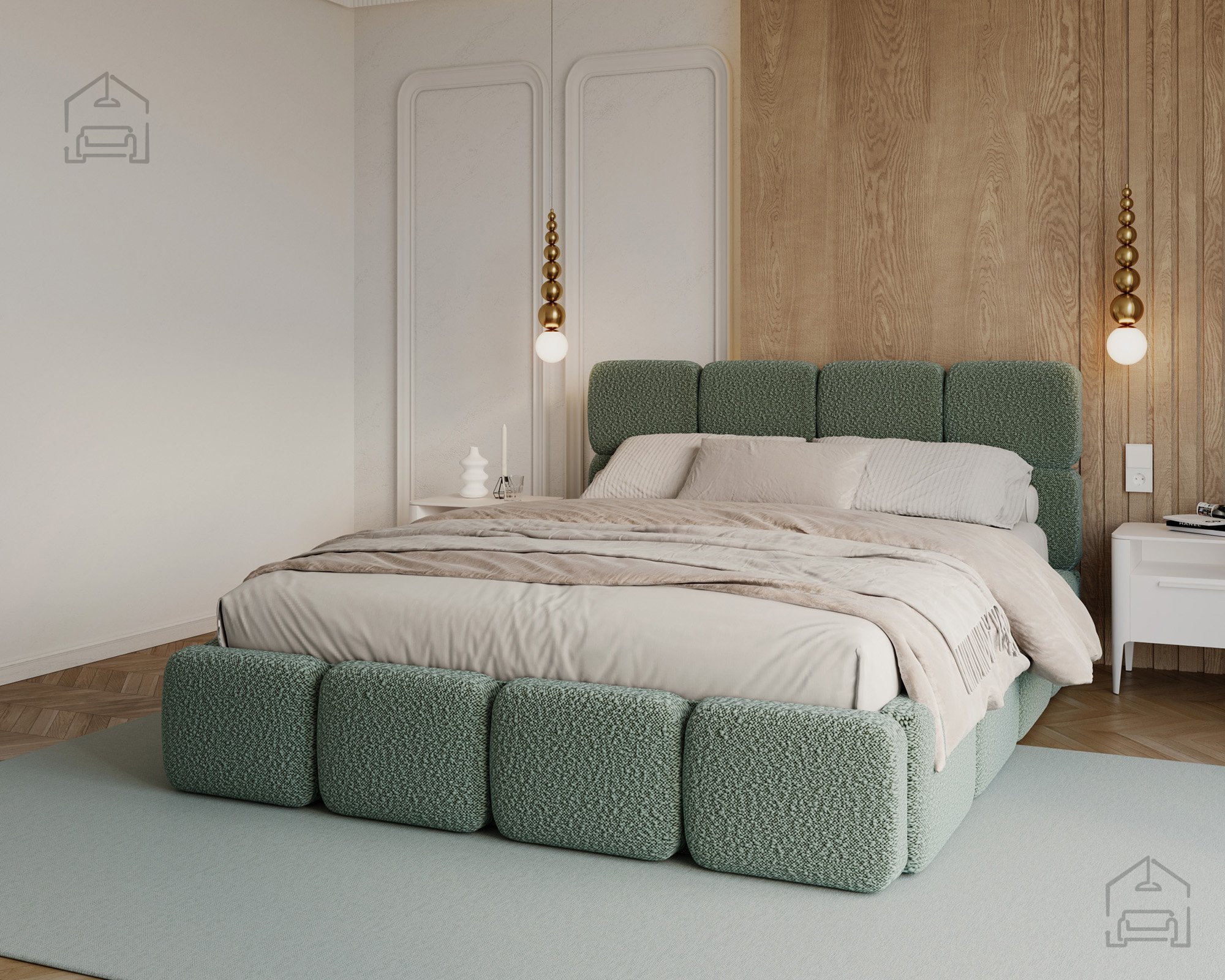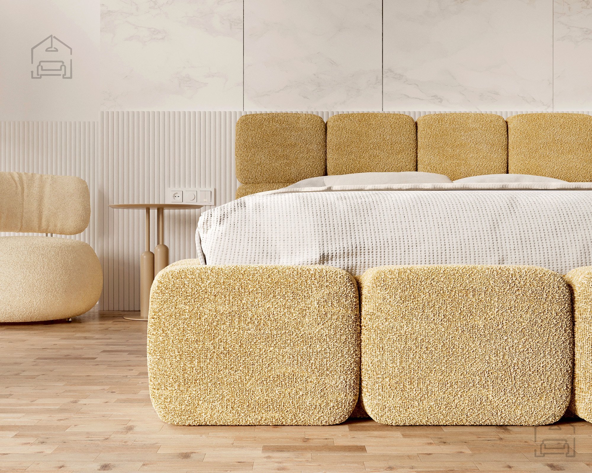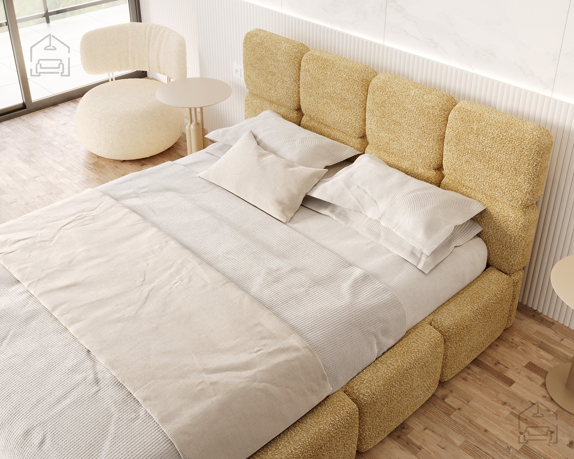 Die Basis des Bettes besteht aus Spanplatte und Holz, was Stabilität und Langlebigkeit gewährleistet. Die Polsterung aus T-25-Schaumstoff bietet genau die richtige Balance zwischen Komfort und Elastizität und behält ihre Form auch bei längerer Nutzung. Der gepolsterte Rahmen ist mit dem Stoff Cleo Honey bezogen, der sich angenehm weich anfühlt und widerstandsfähig gegen Abnutzung ist. Die warmen Farbtöne und Strukturen schaffen eine gemütliche Atmosphäre, in der man sich Tag für Tag wohlfühlt.