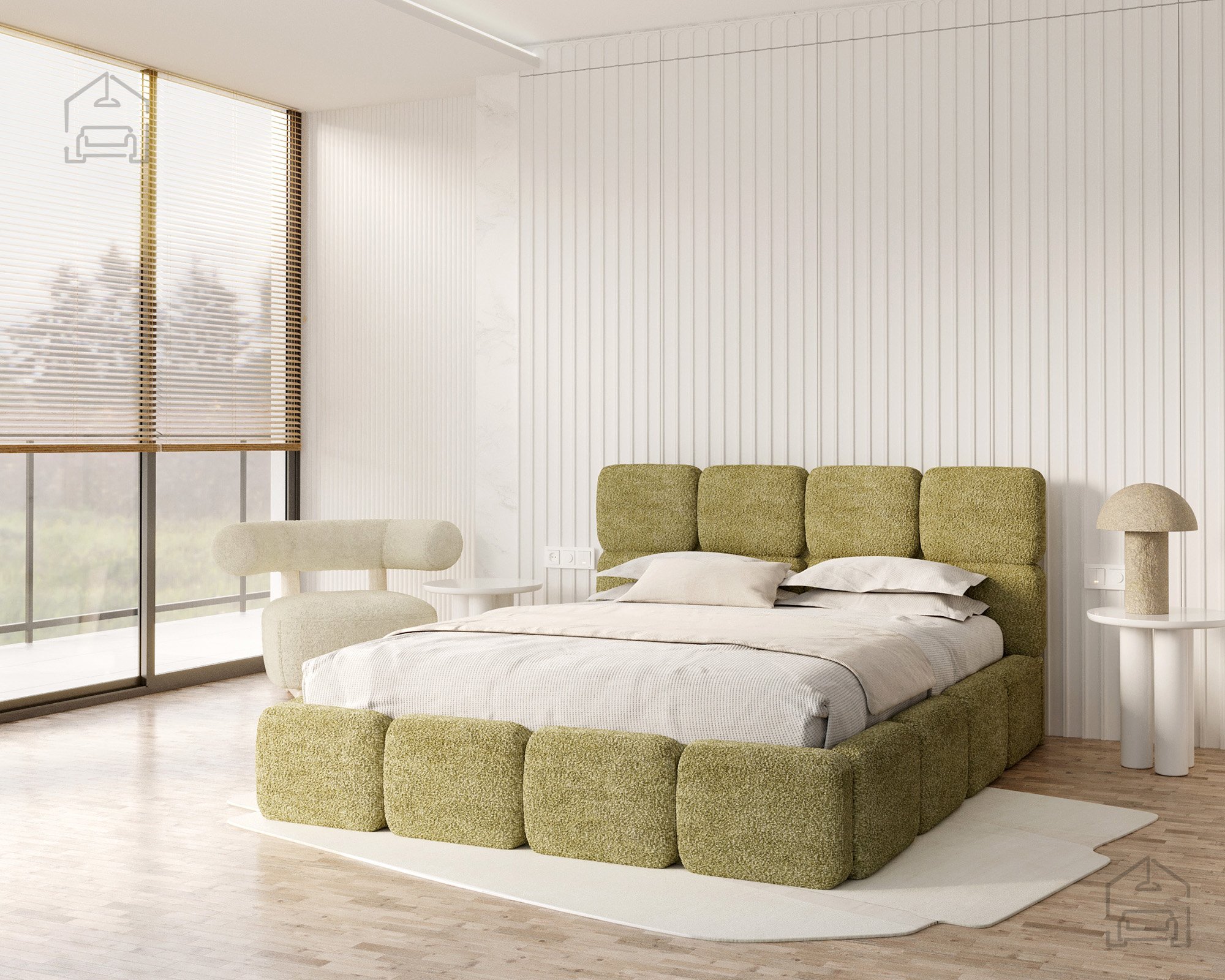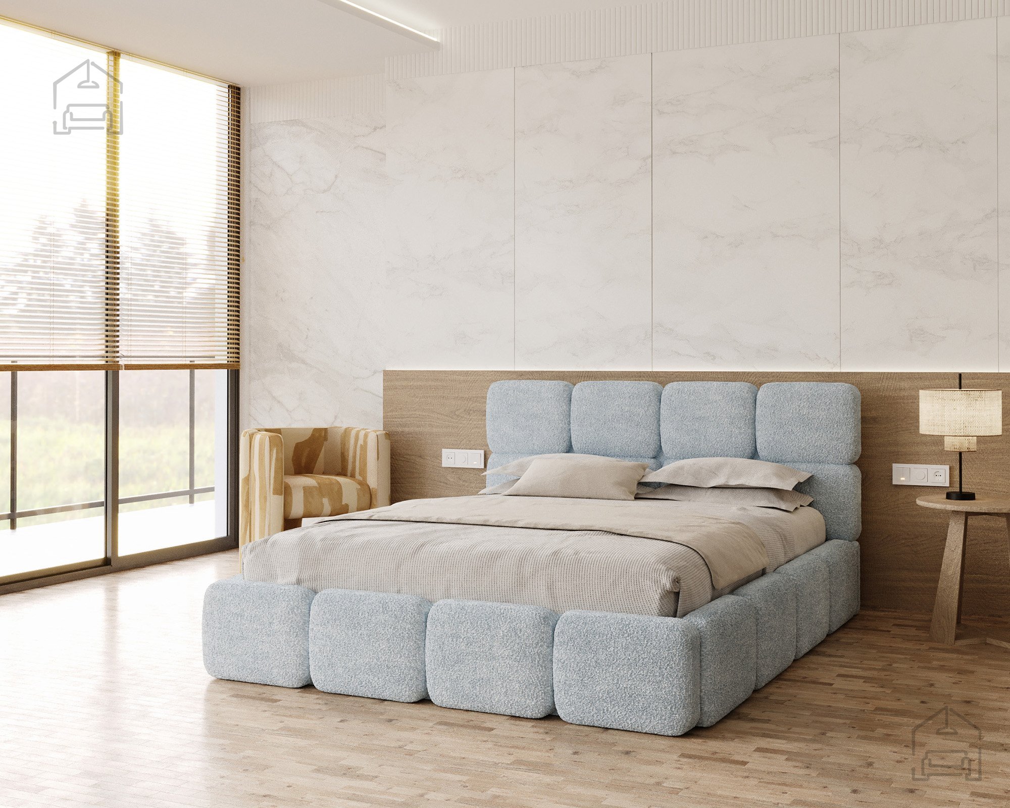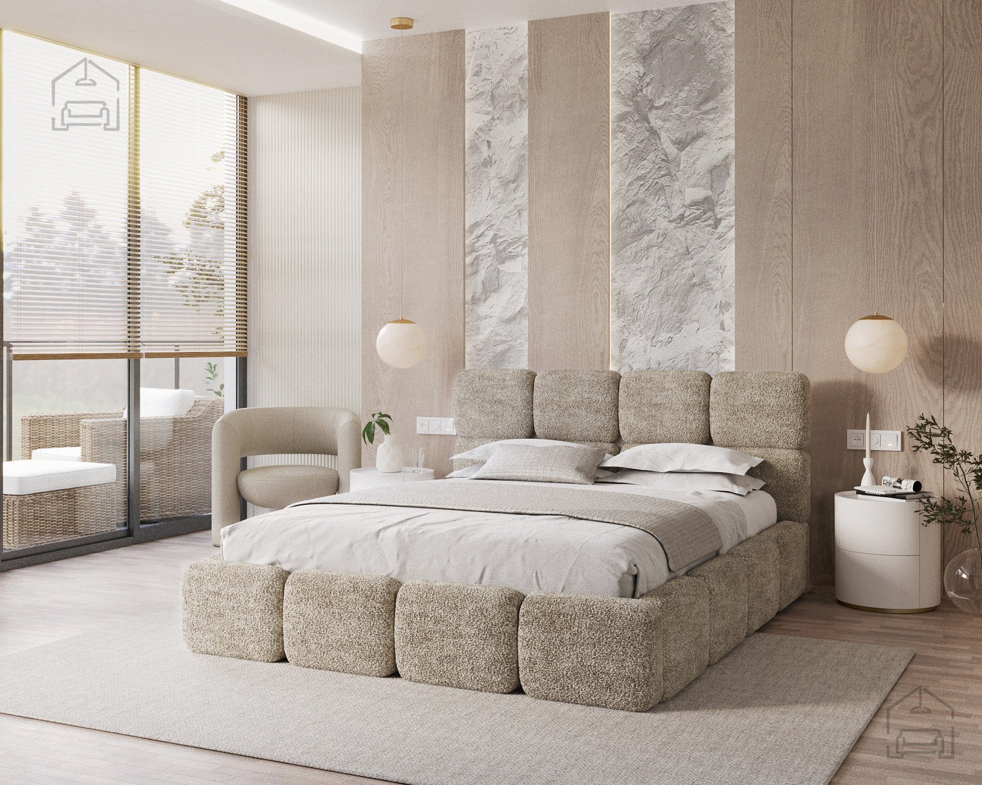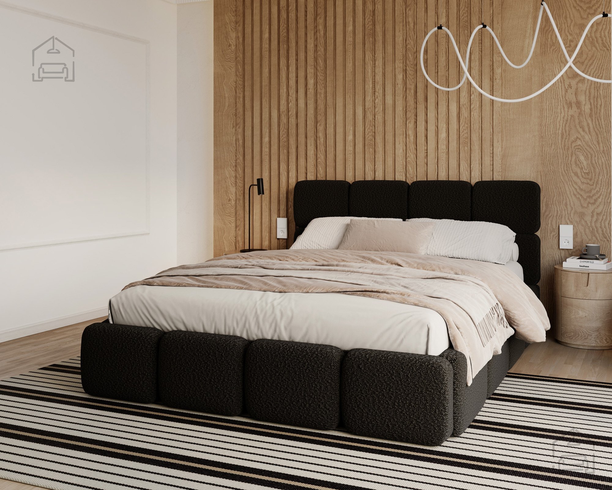 Die Basis des Bettes besteht aus Spanplatte und Holz, was Stabilität und Langlebigkeit gewährleistet. Die Polsterung aus T-25-Schaumstoff bietet genau die richtige Balance zwischen Komfort und Elastizität und behält ihre Form auch bei längerer Nutzung. Der gepolsterte Rahmen ist mit dem Stoff Cleo Honey bezogen, der sich angenehm weich anfühlt und widerstandsfähig gegen Abnutzung ist. Die warmen Farbtöne und Strukturen schaffen eine gemütliche Atmosphäre, in der man sich Tag für Tag wohlfühlt.