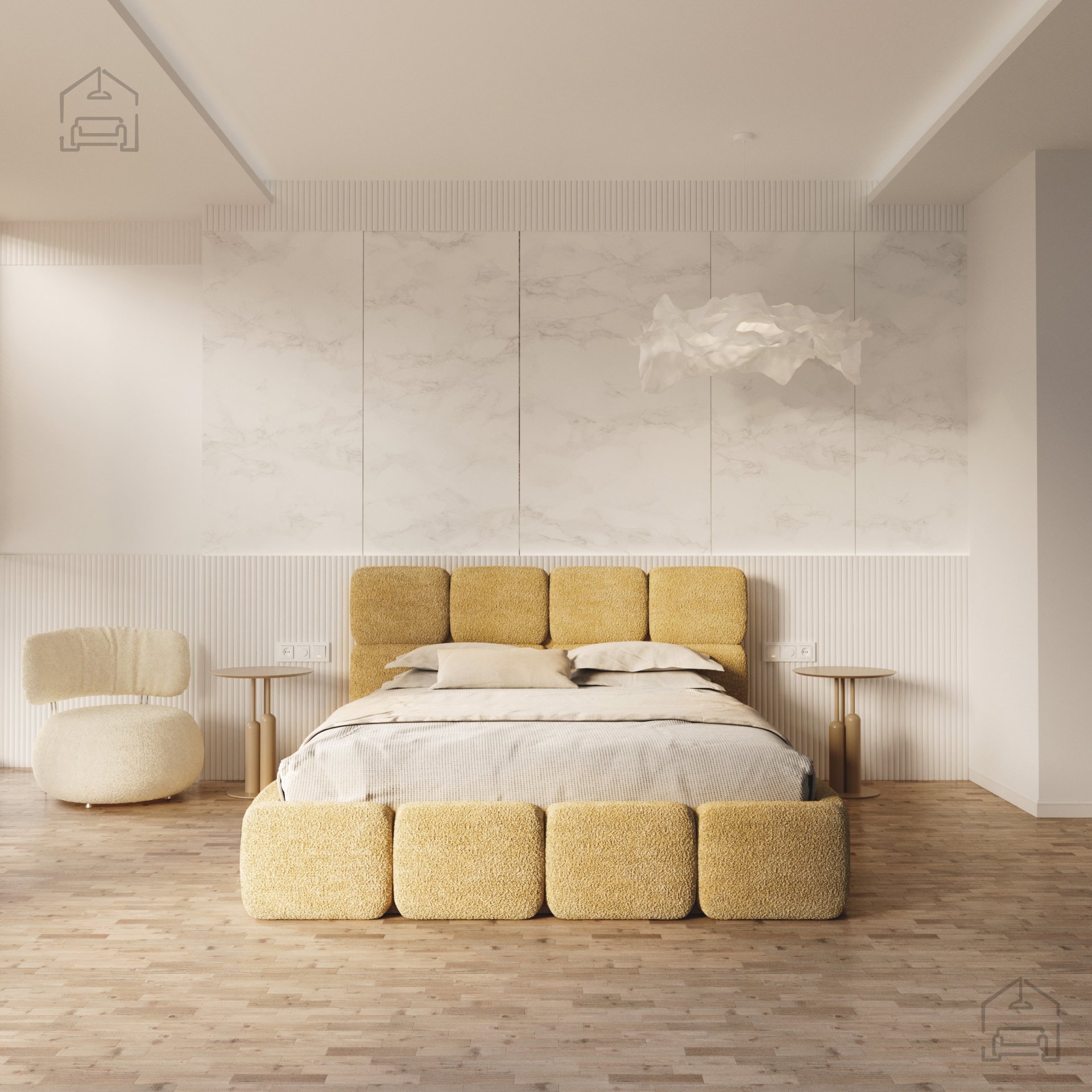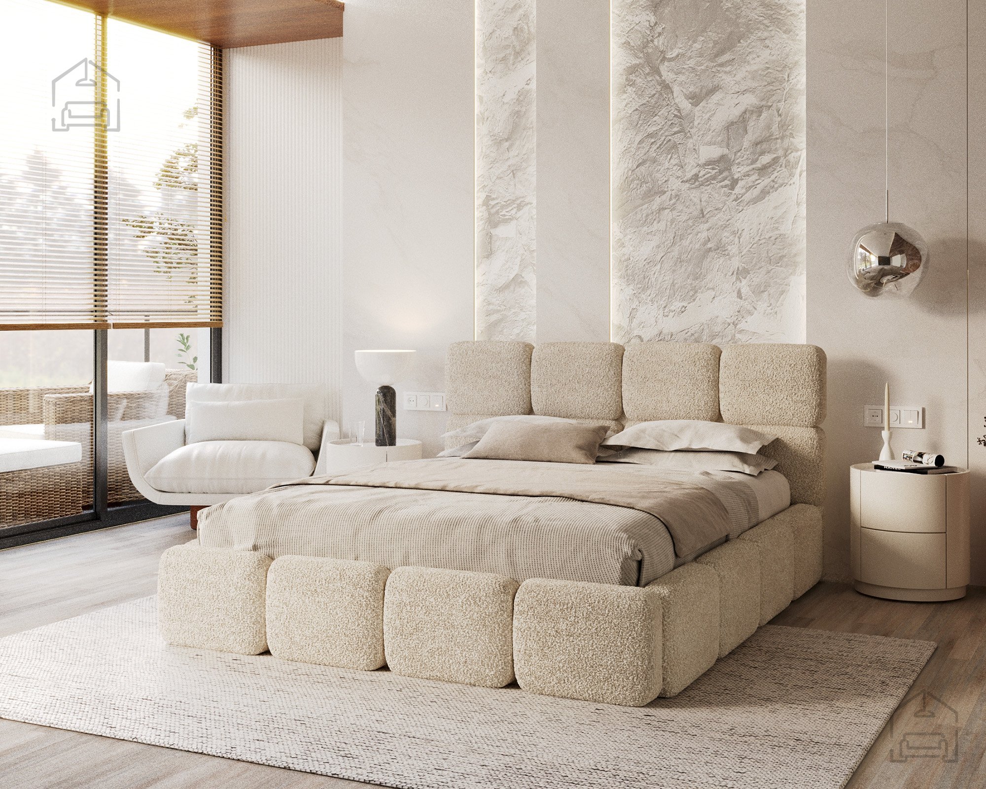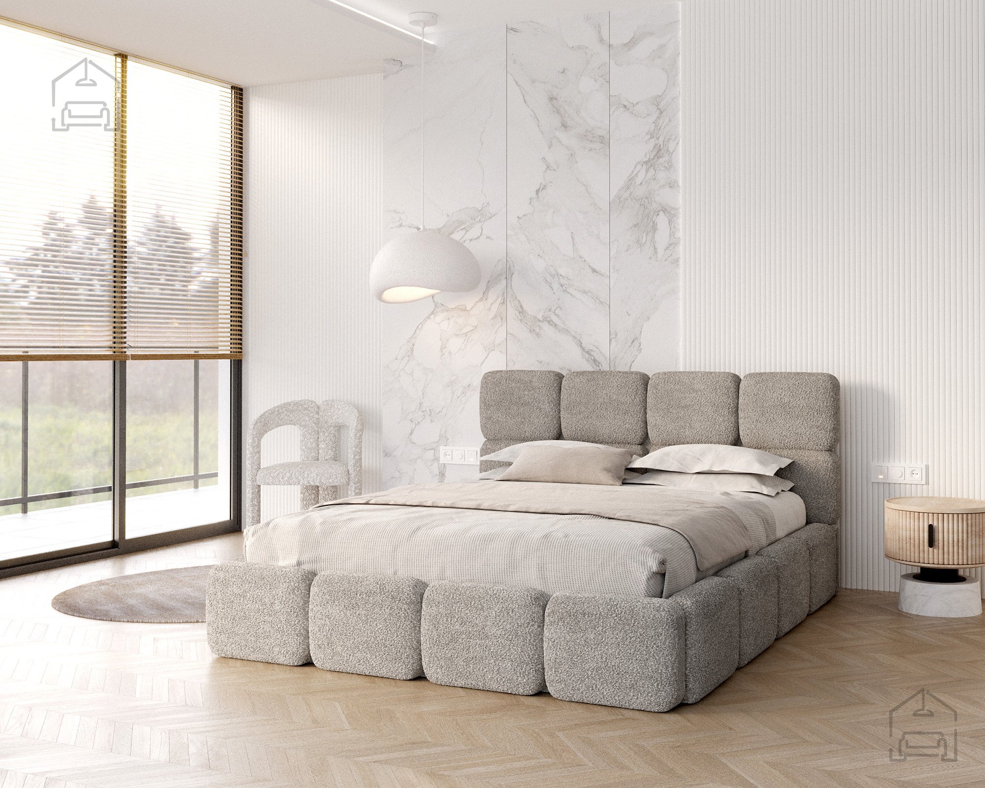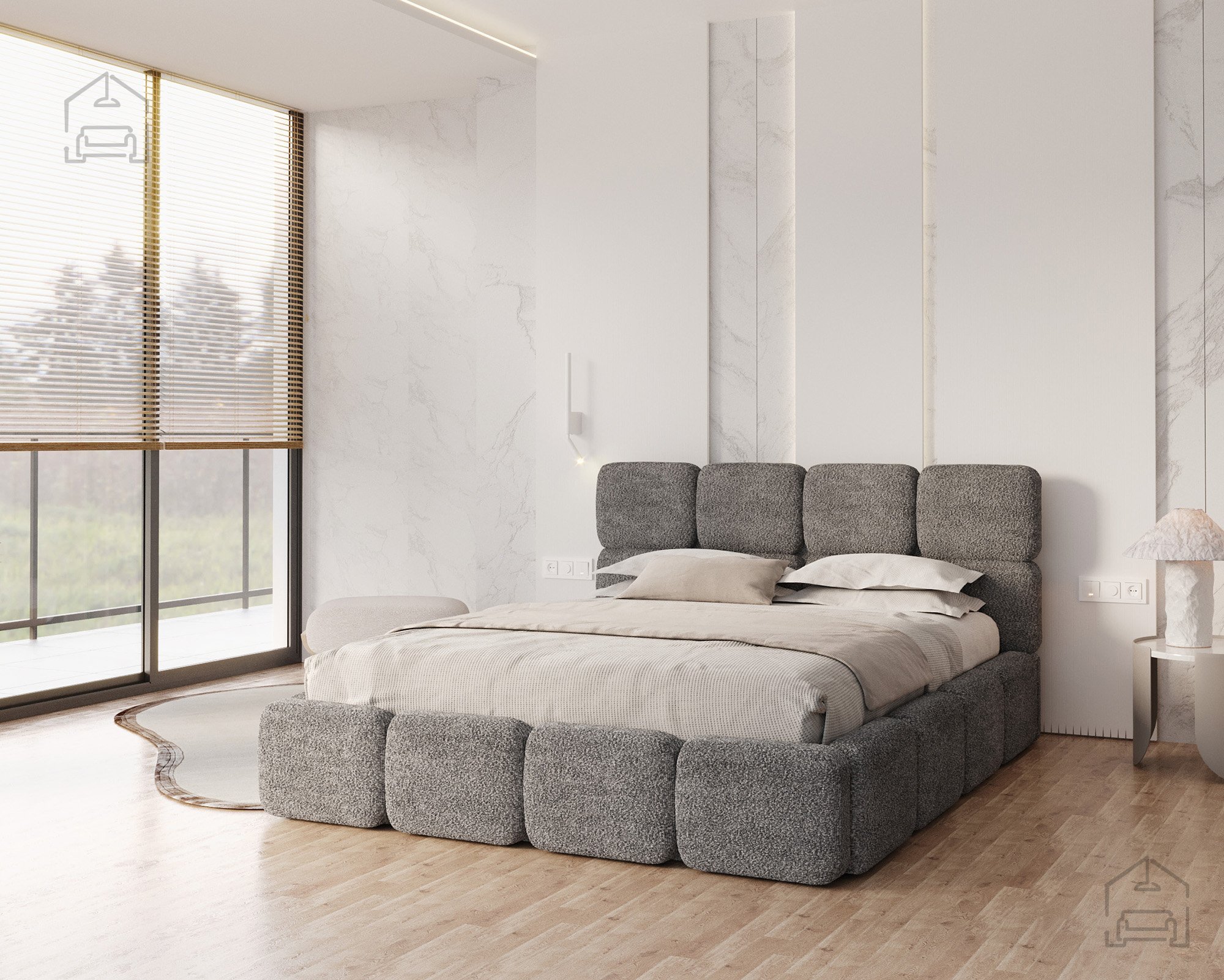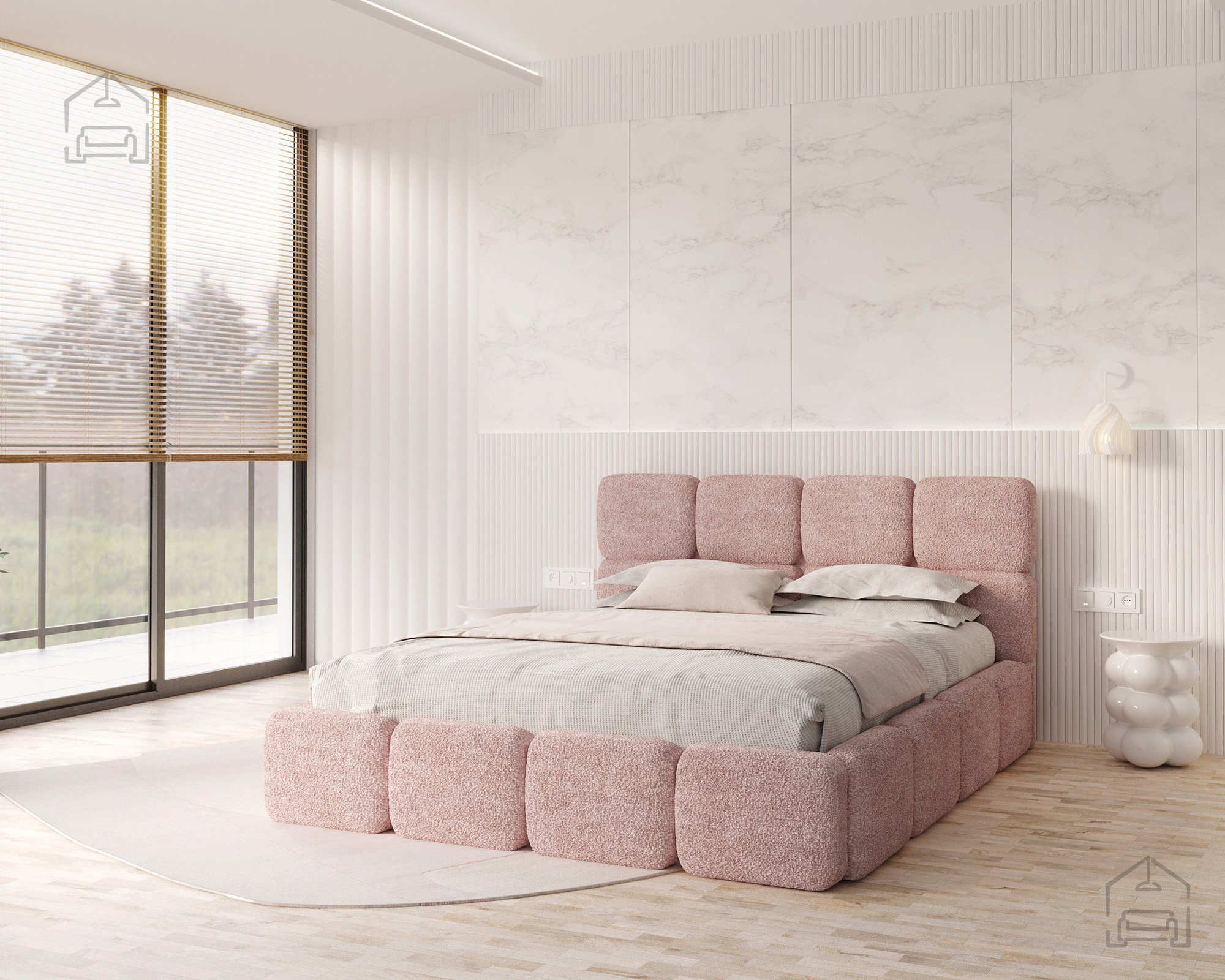 Die Basis des Bettes besteht aus Spanplatte und Holz, was Stabilität und Langlebigkeit gewährleistet. Die Polsterung aus T-25-Schaumstoff bietet genau die richtige Balance zwischen Komfort und Elastizität und behält ihre Form auch bei längerer Nutzung. Der gepolsterte Rahmen ist mit dem Stoff Cleo Honey bezogen, der sich angenehm weich anfühlt und widerstandsfähig gegen Abnutzung ist. Die warmen Farbtöne und Strukturen schaffen eine gemütliche Atmosphäre, in der man sich Tag für Tag wohlfühlt.