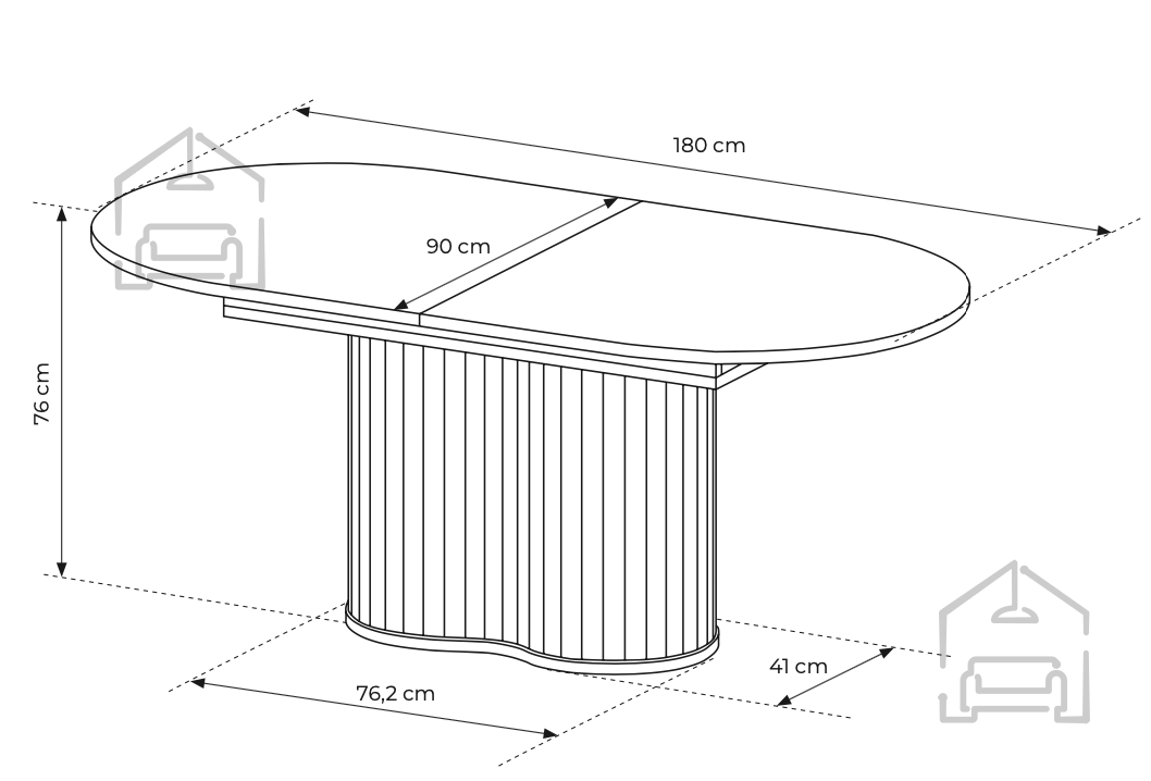 Die Grundmaße des Tisches betragen 180 × 90 × 76 cm, was bequem Platz für sechs Personen bietet. Mit dem praktischen Ausziehmechanismus lässt sich die Länge auf 220 cm erweitern – ideal, wenn Sie einmal mehr Gäste empfangen. Der Ausziehmechanismus ist so konstruiert, dass er einfach und schnell zu bedienen ist: Die Erweiterungsplatte lässt sich elegant einfügen, wenn sie gebraucht wird, und verschwindet unauffällig, wenn nicht.